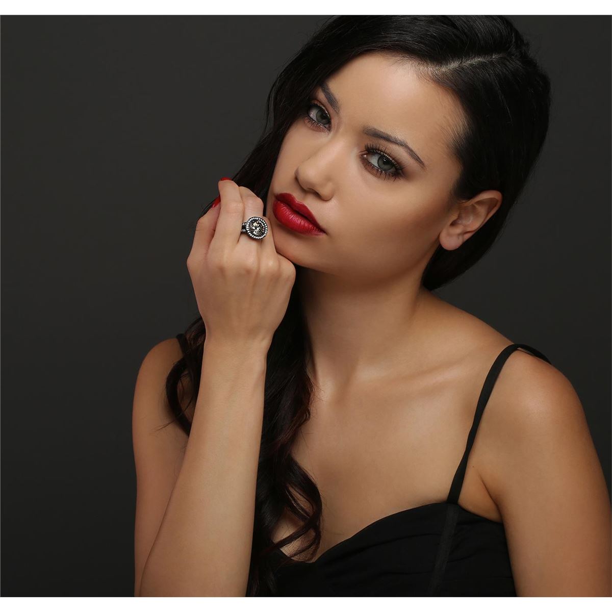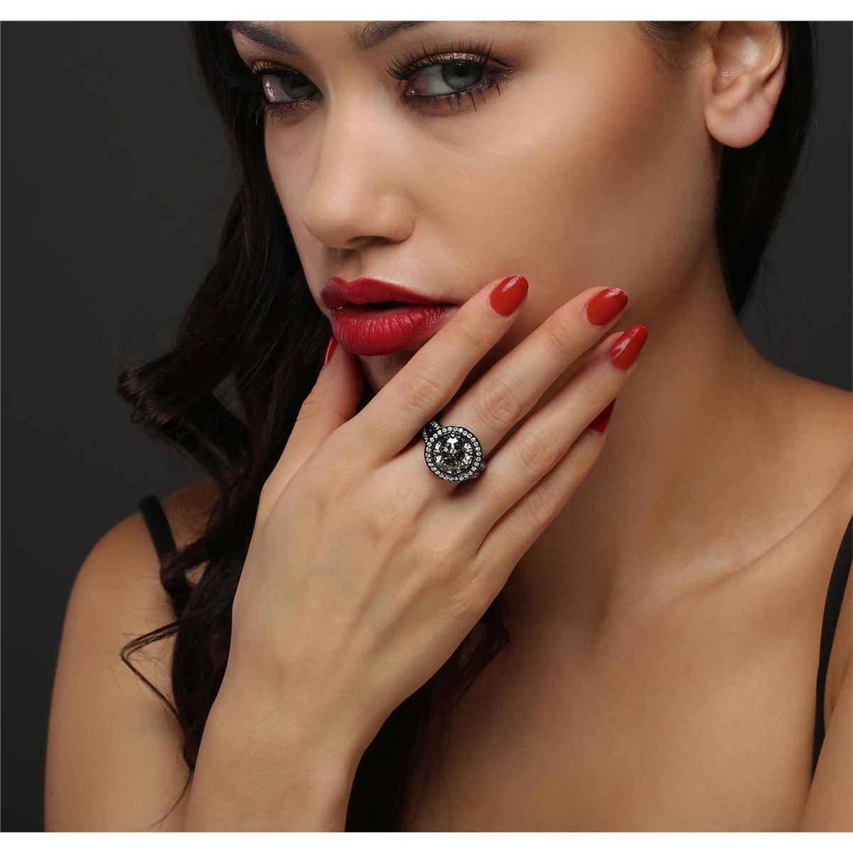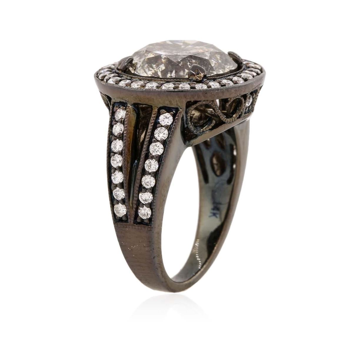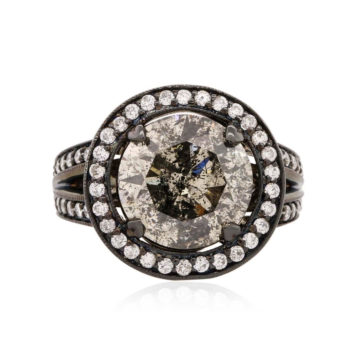 One electronically tested 14KT white gold ladies cast diamond ring. The featured diamond is set within a diamond bezel supported by diamond set split shoulders, completed by a two millimeter wide band. Anodized finish with milgrain detailing throughout. Identified with markings of "14K". Condition is new, good workmanship. Containing: One prong set round brilliant cut diamond, measuring 11.70 - 11.65 x 7.45mm (depth est.) approximate weight of 6.29ct with a medium yellow fluorescence. Graded in the setting. Clarity: I-2. Depth: 63.8%. Table 61.6%. Sixty prong set round brilliant cut diamonds, measuring 1.60 - 1.50 x 0.93mm (depth est.) approximate total weight of 60 Stones = 1.00ct. Graded in the setting. Clarity: SI-2 to I-1. Color: G - I. Total Weight of Diamonds 7.29ct. Total Weight of Ring 10.29 grams. AIG Appraised at $62,210.00.