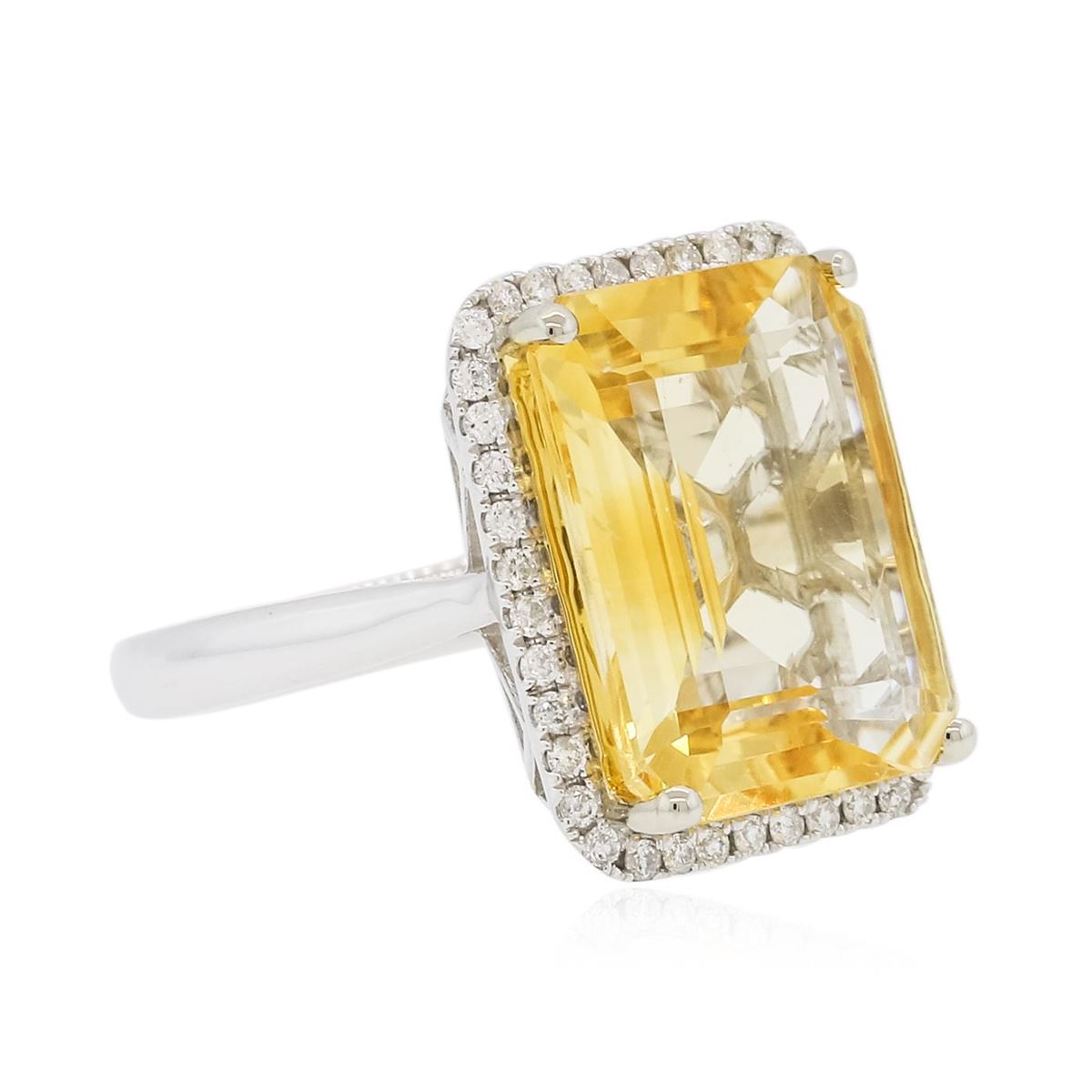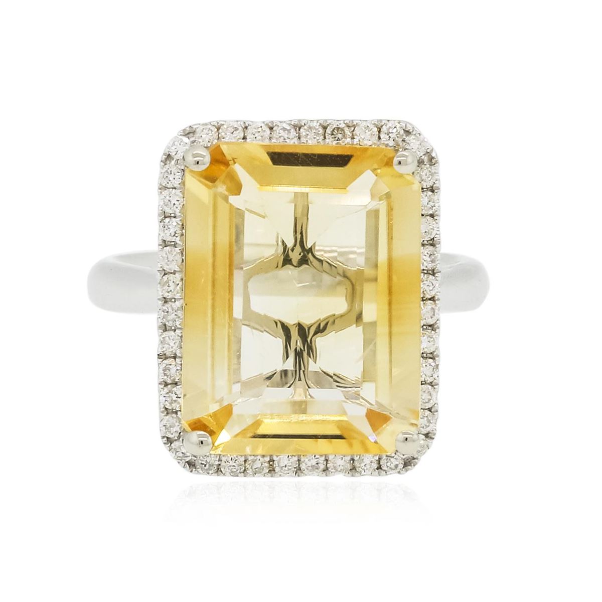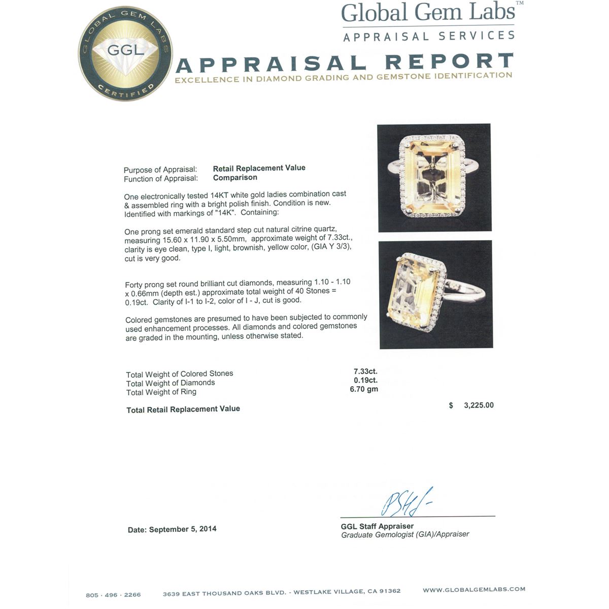 One electronically tested 14KT white gold ladies combination cast & assembled ring with a bright polish finish. Identified with markings of "14K". Condition is new. Containing: One prong set emerald standard step cut natural citrine quartz, measuring 15.60 x 11.90 x 5.50mm, approximate weight of 7.33ct., clarity is eye clean, type I, light, brownish, yellow color, (GIA Y 3/3), cut is very good. Forty prong set round brilliant cut diamonds, measuring 1.10 - 1.10 x 0.66mm (depth est.) approximate total weight of 40 Stones = 0.19ct. Clarity: I-1 to I-2. Color: I - J, Cut is Good. Colored gemstones are presumed to have been subjected to commonly used enhancement processes. All diamonds and colored gemstones are graded in the mounting, unless otherwise stated. Total Weight of Colored Stones 7.33ct. Total Weight of Diamonds 0.19ct. Total Weight of Ring 6.70 grams. GGL Appraised at $3,225.00.