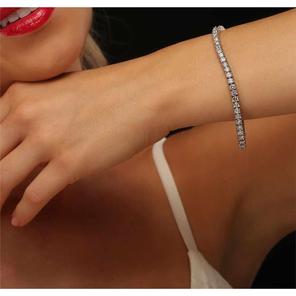 One electronically tested 14KT white gold ladies cast & assembled diamond tennis bracelet with a bright polish finish. Seven and one-half inch length bracelet composed of a flexible ribbon of diamonds, terminating in a concealed clasp with safety bar. Identified with markings of "14K". Condition is new, good workmanship. Tennis bracelets & necklaces got their unusual name from an incident involving the U.S. professional tennis player Chris Evert during a tennis match in the 1980's. Evert had been wearing an expensive diamond bracelet, an inline string of individually-set diamonds. Previously these bracelets were known as eternity bracelets. When the clasp snapped during play, she asked the officials to stop the tennis match until the bracelet could be found. Since that day, bracelets and necklaces featuring an inline string of diamonds have been called tennis bracelets and tennis necklaces. Containing: Fifty-Four prong set round brilliant cut diamonds, measuring 3.50 - 3.30 x 1.90mm (depth est.) approximate total weight of 54 Stones = 7.33ct. Graded in the setting. Clarity: SI-1 to I-1 . Color: H - J. Total Weight of Diamonds 7.33ct. Total Weight of Tennis Bracelet 19.06 grams. AIG Appraised at $24,220.00.