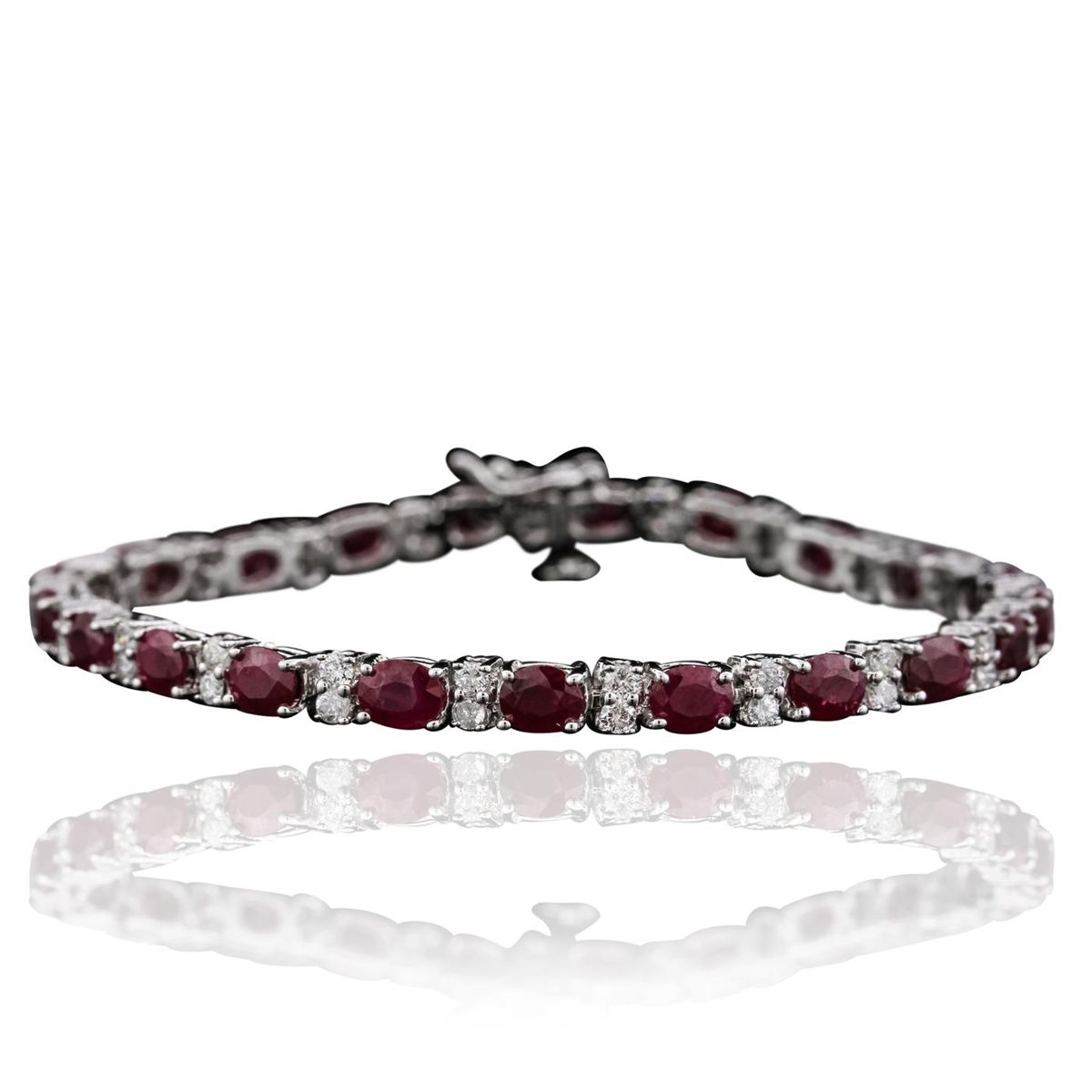 One electronically tested 14KT white gold ladies combination cast & assembled bracelet with a hidden box clasp with a bright polish finish. Measurements: 6.85" in length. Identified with markings of "14K". Condition is new. Containing: Twenty-one prong set oval modified brilliant cut natural rubies, measuring 5.20 x 4.20 x 1.99mm, approximate total weight of 7.35ct., clarity is heavily included, type II, medium dark, moderately strong, strongly purplish red color, (GIA stpR 6/4), cut is good. Forty-Two prong set round brilliant cut diamonds, measuring 2.00 - 2.00 x 1.20mm (depth est.) approximate total weight of 42 Stones = 1.23ct. Clarity: I-1 to I-2. Color: G - H, Cut is Good. Colored gemstones are presumed to have been subjected to commonly used enhancement processes. All diamonds and colored gemstones are graded in the mounting, unless otherwise stated. Total Weight of Colored Stones 7.35ct. Total Weight of Diamonds 1.23ct. Total Weight of Bracelet 12.40 grams. GGL Appraised at $8,740.00.
