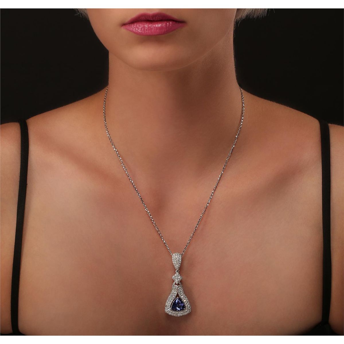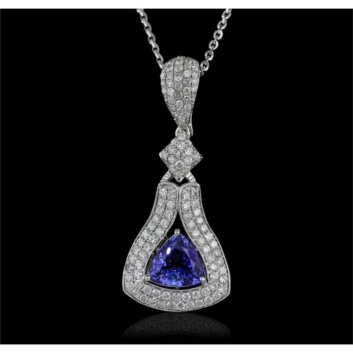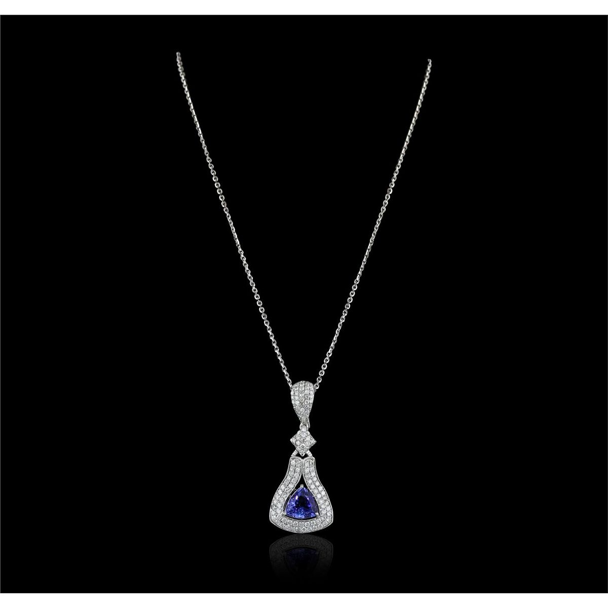One electronically tested 14KT white gold Ladies combination cast & assembled pendant & chain 17.0" long, medium cable link with a lobster claw clasp with a bright polish finish. Condition is new. Identified with markings of "14K". Containing: One prong set round triangle modified brilliant cut natural tanzanite, measuring 11.40 x 11.40 x 9.41mm, approximate weight of 7.37ct., clarity is eye clean, type I, medium light, moderately strong, violet color, (GIA V 4/4), cut is good. Colored gemstones are presumed to have been subjected to commonly used color/clarity enhancement processes. One Hundred Thirty-Six prong set round brilliant cut diamonds, measuring 1.80 - 1.40 x 0.96mm (depth est.) approximate. Total Weight of 136 Stones = 2.03ct. Clarity: I-1 to I-2. Color: H - I, Cut is Good. Total Weight of Colored Stones 7.37ct. Total Weight of Diamonds 2.03ct. Total Weight of Pendant & Chain 14.40 grams. GGL Appraised at $17,800.00.