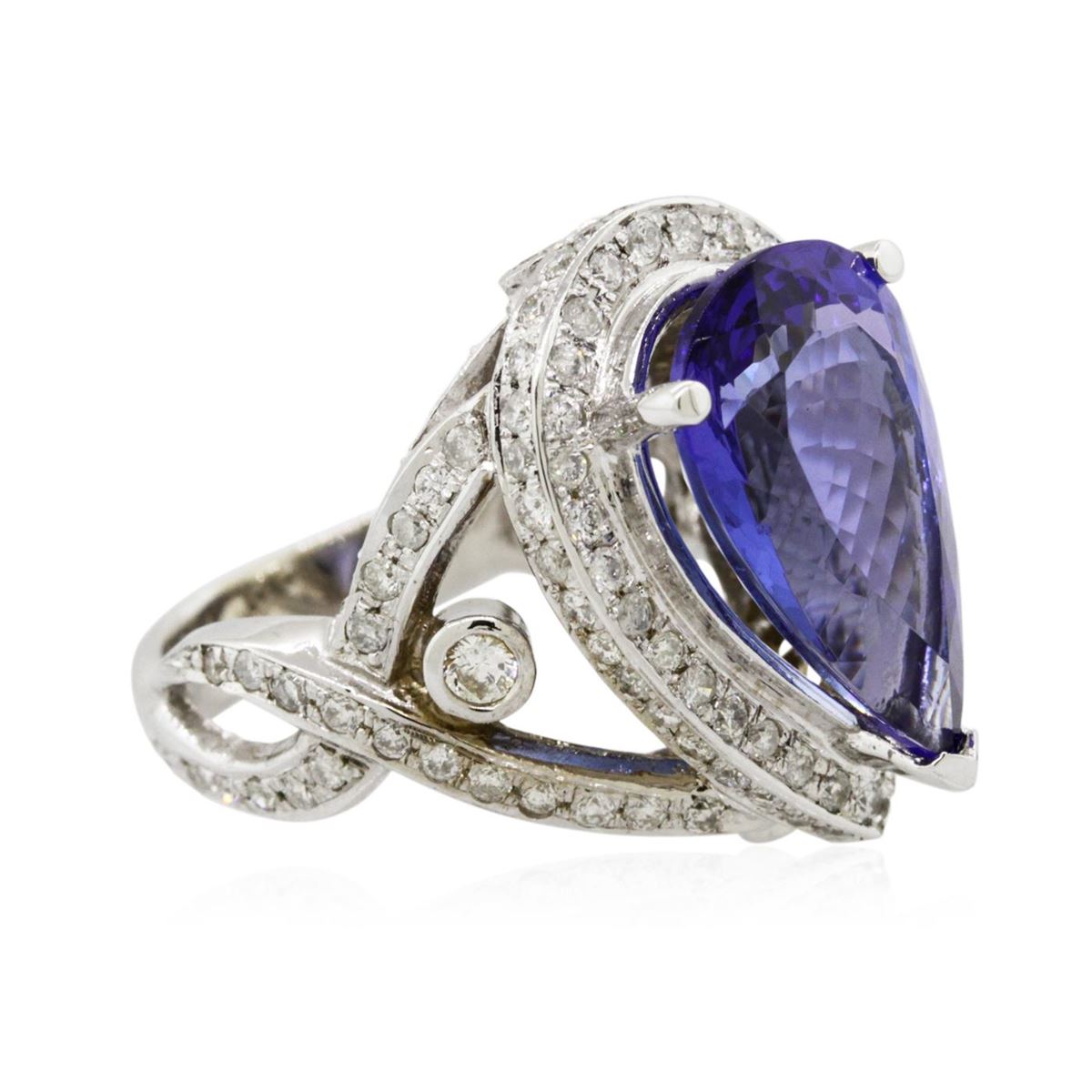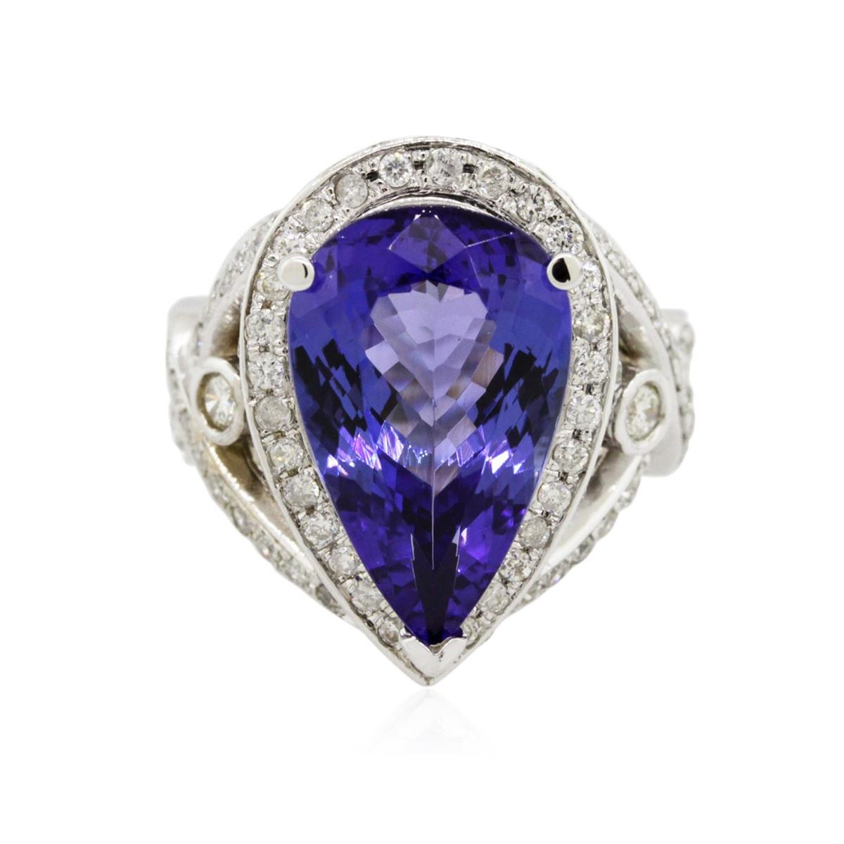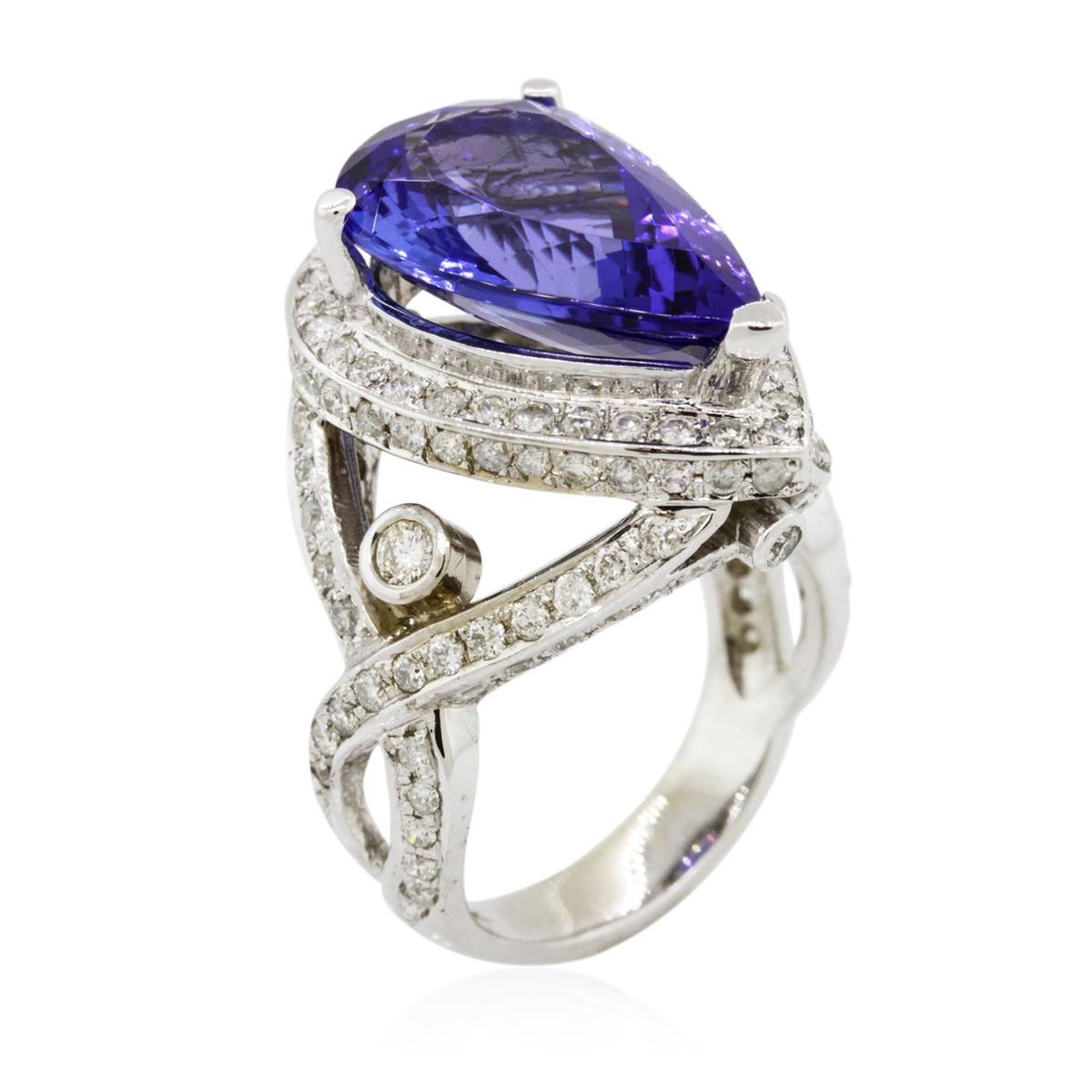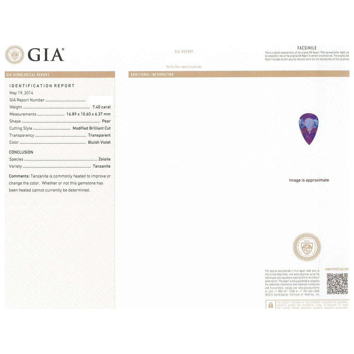 One electronically tested 14KT white gold ladies cast tanzanite and diamond ring with a bright polish finish. Condition is new, good workmanship. The featured tanzanite is set within a diamond bezel supported by stylized intertwining diamond set shoulders, completed by a three and one-half millimeter wide band. Identified with markings of "14K". Containing: One prong set pear modified brilliant cut natural tanzanite, measuring 16.89 x 10.60 x 6.37mm, exact weight 7.40ct., clarity is eye clean, type I, medium dark, moderately strong, bluish violet color, (GIA bV 6/4), cut is good. Transmitting light with no distortion, transparent. GIA Gemological Report attached. Graded loose prior to setting in the GIA Laboratory, Report #2161097881.Tanzanite is a very rare gemstone that is only found in the country of Tanzania. Originally discovered in 1967. Tiffany & Company, named the stone Tanzanite. It is found in the Usumburu Mountains that border the Umba Valley of northern Tanzania. Tanzanite occurs in gray, brown, violet, blue, reddish-purple, & green. The gem is interesting because of its exceptional pleochroism. Rotated in different directions a tanzanite will exhibit multiple changes of color. Tanzanite has a low tolerance to ultrasonic cleaning, and should not be cleaned using this method. Two bezel set round brilliant cut diamonds, measuring 2.50 - 2.50 x 1.50mm (depth est.) approximate. Total Weight of 2 Stones = 0.15ct. Graded in the setting. Clarity: SI-2 to I-1. Color: H - I One Hundred Thirty prong and bezel set round brilliant cut diamonds, measuring 1.50 - 1.40 x 0.87mm (depth est.) approximate. Total Weight of 130 Stones = 1.54ct. Graded in the setting. Clarity: SI-2 to I-2. Color: G - I. Total Weight of Colored Stones 7.40ct. Total Weight of Diamonds 1.69ct. Total Weight of Ring 10.49 grams. AIG Appraised at $25,160.00.