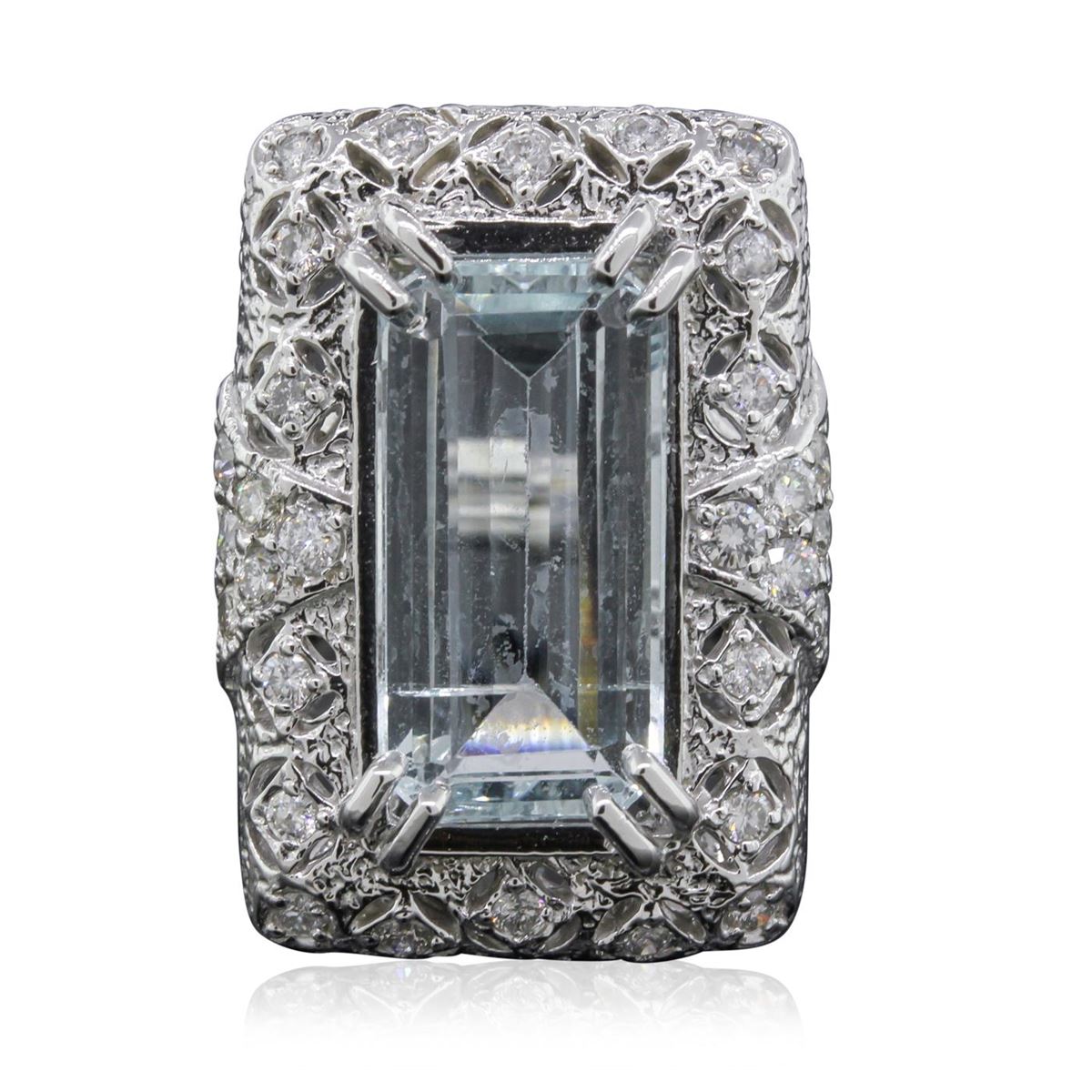 One electronically tested 14KT white gold ladies cast aquamarine and diamond ring with a bright polish finish. Condition is new, good workmanship. The featured aquamarine is set within a diamond bezel, supported by split shoulders and completed by a three and one-half millimeter wide band. Identified with markings of "K14". Containing: One prong set rectangular step cut natural aquamarine, measuring 17.35 x 8.80 x 5.50mm, 8%. bulge factor, approximate weight of 7.40ct., clarity is eye clean, type I, medium light, very slightly grayish, very slightly greenish blue color, (GIA vslgB 4/3), cut is good. Transmitting light with no distortion, transparent. Refractive index testing results of 1.56 to 1.57. This is a conclusive result for Aquamarine (Beryl). Colored Stone Grading Report attached. Graded in the setting. Thirty prong set round brilliant cut diamonds, measuring 2.10 - 1.90 x 1.20mm (depth est.) approximate. Total Weight of 30 Stones = 0.97ct. Graded in the setting. Clarity: SI-2 to I-1. Color: H - J. Total Weight of Colored Stones 7.40ct. Total Weight of Diamonds 0.97ct. Total Weight of Ring 12.70 grams. AIG Appraised at $8,015.00.