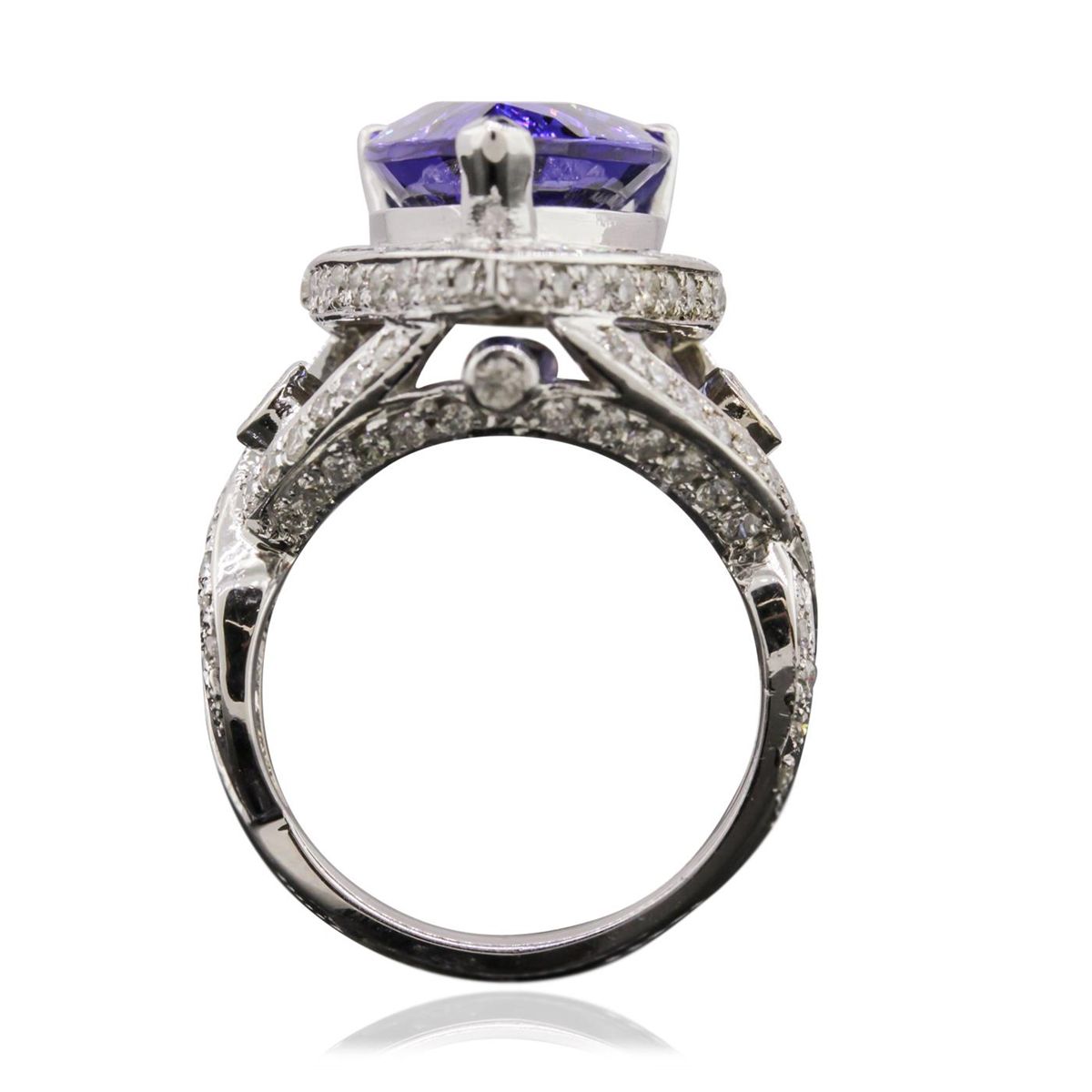 One electronically tested 14KT white gold ladies cast tanzanite and diamond ring with a bright polish finish. Condition is new, good workmanship. The featured tanzanite is set within a diamond bezel supported by stylized intertwining diamond set shoulders, completed by a three and one-half millimeter wide band. Identified with markings of "14K". Containing: One prong set pear modified brilliant cut natural tanzanite, measuring 16.89 x 10.60 x 6.37mm, exact weight 7.40ct., clarity is eye clean, type I, medium dark, moderately strong, bluish violet color, (GIA bV 6/4), cut is good. Transmitting light with no distortion, transparent. GIA Gemological Report attached. Graded loose prior to setting in the GIA Laboratory, Report #2161097881.Tanzanite is a very rare gemstone that is only found in the country of Tanzania. Originally discovered in 1967. Tiffany & Company, named the stone Tanzanite. It is found in the Usumburu Mountains that border the Umba Valley of northern Tanzania. Tanzanite occurs in gray, brown, violet, blue, reddish-purple, & green. The gem is interesting because of its exceptional pleochroism. Rotated in different directions a tanzanite will exhibit multiple changes of color. Tanzanite has a low tolerance to ultrasonic cleaning, and should not be cleaned using this method. Two bezel set round brilliant cut diamonds, measuring 2.50 - 2.50 x 1.50mm (depth est.) approximate. Total Weight of 2 Stones = 0.15ct. Graded in the setting. Clarity: SI-2 to I-1. Color: H - I One Hundred Thirty prong and bezel set round brilliant cut diamonds, measuring 1.50 - 1.40 x 0.87mm (depth est.) approximate. Total Weight of 130 Stones = 1.54ct. Graded in the setting. Clarity: SI-2 to I-2. Color: G - I. Total Weight of Colored Stones 7.40ct. Total Weight of Diamonds 1.69ct. Total Weight of Ring 10.49 grams. AIG Appraised at $25,160.00.