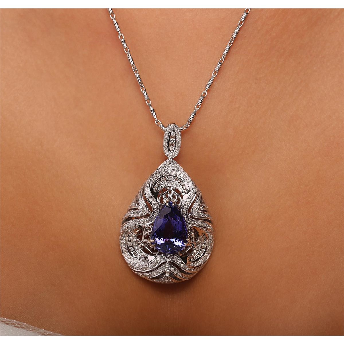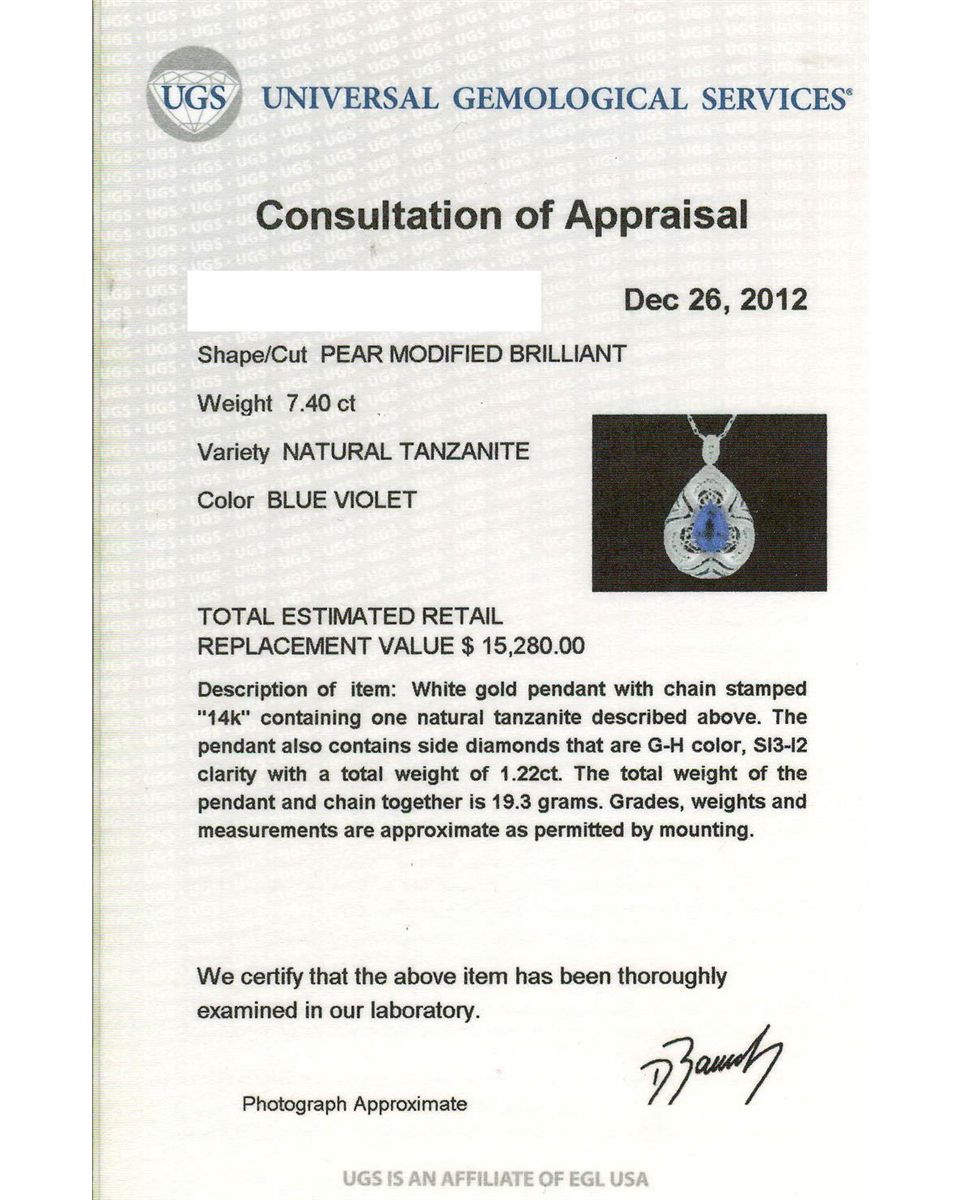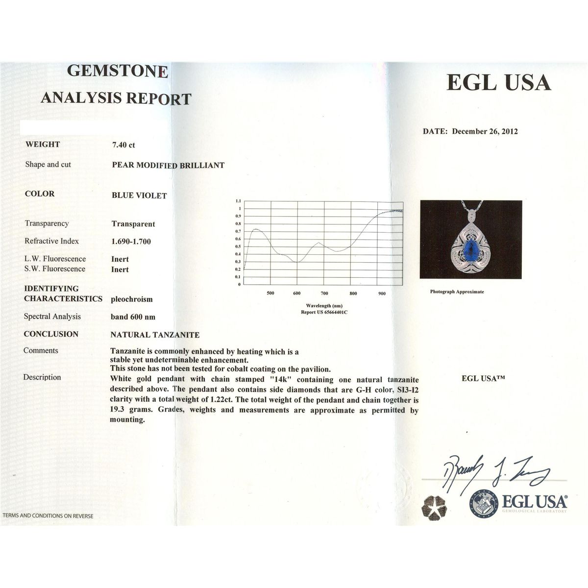 Gemstone Analysis Report US 65664401C. Weight 7.40ct. Shape and cut Pear Modified Brilliant. Color Blue Violet. Transparency Transparent. Refractive Index 1.690-1.700. LW Fluorescence Inert, SW Fluorescence Inert. Identifying Characteristics: Pleochroism. Spectral Analysis band 600nm. Conclusion: Natural Tanzanite. Comments: Tanzanite is commonly enhanced by heating which is a stable yet undeterminable enhancement. This stone has not been tested for cobalt coating on the pavilion. Description: White gold pendant with chain stamped "14k" containing one natural tanzanite described above. The pendant also contains side diamonds that are G-H color, SI3-I2 clarity with a total weight of 1.22ct. The total weight of the pendant and chain together is 19.3 grams. Grades, weights, and measurements are approximate as permitted by mounting. EGL USA Appraised at $15,280.00.