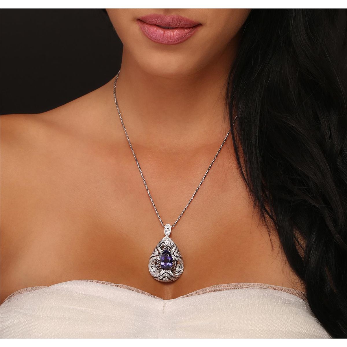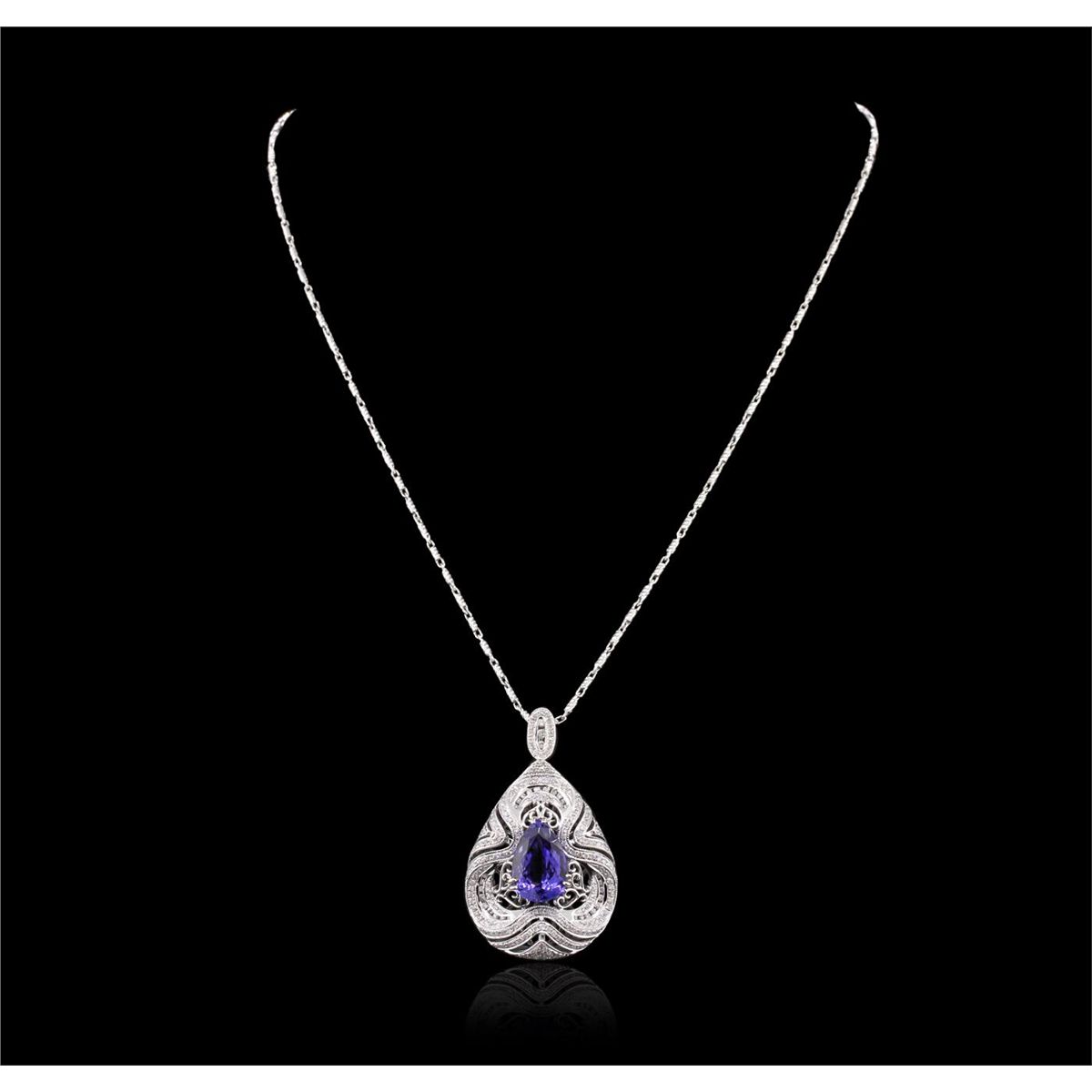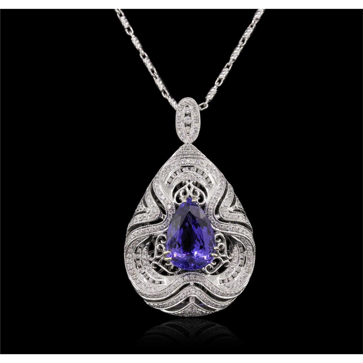 Gemstone Analysis Report US 65664401C. Weight 7.40ct. Shape and cut Pear Modified Brilliant. Color Blue Violet. Transparency Transparent. Refractive Index 1.690-1.700. LW Fluorescence Inert, SW Fluorescence Inert. Identifying Characteristics: Pleochroism. Spectral Analysis band 600nm. Conclusion: Natural Tanzanite. Comments: Tanzanite is commonly enhanced by heating which is a stable yet undeterminable enhancement. This stone has not been tested for cobalt coating on the pavilion. Description: White gold pendant with chain stamped "14k" containing one natural tanzanite described above. The pendant also contains side diamonds that are G-H color, SI3-I2 clarity with a total weight of 1.22ct. The total weight of the pendant and chain together is 19.3 grams. Grades, weights, and measurements are approximate as permitted by mounting. EGL USA Appraised at $15,280.00.