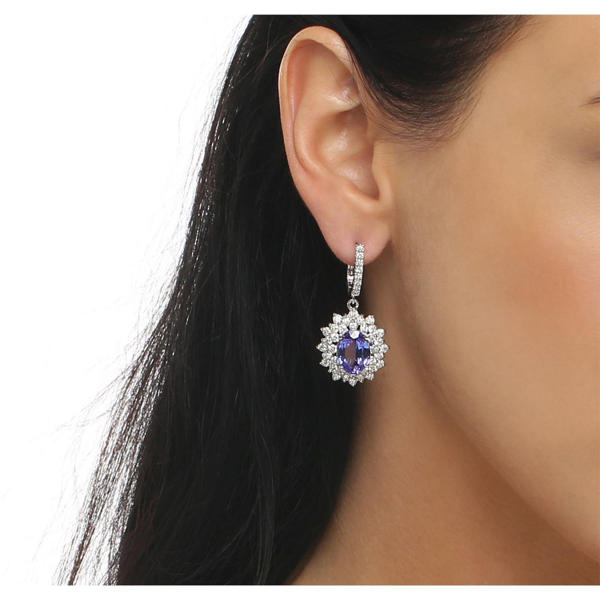 One pair electronically tested 14KT white gold ladies cast & assembled tanzanite and diamond dangle earrings with hinged, snap locking posts. Bright polish finish. Condition is new, good workmanship. Identified with markings of "14K". Containing: Two prong set oval brilliant cut natural tanzanites, measuring 11.60 x 8.50 x 5.10mm, 8%. bulge factor, approximate. Total Weight of 7.46ct., clarity is eye clean, type I, medium dark, very slightly grayish, bluish violet color, (GIA bV 6/3), cut is good. Transmitting light with no distortion, transparent. Measurements & the color grade are an average for the pair. Graded in the setting.Tanzanite is a very rare gemstone that is only found in the country of Tanzania. Originally discovered in 1967. Tiffany & Company, named the stone Tanzanite. It is found in the Usumburu Mountains that border the Umba Valley of northern Tanzania. Tanzanite occurs in gray, brown, violet, blue, reddish-purple, & green. The gem is interesting because of its exceptional pleochroism. Rotated in different directions a tanzanite will exhibit multiple changes of color. Tanzanite has a low tolerance to ultrasonic cleaning, and should not be cleaned using this method. Eighty-Eight prong set round brilliant cut diamonds, measuring 2.20 - 1.90 x 1.23mm (depth est.) approximate. Total Weight of 88 Stones = 2.87ct. Graded in the setting. Clarity: SI-2 to I-2. Color: G - I. Total Weight of Colored Stones 7.46ct. Total Weight of Diamonds 2.87ct. Total Weight of Earrings 13.72gm. AIG Appraised at $23,295.00.