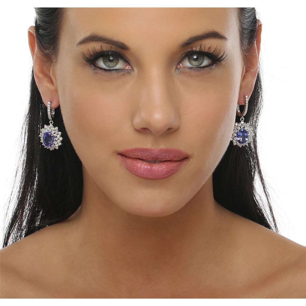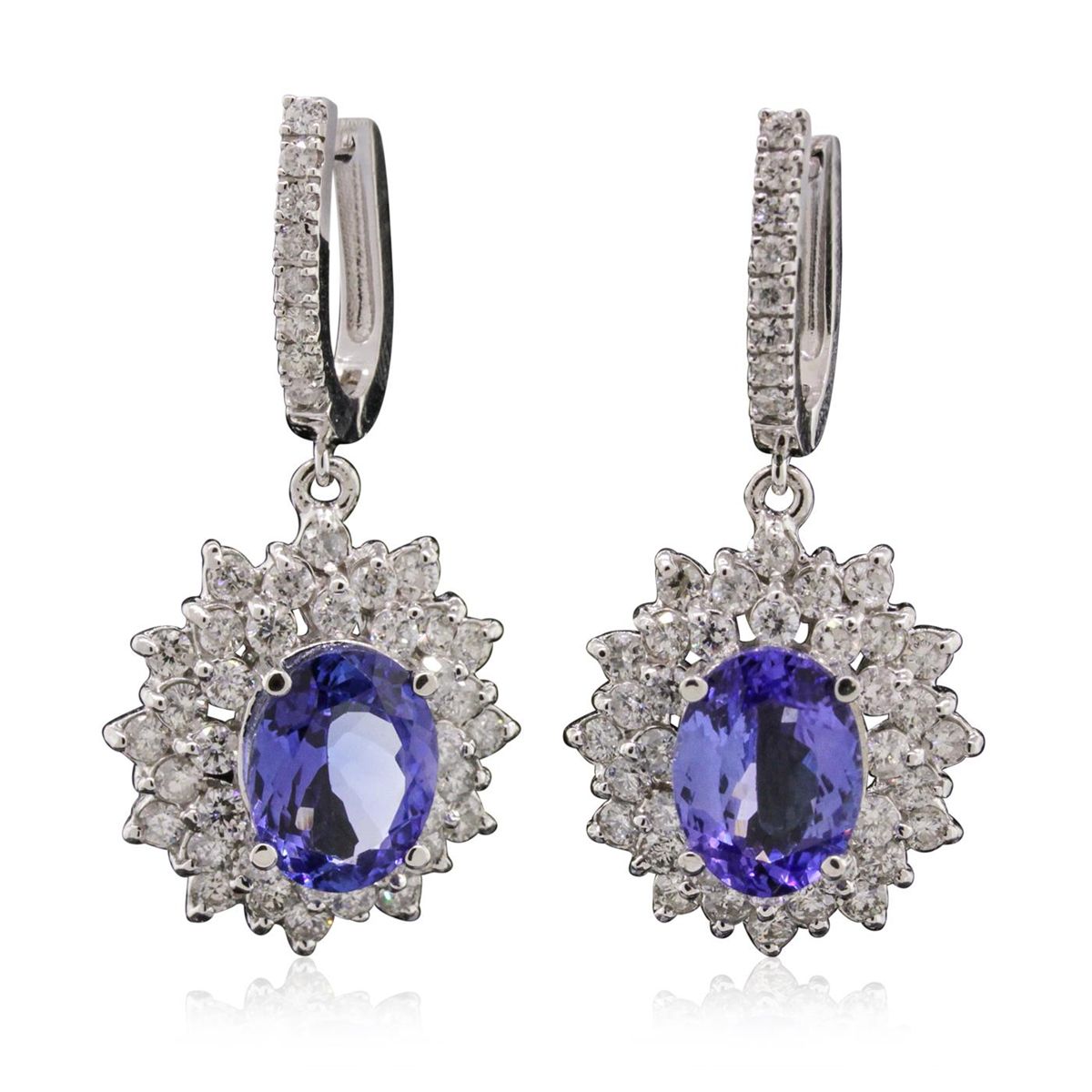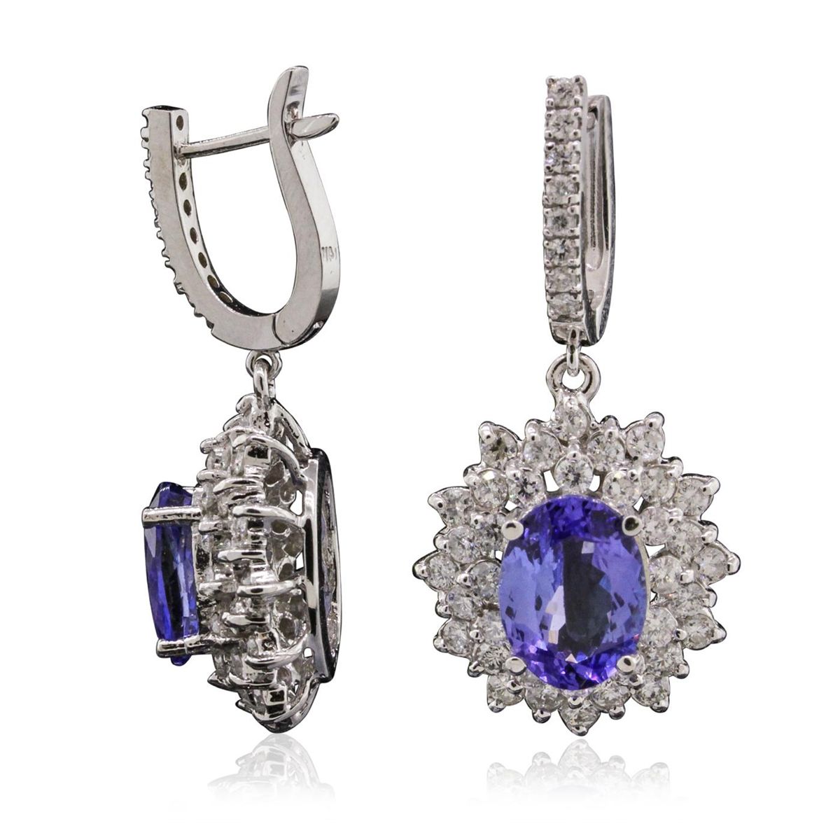 One pair electronically tested 14KT white gold ladies cast & assembled tanzanite and diamond dangle earrings with hinged, snap locking posts. Bright polish finish. Condition is new, good workmanship. Identified with markings of "14K". Containing: Two prong set oval brilliant cut natural tanzanites, measuring 11.60 x 8.50 x 5.10mm, 8%. bulge factor, approximate. Total Weight of 7.46ct., clarity is eye clean, type I, medium dark, very slightly grayish, bluish violet color, (GIA bV 6/3), cut is good. Transmitting light with no distortion, transparent. Measurements & the color grade are an average for the pair. Graded in the setting.Tanzanite is a very rare gemstone that is only found in the country of Tanzania. Originally discovered in 1967. Tiffany & Company, named the stone Tanzanite. It is found in the Usumburu Mountains that border the Umba Valley of northern Tanzania. Tanzanite occurs in gray, brown, violet, blue, reddish-purple, & green. The gem is interesting because of its exceptional pleochroism. Rotated in different directions a tanzanite will exhibit multiple changes of color. Tanzanite has a low tolerance to ultrasonic cleaning, and should not be cleaned using this method. Eighty-Eight prong set round brilliant cut diamonds, measuring 2.20 - 1.90 x 1.23mm (depth est.) approximate. Total Weight of 88 Stones = 2.87ct. Graded in the setting. Clarity: SI-2 to I-2. Color: G - I. Total Weight of Colored Stones 7.46ct. Total Weight of Diamonds 2.87ct. Total Weight of Earrings 13.72gm. AIG Appraised at $23,295.00.