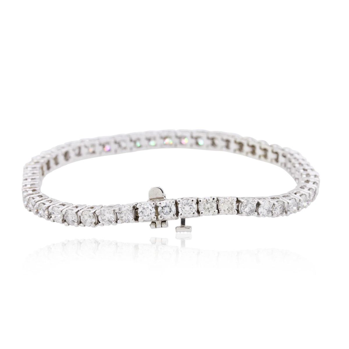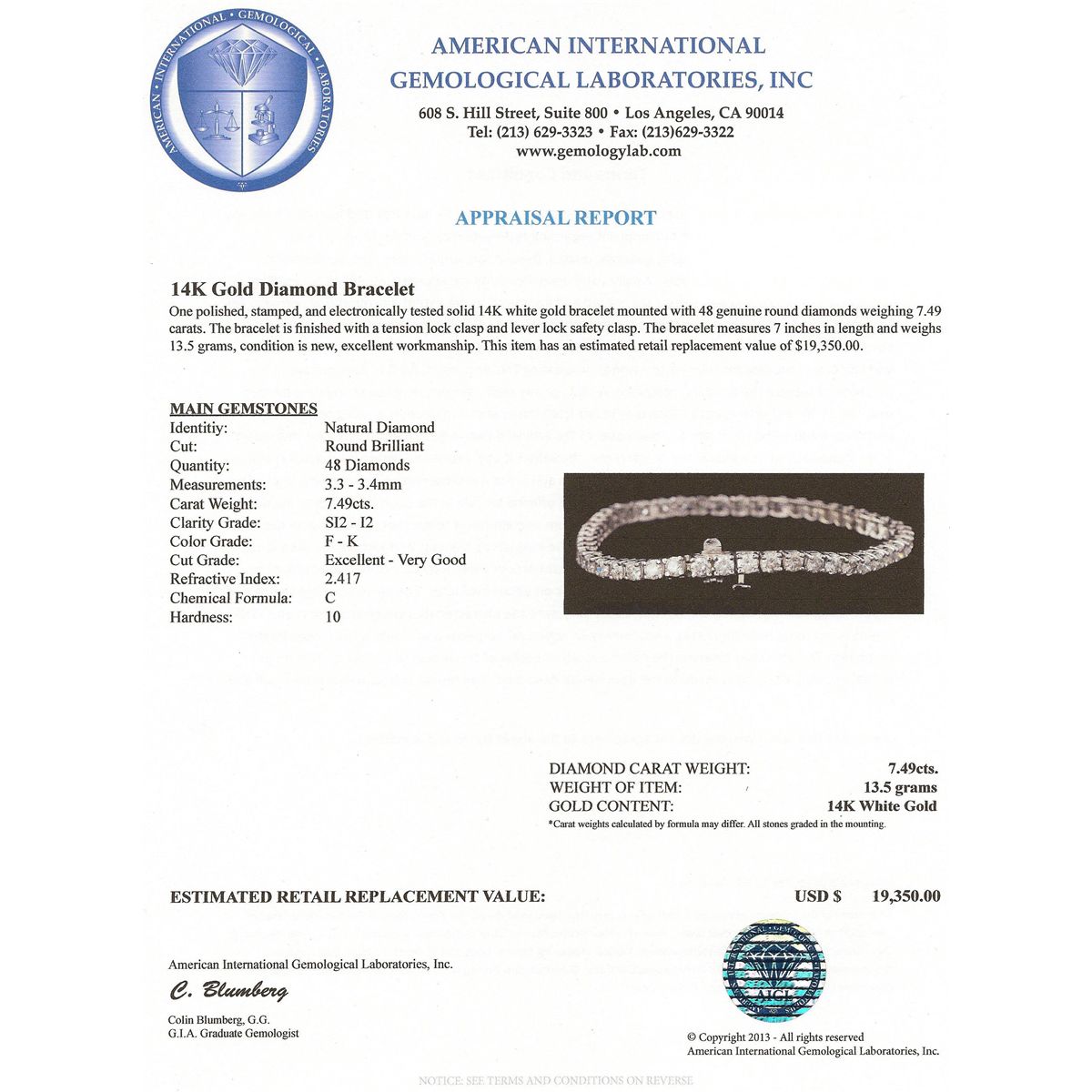 One polished, stamped, and electronically tested solid 14KT White Gold bracelet mounted with 48 genuine round diamonds weighing 7.69 carats. The bracelet is finished with a tension lock clasp and lever lock safety clasp. The bracelet measures 7 inches in length and weighs 13.4 grams, condition is new, excellent workmanship. AIGL Appraised at $19,750.00.