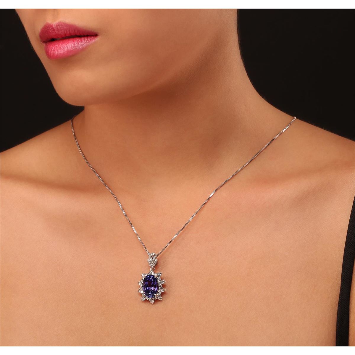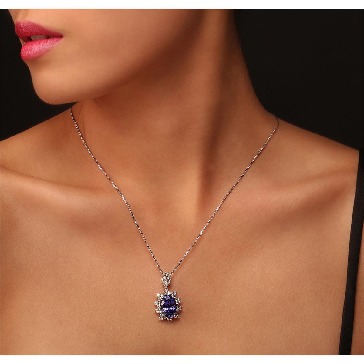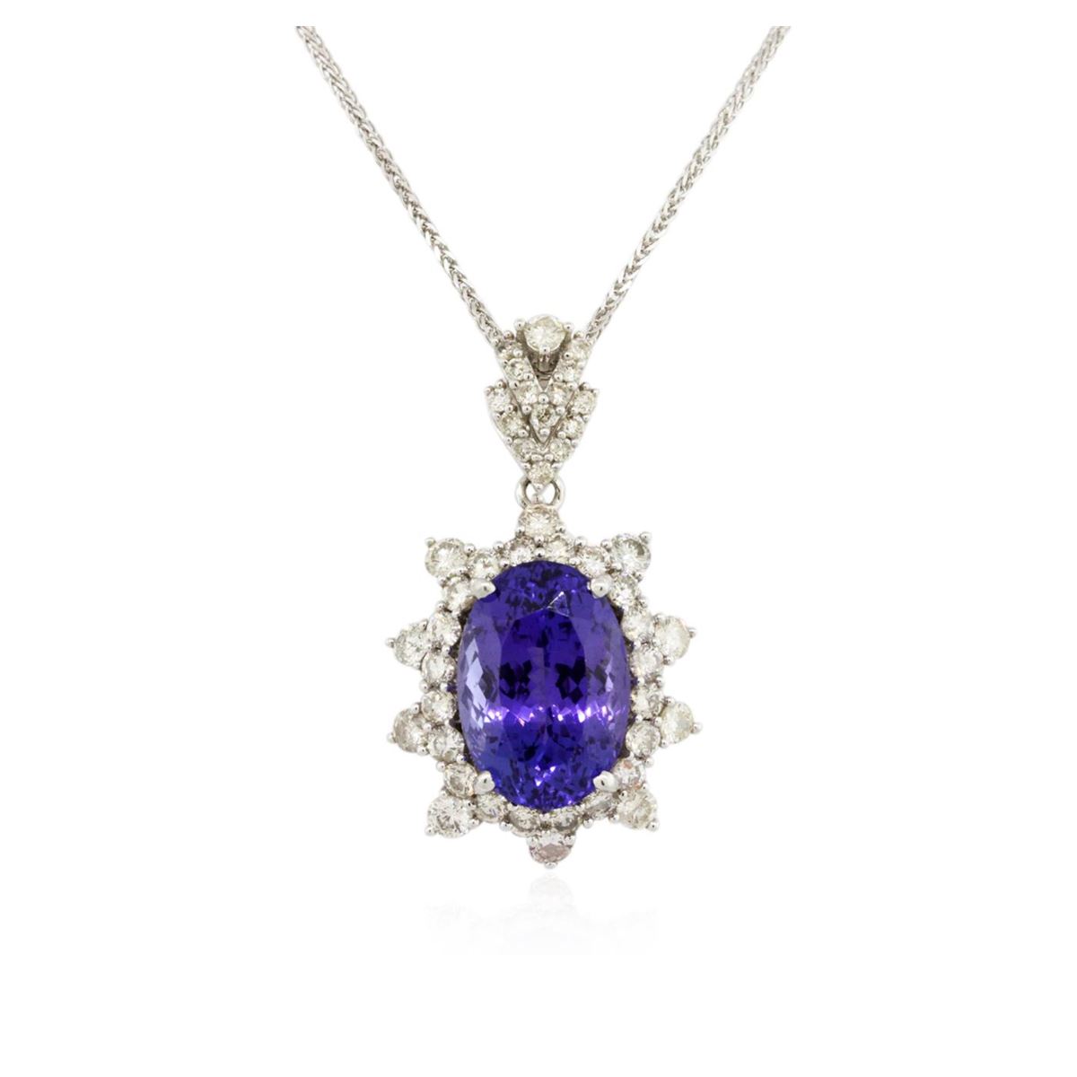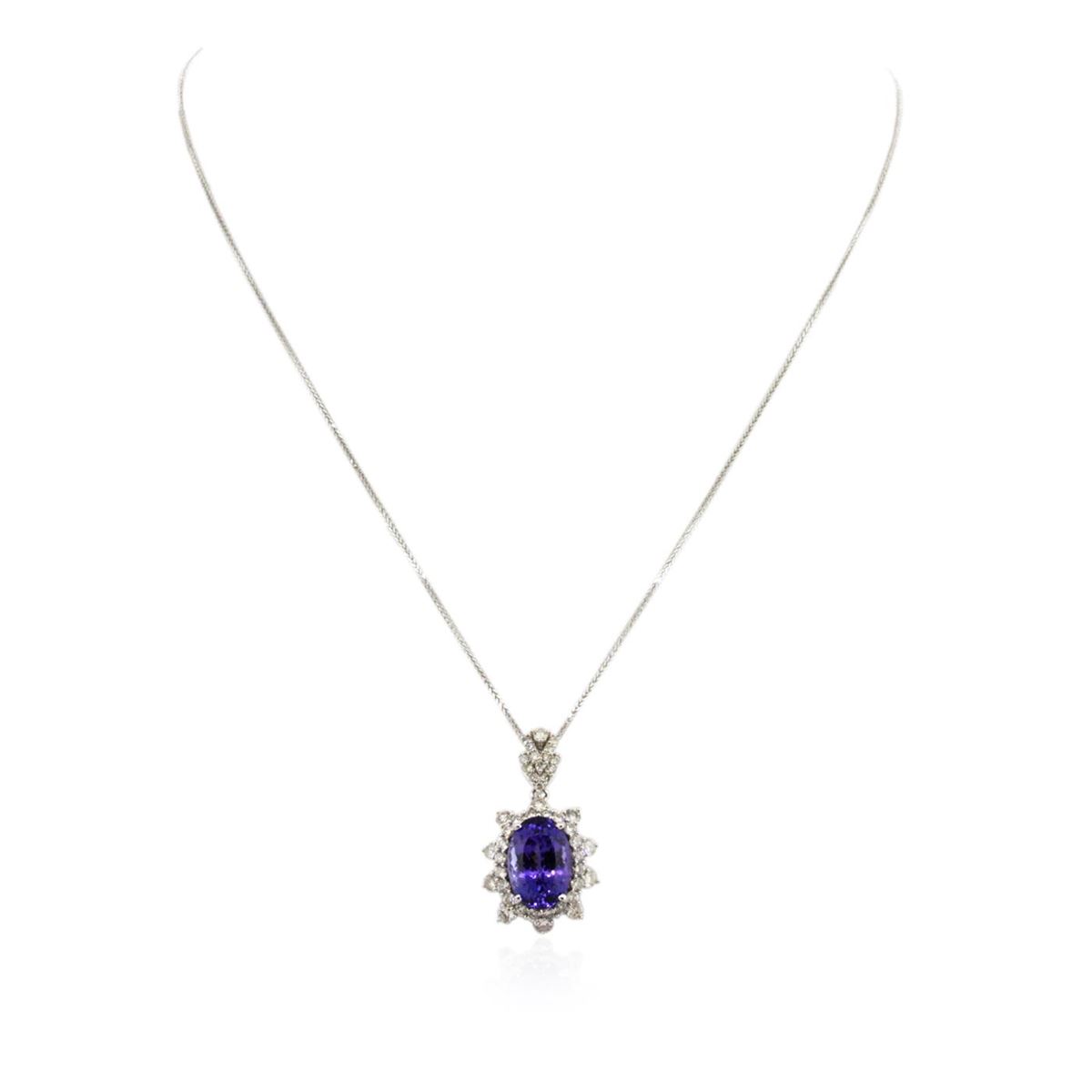 One electronically tested 14KT white gold ladies cast & assembled tanzanite and diamond pendant with chain. Condition is new, good workmanship. The pendant features a tanzanite set within a stylized diamond bezel, completed by a diamond set bail. The pendant is supported by an eighteen inch length 14KT white gold designer style chain, terminating in a spring ring clasp. Bright polish finish. Trademark is Orianne. Identified with markings of "14K". Containing: One prong set oval mixed cut natural tanzanite, measuring 13.80 x 9.50 x 7.65mm, 8%. bulge factor, approximate weight of 7.51ct., clarity is eye clean, type I, medium dark, very slightly grayish, bluish violet color, (GIA bV 6/3), cut is good. Transmitting light with no distortion, transparent. Colored Stone Grading Report attached. Graded in the setting. Tanzanite is a very rare gemstone that is only found in the country of Tanzania. Originally discovered in 1967. Tiffany & Company, named the stone Tanzanite. It is found in the Usumburu Mountains that border the Umba Valley of northern Tanzania. Tanzanite occurs in gray, brown, violet, blue, reddish-purple, & green. The gem is interesting because of its exceptional pleochroism. Rotated in different directions a tanzanite will exhibit multiple changes of color. Tanzanite has a low tolerance to ultrasonic cleaning, and should not be cleaned using this method. Thirty-One prong set round brilliant cut diamonds, measuring 2.60 - 2.20 x 1.44mm (depth est.) approximate. Total Weight of 31 Stones = 1.66ct. Graded in the setting. Clarity: SI-1 to SI-2. Color: H - J Fourteen prong set round brilliant cut diamonds, measuring 1.40 - 1.30 x 0.81mm (depth est.) approximate. Total Weight of 14 Stones = 0.22ct. Graded in the setting. Clarity: SI-1 to I-1. Color: I - K. Total Weight of Colored Stones 7.51ct. Total Weight of Diamonds 1.88ct. Total Weight of Pendant With Chain 6.01 grams. AIG Appraised at $25,755.00.