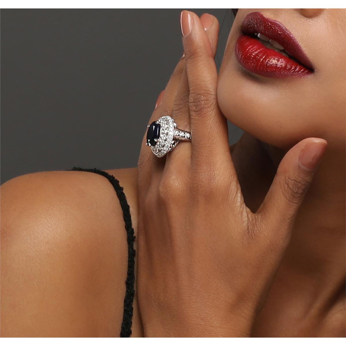 One electronically tested 14KT white gold ladies combination cast & assembled ring with a tapered shank with a bright polish finish. Identified with markings of "K14". Condition is new. Containing: One prong set oval modified brilliant cut natural blue sapphire, measuring 12.66 x 10.65 x 6.92mm, approximate weight of 7.52ct., clarity is heavily included, type II, dark, strong, blue color, (GIA B 7/5), cut is good. Fifty-Two prong set round brilliant cut diamonds, measuring 1.60 - 1.60 x 0.96mm (depth est.) approximate total weight of 52 Stones = 0.78ct. Clarity: SI-1 to I-1. Color: I - J, Cut is Good. Colored gemstones are presumed to have been subjected to commonly used enhancement processes. All diamonds and colored gemstones are graded in the mounting, unless otherwise stated. Total Weight of Colored Stones 7.52ct. Total Weight of Diamonds 0.78ct. Total Weight of Ring 9.19 grams. GGL Appraised at $7,715.00.