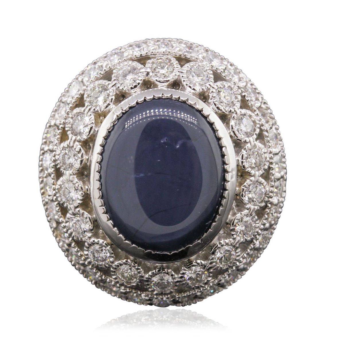 One electronically tested 14KT white gold Ladies cast ring with a bright polish finish. Condition is new. Identified with markings of "K14". Containing: One bezel set oval cut natural blue star sapphire, measuring 15.00 x 12.50 x 5.00mm, approximate weight of 7.56ct., clarity is heavily included, medium, moderately strong, blue color, (GIA B 5/4), cut is good. Colored gemstones are presumed to have been subjected to commonly used color/clarity enhancement processes. Forty-Eight prong set round brilliant cut diamonds, measuring 1.80 - 1.80 x 1.08mm (depth est.) approximate. Total Weight of 48 Stones = 1.02ct. Clarity: SI-2 to I-1. Color: I - J, Cut is Good. All grading of diamonds and colored gemstones in this piece of jewelry are graded in the mounting, unless otherwise stated. Total Weight of Colored Stones 7.56ct. Total Weight of Diamonds 1.02ct. Total Weight of Ring 12.00 grams. GGL Appraised at $13,425.00.