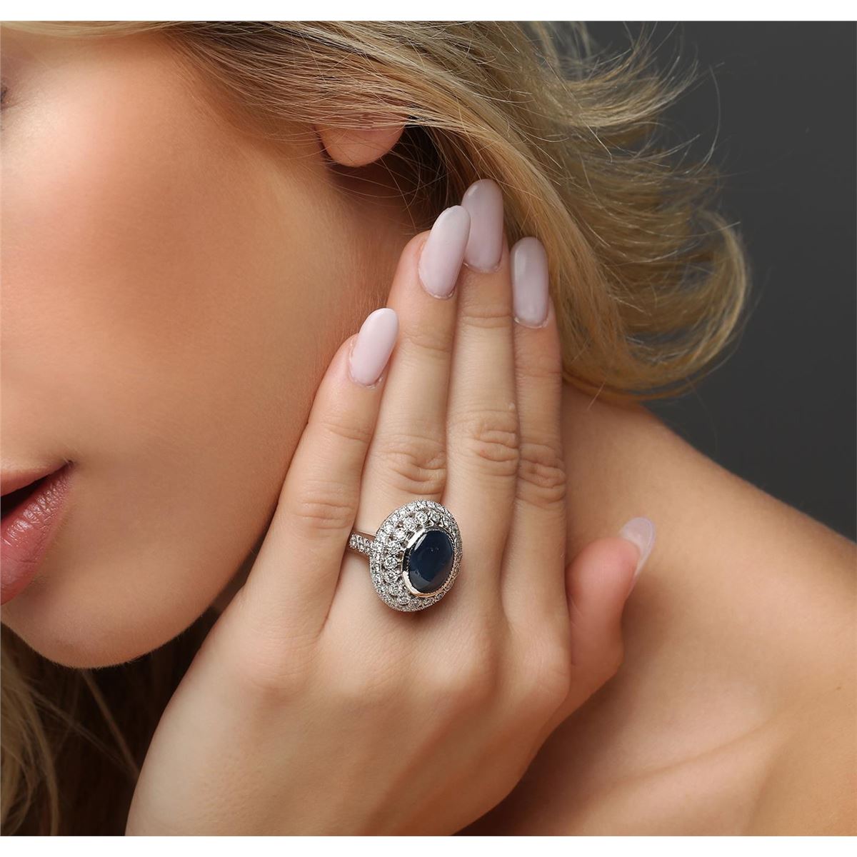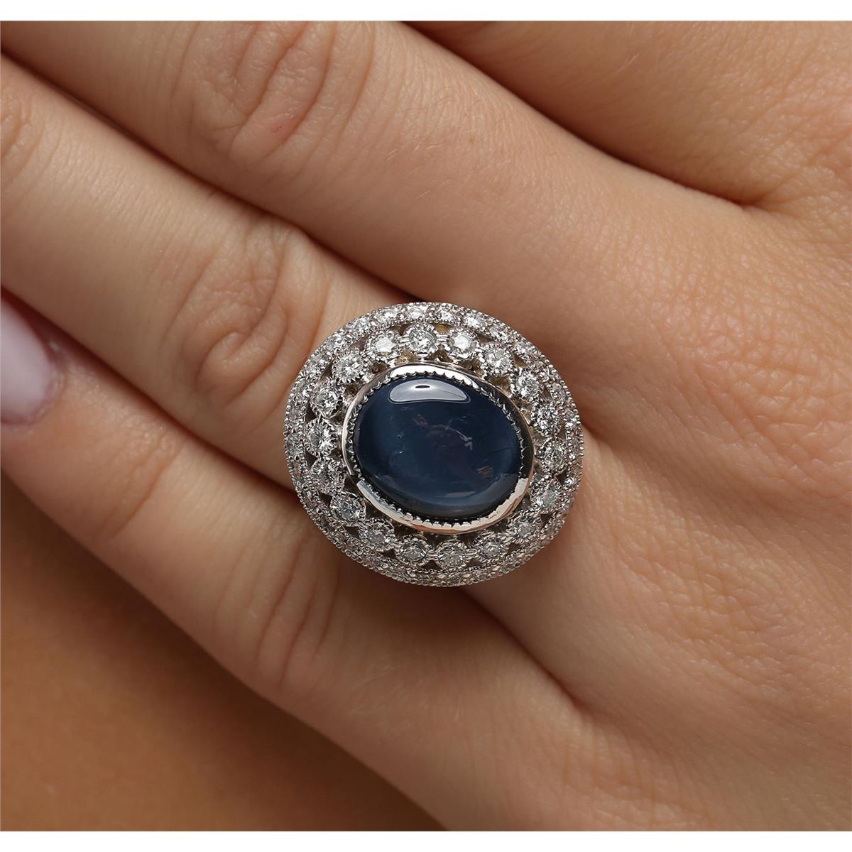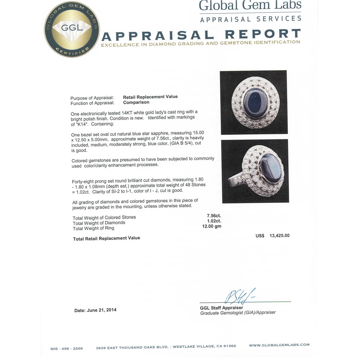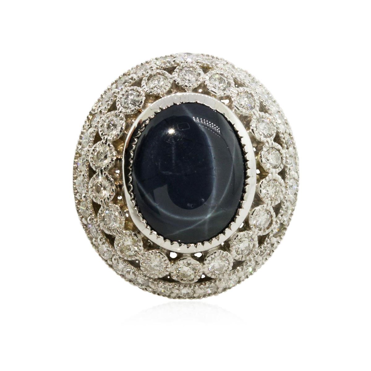 One electronically tested 14KT white gold Ladies cast ring with a bright polish finish. Condition is new. Identified with markings of "K14". Containing: One bezel set oval cut natural blue star sapphire, measuring 15.00 x 12.50 x 5.00mm, approximate weight of 7.56ct., clarity is heavily included, medium, moderately strong, blue color, (GIA B 5/4), cut is good. Colored gemstones are presumed to have been subjected to commonly used color/clarity enhancement processes. Forty-Eight prong set round brilliant cut diamonds, measuring 1.80 - 1.80 x 1.08mm (depth est.) approximate. Total Weight of 48 Stones = 1.02ct. Clarity: SI-2 to I-1. Color: I - J, Cut is Good. All grading of diamonds and colored gemstones in this piece of jewelry are graded in the mounting, unless otherwise stated. Total Weight of Colored Stones 7.56ct. Total Weight of Diamonds 1.02ct. Total Weight of Ring 12.00 grams. GGL Appraised at $13,425.00.