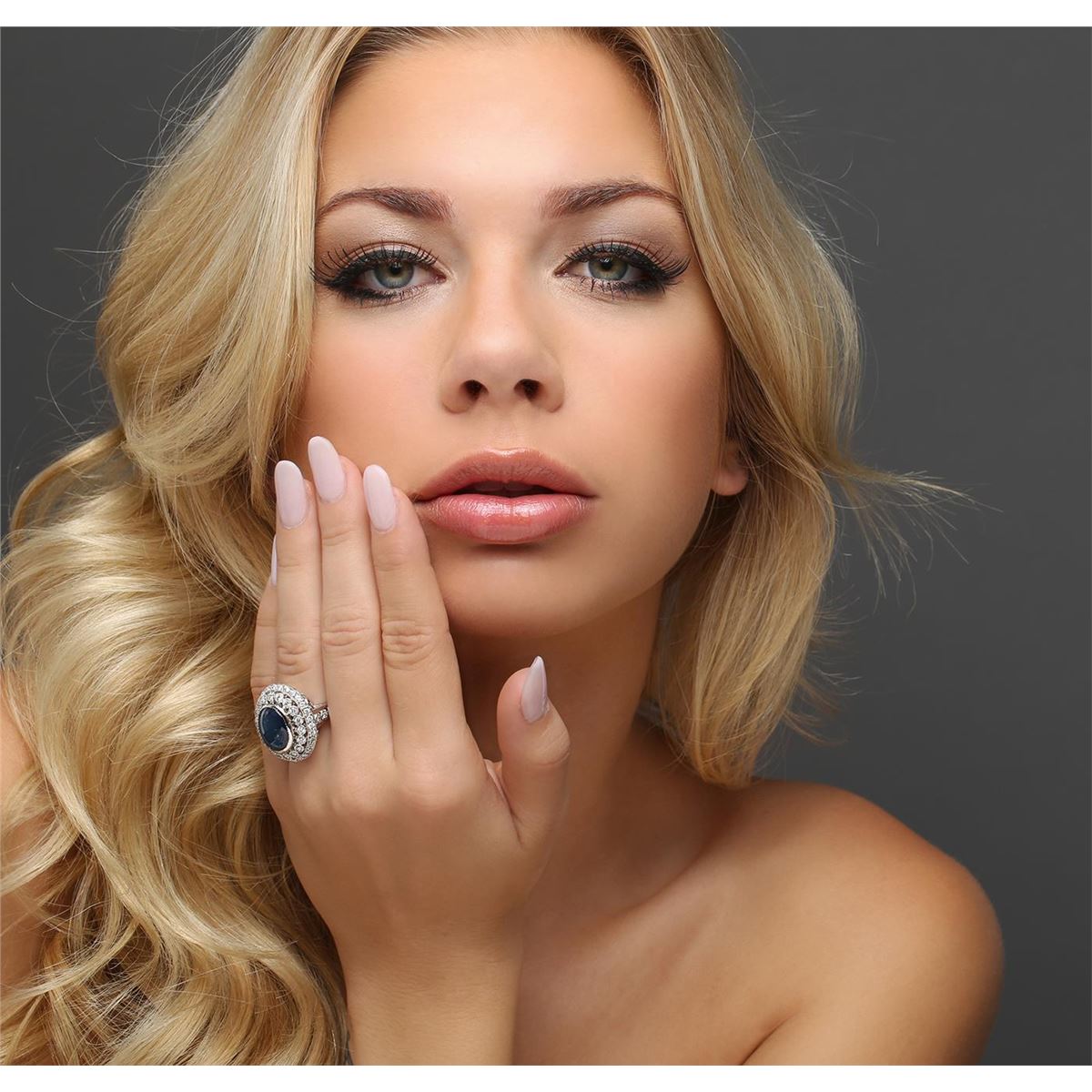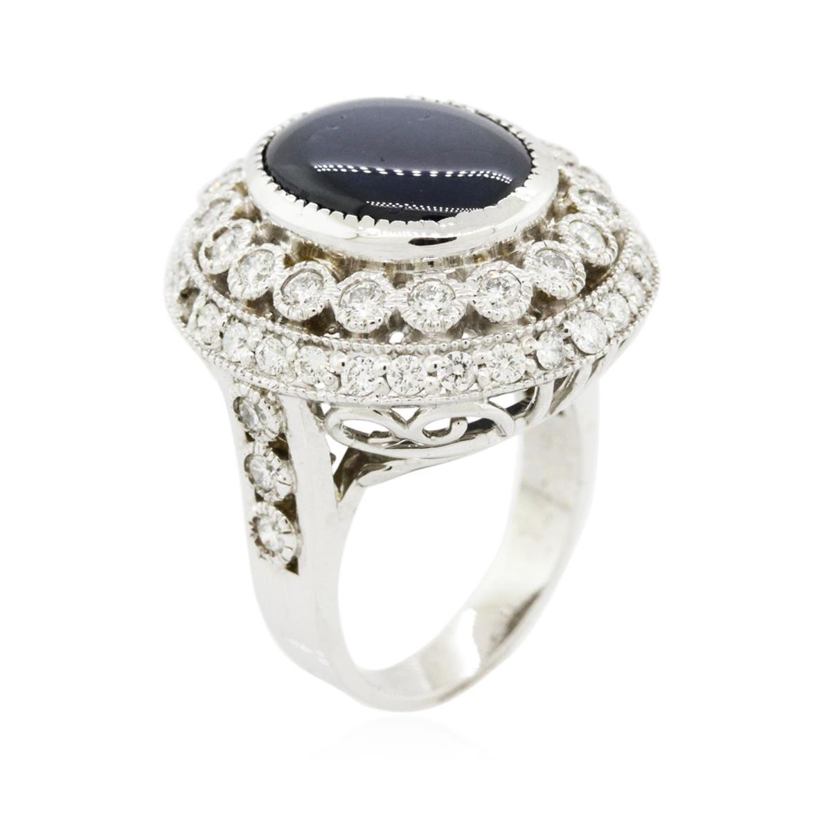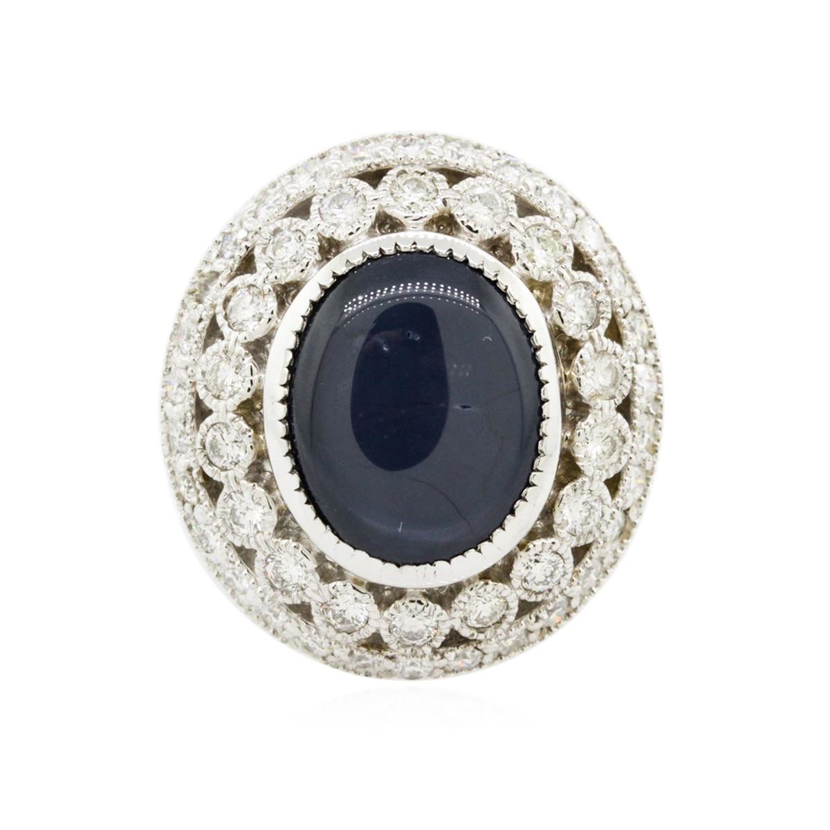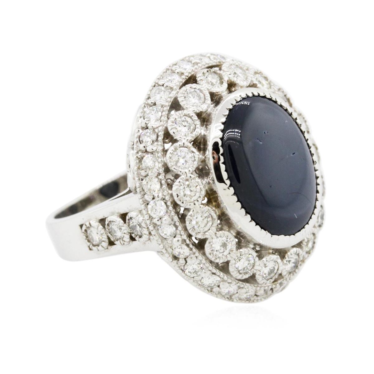 One electronically tested 14KT white gold Ladies cast ring with a bright polish finish. Condition is new. Identified with markings of "K14". Containing: One bezel set oval cut natural blue star sapphire, measuring 15.00 x 12.50 x 5.00mm, approximate weight of 7.56ct., clarity is heavily included, medium, moderately strong, blue color, (GIA B 5/4), cut is good. Colored gemstones are presumed to have been subjected to commonly used color/clarity enhancement processes. Forty-Eight prong set round brilliant cut diamonds, measuring 1.80 - 1.80 x 1.08mm (depth est.) approximate. Total Weight of 48 Stones = 1.02ct. Clarity: SI-2 to I-1. Color: I - J, Cut is Good. All grading of diamonds and colored gemstones in this piece of jewelry are graded in the mounting, unless otherwise stated. Total Weight of Colored Stones 7.56ct. Total Weight of Diamonds 1.02ct. Total Weight of Ring 12.00 grams. GGL Appraised at $13,425.00.