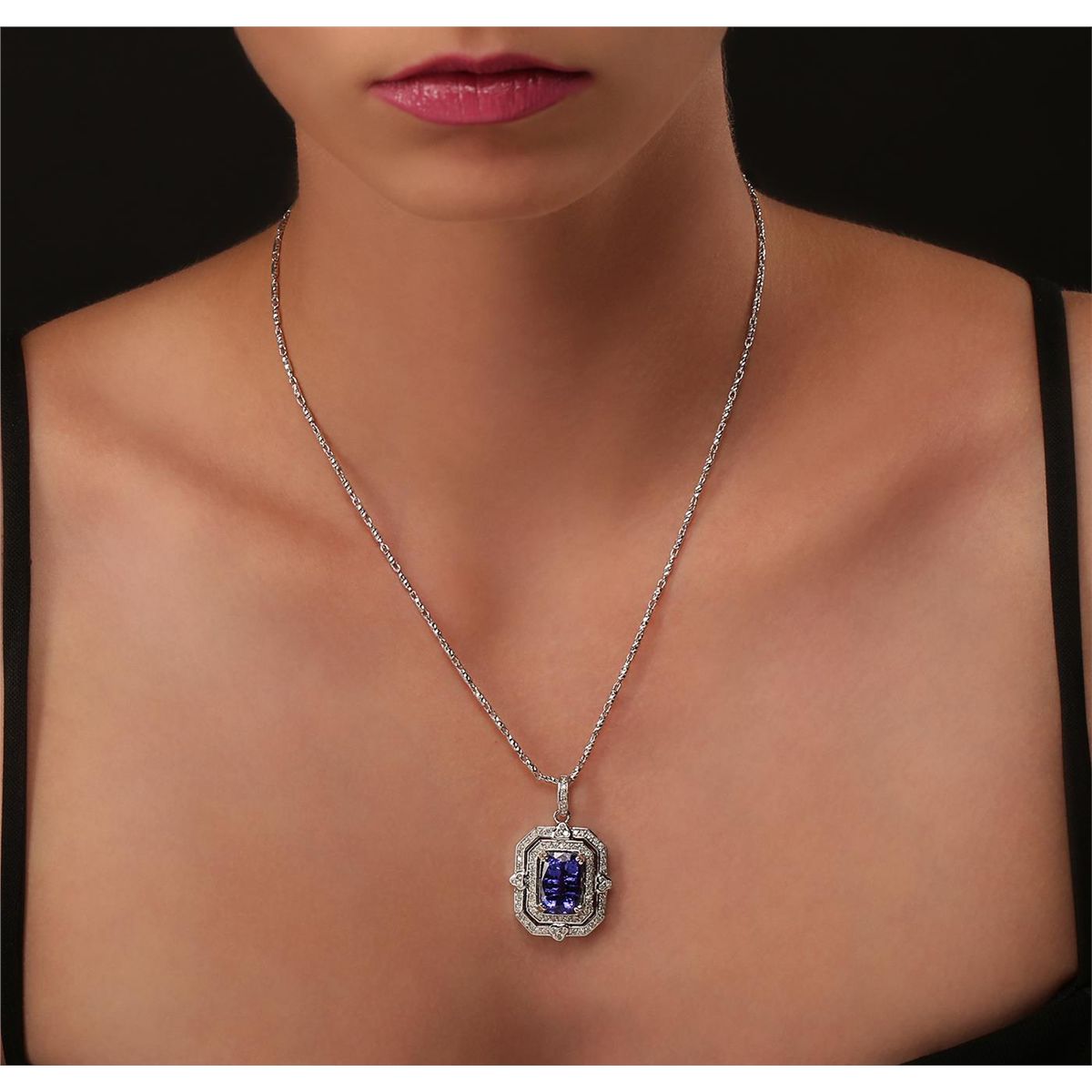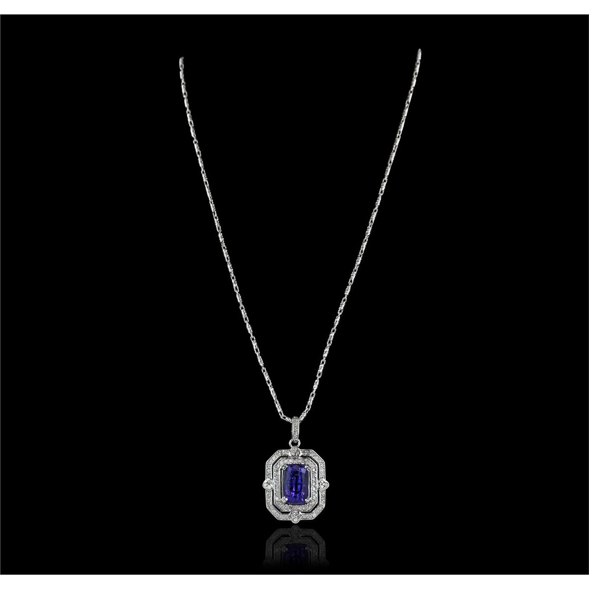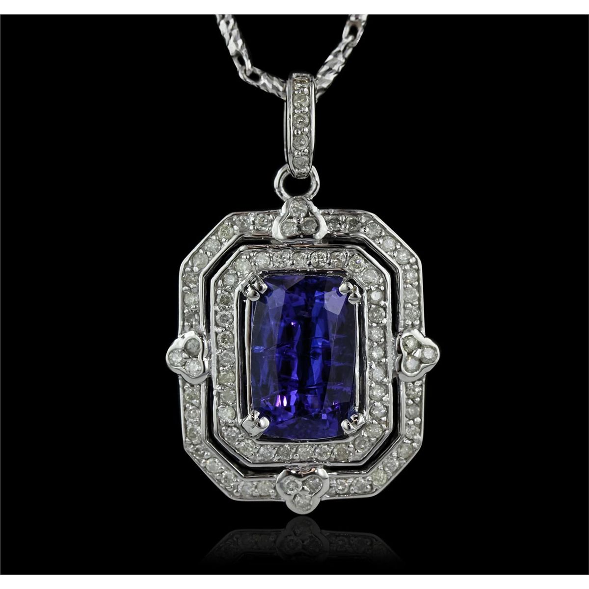 One electronically tested 14KT white gold Ladies combination cast & assembled pendant & chain 17.0" long, medium cable link with a lobster claw clasp with a bright polish finish. Condition is new. Identified with markings of "14K". Containing: One prong set round emerald standard step cut natural tanzanite, measuring 14.20 x 9.20 x 6.40mm, approximate weight of 7.56ct., clarity is eye clean, type I, medium, moderately strong, bluish violet color, (GIA bV 5/4), cut is good. Colored gemstones are presumed to have been subjected to commonly used color/clarity enhancement processes. Eighty-One prong set round brilliant cut diamonds, measuring 1.40 - 1.40 x 0.84mm (depth est.) approximate. Total Weight of 81 Stones = 0.81ct. Clarity: I-1 to I-3. Color: I - J, Cut is Good. Total Weight of Colored Stones 7.56ct. Total Weight of Diamonds 0.81ct. Total Weight of Pendant & Chain 20.70 grams. GGL Appraised at $18,790.00.