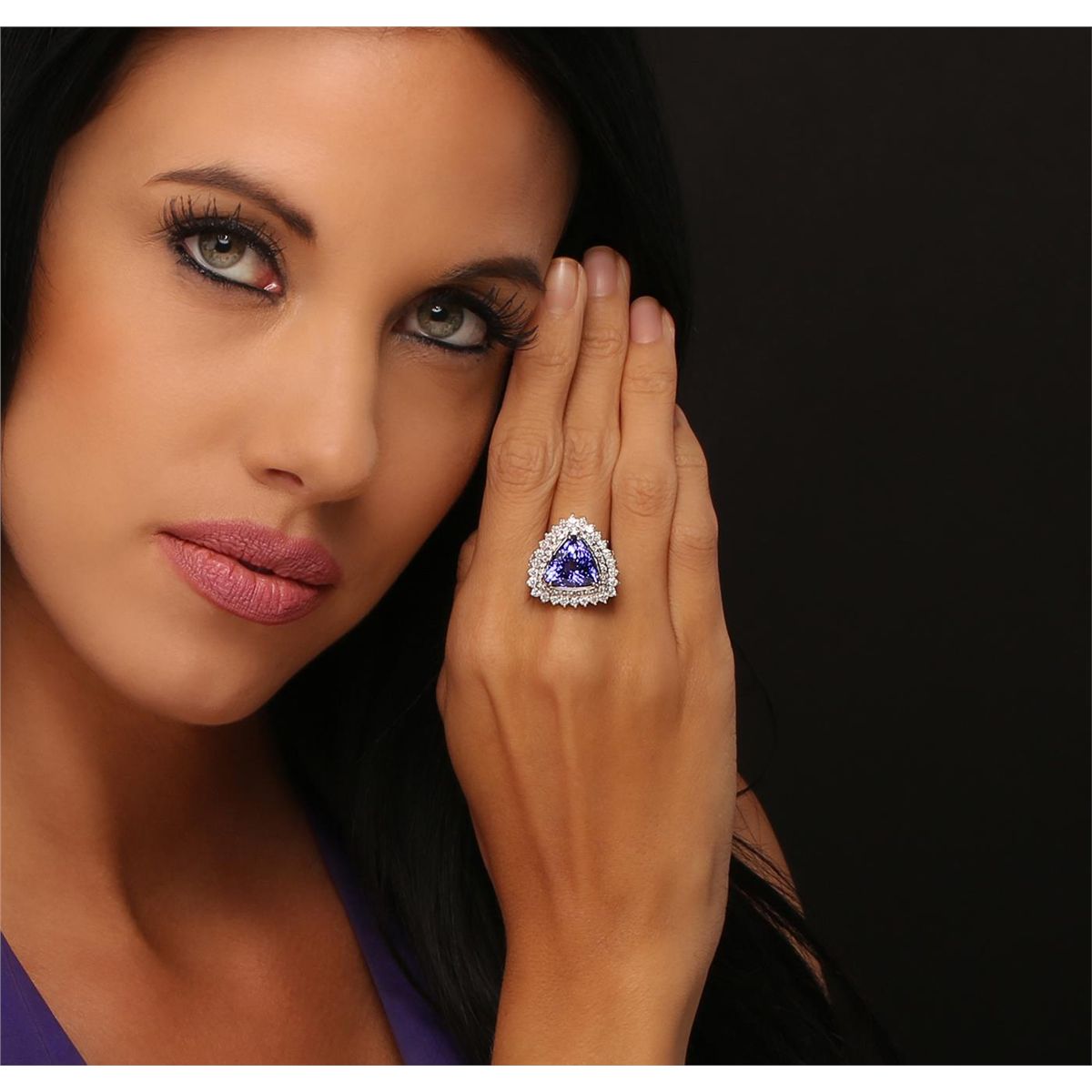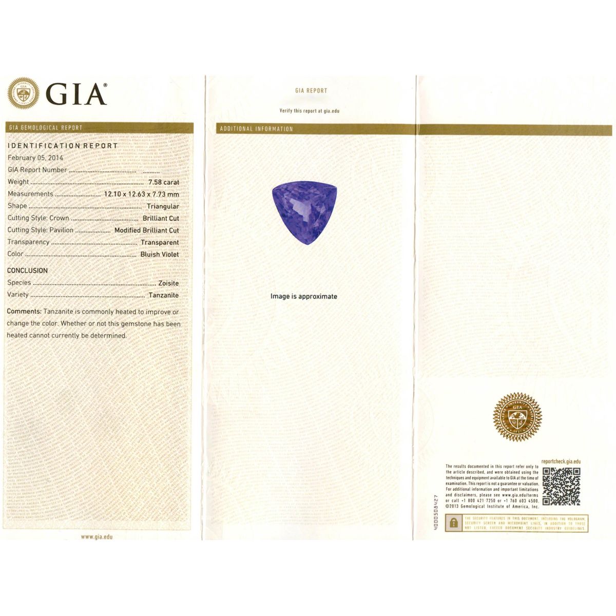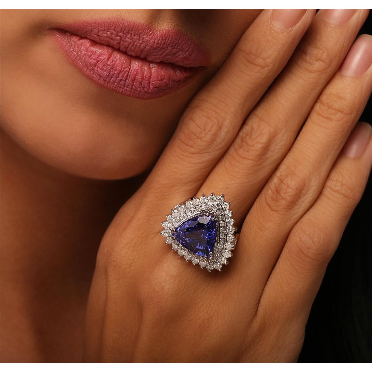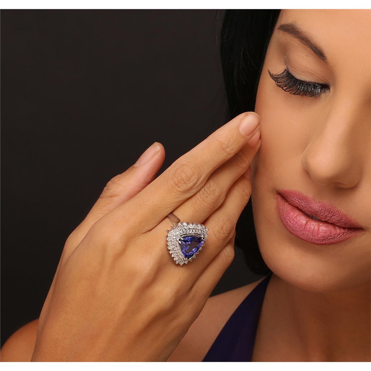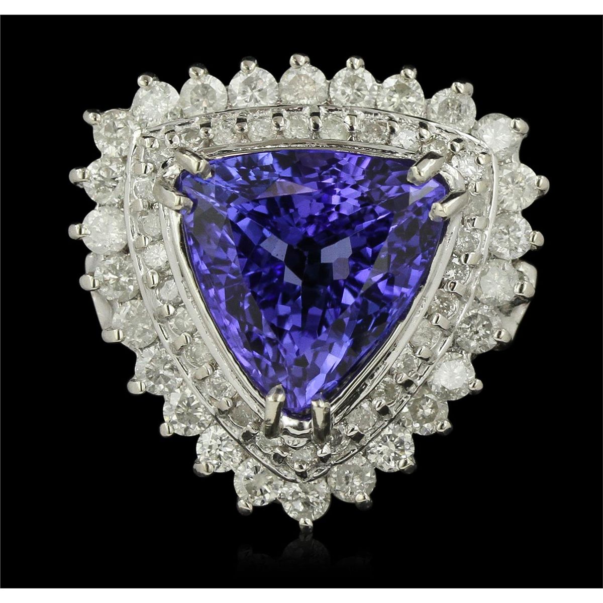 One ring featuring: 10.3 grams of 14KT white gold, (1) tanzanite with a Weight 7.58 carat. Measurements 12.10 x 12.63 x 7.73 mm. Shape Triangular. Cutting Style: Crown: Brilliant Cut. Cutting Style: Pavilion: Modified Brilliant Cut. Transparency: Transparent. Color: Bluish Violet. Conclusion: Species Zoisite, Variety Tanzanite. Adjacent Diamonds with a total weight od 1.66ctw.