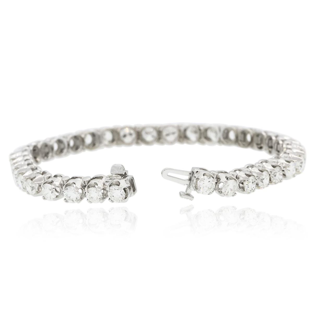 One electronically tested 14KT white gold ladies combination cast & assembled tennis bracelet with a hidden box clasp with a bright polish finish. Condition is new. Measurements: 7" in length. Identified with markings of "14K". Containing: Thirty-Five prong set round brilliant cut diamonds, measuring 3.90 - 3.90 x 2.34mm (depth est.) approximate total weight of 35 Stones = 7.60ct. Clarity: SI-1 to I-1. Color: H - J, Cut is Good. All diamonds are graded in the mounting, unless otherwise stated. Total Weight of Diamonds 7.60ct. Total Weight of Bracelet 16.10 grams. GGL Appraised at $32,335.00.