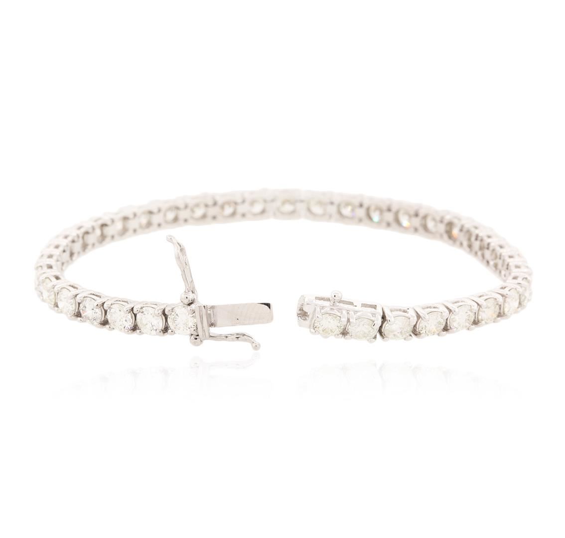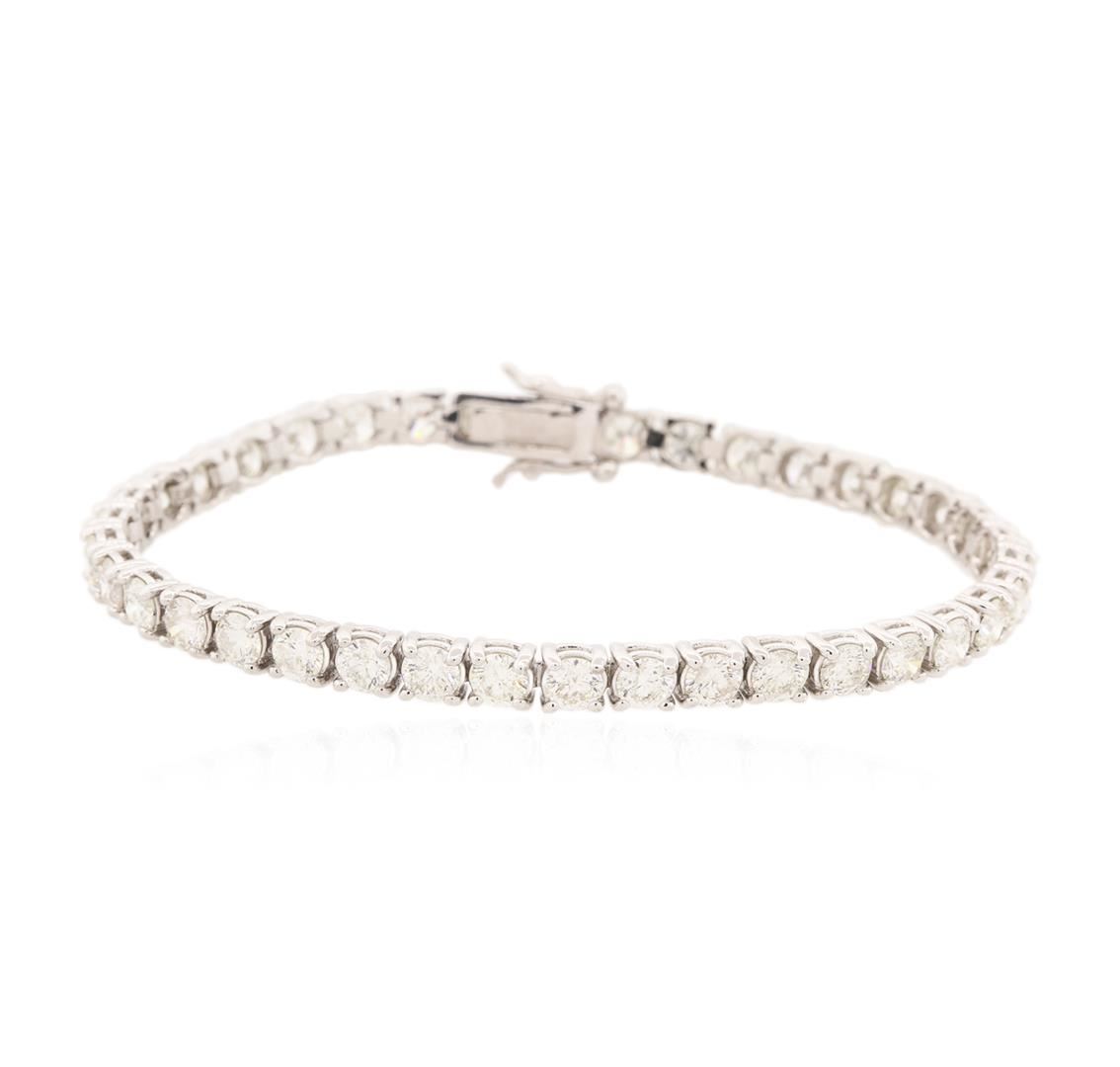 One electronically tested 14KT white gold ladies cast & assembled diamond tennis bracelet with a bright polish finish. Seven and one-quarter inch length bracelet composed of a flexible ribbon of diamonds, terminating in a concealed clasp with twin safeties. Identified with markings of "14K". Condition is new, good workmanship. Tennis bracelets & necklaces got their unusual name from an incident involving the U.S. professional tennis player Chris Evert during a tennis match in the 1980's. Evert had been wearing an expensive diamond bracelet, an inline string of individually-set diamonds. Previously these bracelets were known as eternity bracelets. When the clasp snapped during play, she asked the officials to stop the tennis match until the bracelet could be found. Since that day, bracelets and necklaces featuring an inline string of diamonds have been called tennis bracelets and tennis necklaces. Containing: Thirty-Eight prong set round brilliant cut diamonds, measuring 3.80 - 3.75 x 2.30mm (depth est.) approximate total weight of 38 Stones = 7.60ct. Graded in the setting. Clarity: SI-1 to I-1. Color: H - J. Total Weight of Diamonds 7.60ct. Total Weight of Tennis Bracelet 13.83 grams. AIG Appraised at $26,845.00.