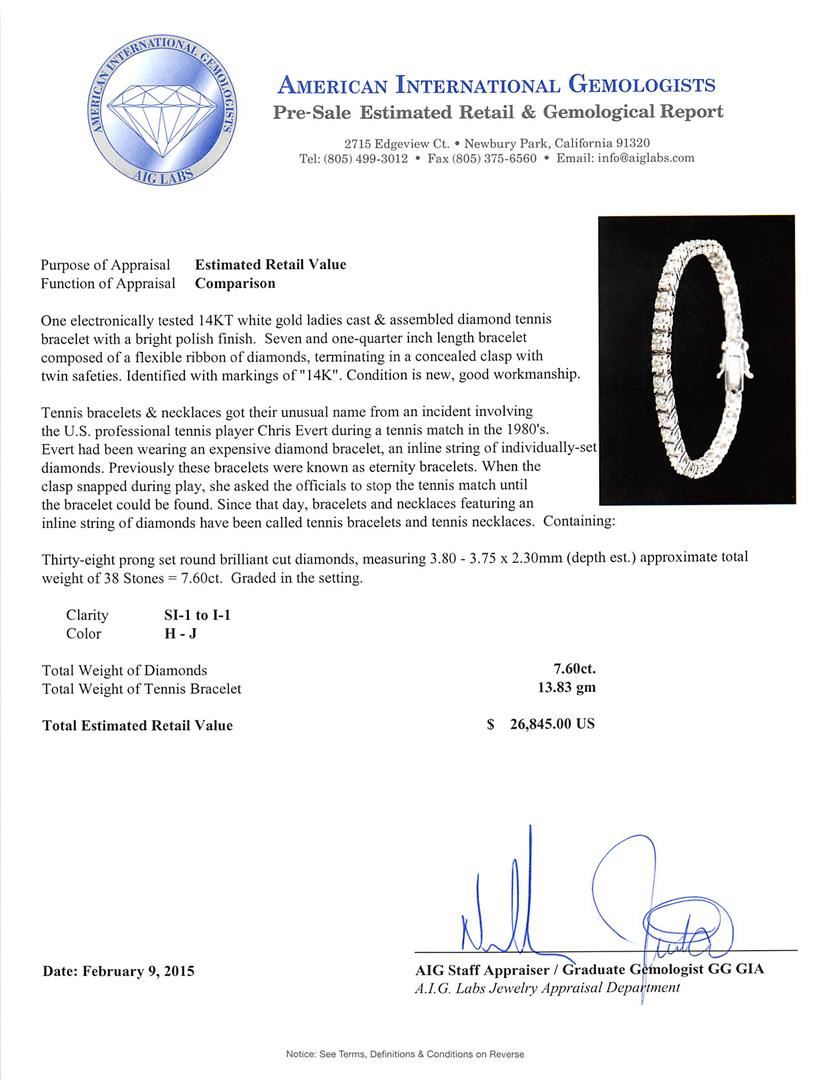 One electronically tested 14KT white gold ladies cast & assembled diamond tennis bracelet with a bright polish finish. Seven and one-quarter inch length bracelet composed of a flexible ribbon of diamonds, terminating in a concealed clasp with twin safeties. Identified with markings of "14K". Condition is new, good workmanship. Tennis bracelets & necklaces got their unusual name from an incident involving the U.S. professional tennis player Chris Evert during a tennis match in the 1980's. Evert had been wearing an expensive diamond bracelet, an inline string of individually-set diamonds. Previously these bracelets were known as eternity bracelets. When the clasp snapped during play, she asked the officials to stop the tennis match until the bracelet could be found. Since that day, bracelets and necklaces featuring an inline string of diamonds have been called tennis bracelets and tennis necklaces. Containing: Thirty-Eight prong set round brilliant cut diamonds, measuring 3.80 - 3.75 x 2.30mm (depth est.) approximate total weight of 38 Stones = 7.60ct. Graded in the setting. Clarity: SI-1 to I-1. Color: H - J. Total Weight of Diamonds 7.60ct. Total Weight of Tennis Bracelet 13.83 grams. AIG Appraised at $26,845.00.