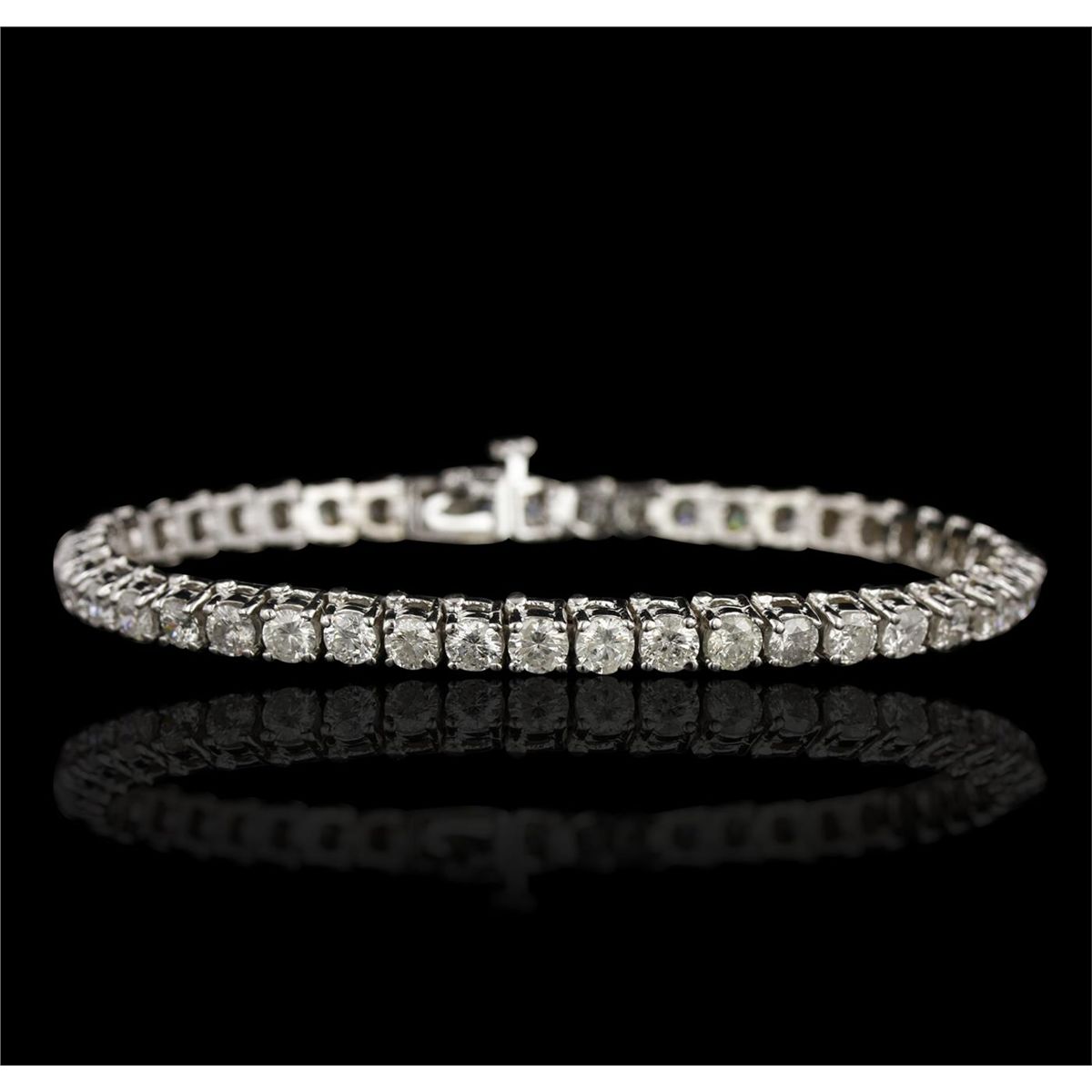 One electronically tested 14KT white gold ladies cast & assembled diamond tennis bracelet with a bright polish finish. Seven inch length bracelet composed of a flexible ribbon of diamonds, terminating in a concealed clasp with safety. Identified with markings of "14K". Condition is good. Tennis bracelets got their unusual name from an incident involving the U.S. professional tennis player Chris Evert during a tennis match in the 1980's. Evert had been wearing an expensive diamond bracelet, an inline string of individually-set diamonds. Previously these bracelets were known as eternity bracelets. When the clasp snapped during play, she asked the officials to stop the tennis match until the bracelet could be found. Since that day, bracelets featuring an inline string of diamonds have been called tennis bracelets. Containing: Forty-five prong set round brilliant cut diamonds, measuring 3.50 - 3.30 x 2.04mm (depth est.) approximate total weight of 45 Stones = 7.60ct. Graded in the setting. Clarity I-1 to 1-2. Color H - J. Total Weight of Diamonds 7.60ct. Total Weight of Tennis Bracelet 17.20gm. AIG Appraised at $19,700.00.