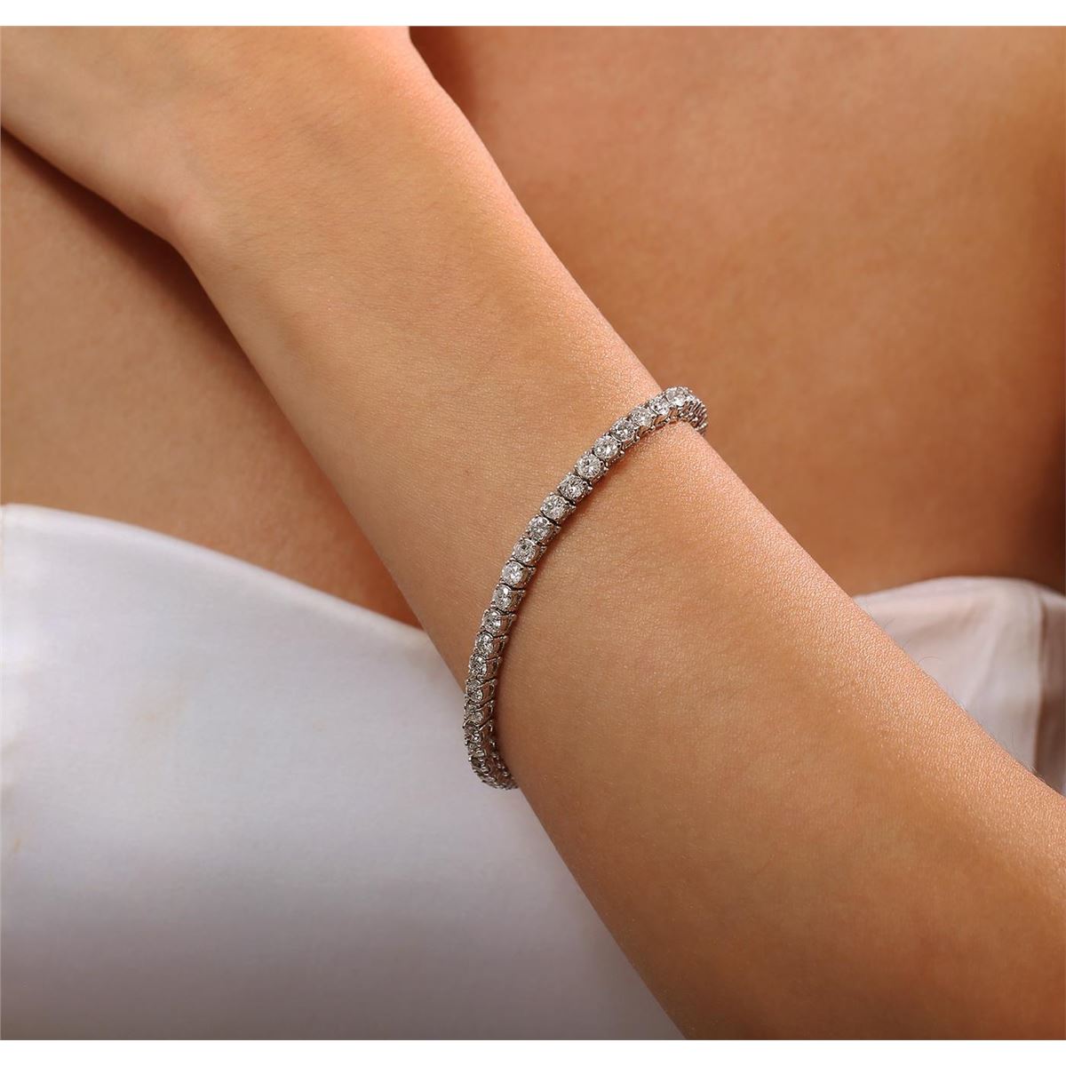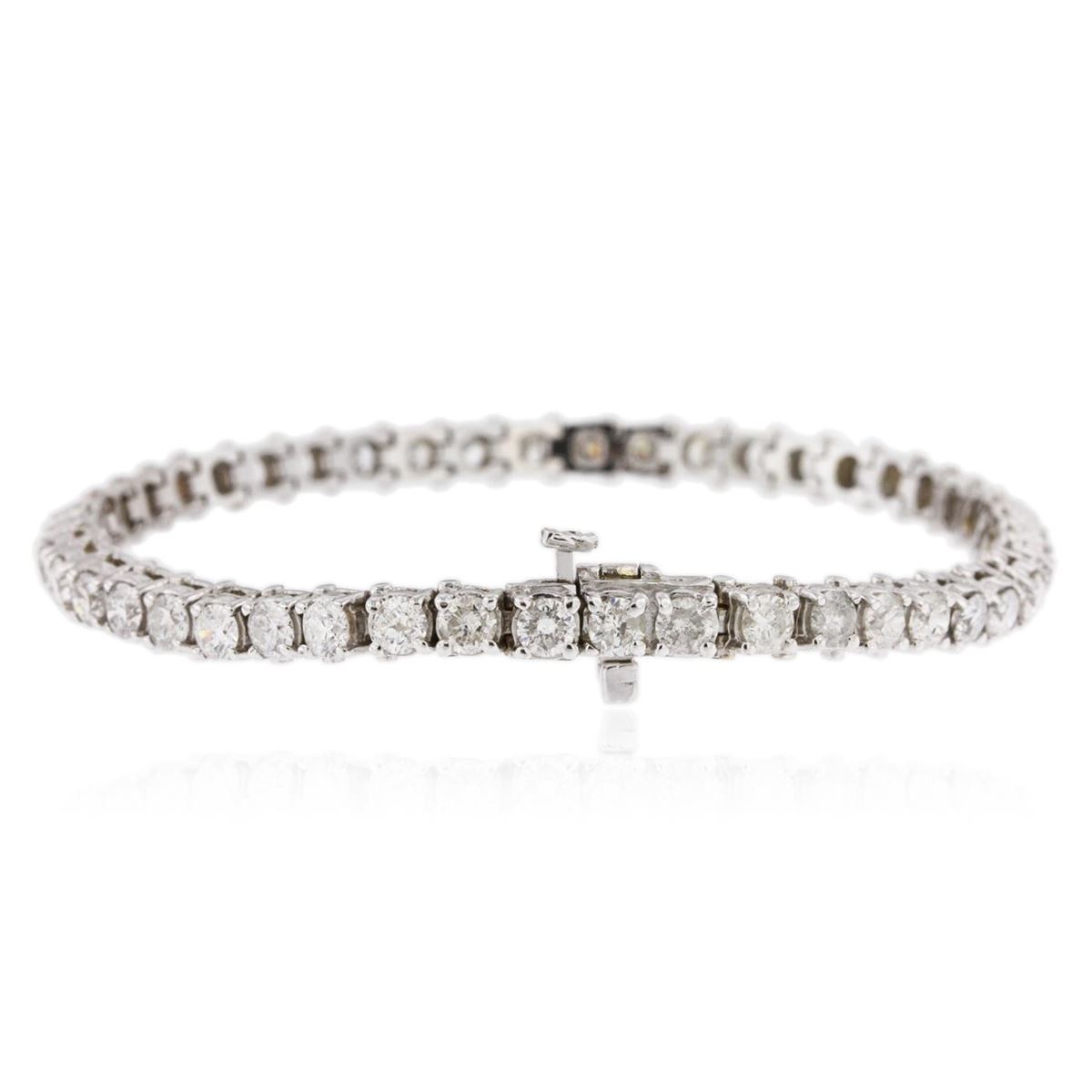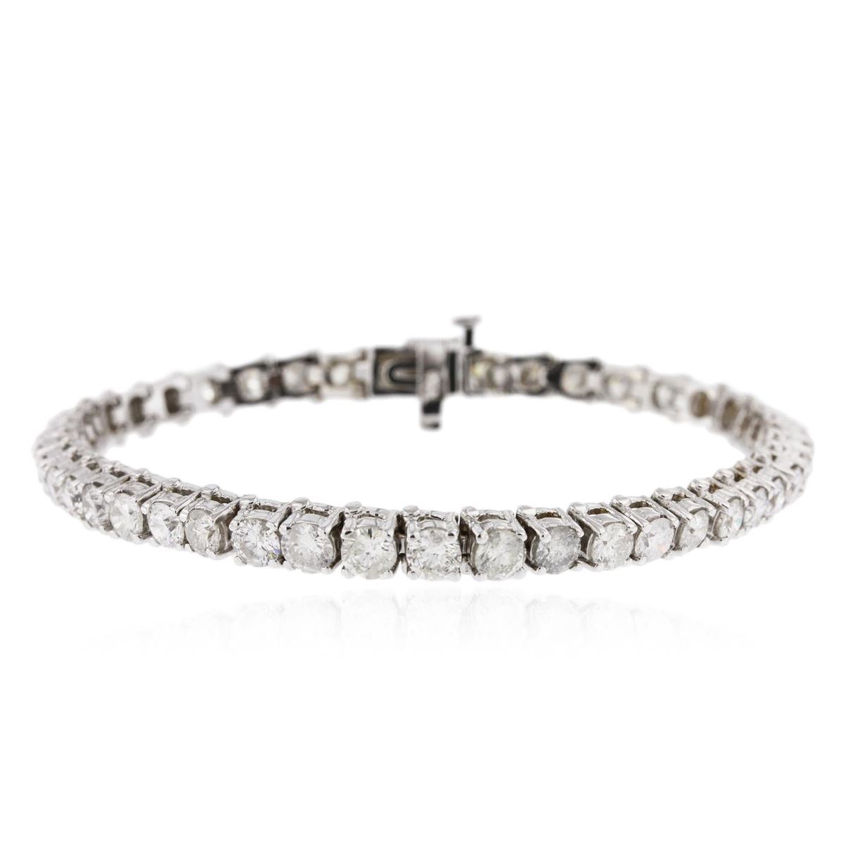 One electronically tested 14KT white gold ladies cast & assembled diamond tennis bracelet with a bright polish finish. Seven inch length bracelet composed of a flexible ribbon of diamonds, terminating in a concealed clasp with safety. Identified with markings of "14K". Condition is good. Tennis bracelets got their unusual name from an incident involving the U.S. professional tennis player Chris Evert during a tennis match in the 1980's. Evert had been wearing an expensive diamond bracelet, an inline string of individually-set diamonds. Previously these bracelets were known as eternity bracelets. When the clasp snapped during play, she asked the officials to stop the tennis match until the bracelet could be found. Since that day, bracelets featuring an inline string of diamonds have been called tennis bracelets. Containing: Forty-five prong set round brilliant cut diamonds, measuring 3.50 - 3.30 x 2.04mm (depth est.) approximate total weight of 45 Stones = 7.60ct. Graded in the setting. Clarity I-1 to 1-2. Color H - J. Total Weight of Diamonds 7.60ct. Total Weight of Tennis Bracelet 17.20gm. AIG Appraised at $19,700.00.