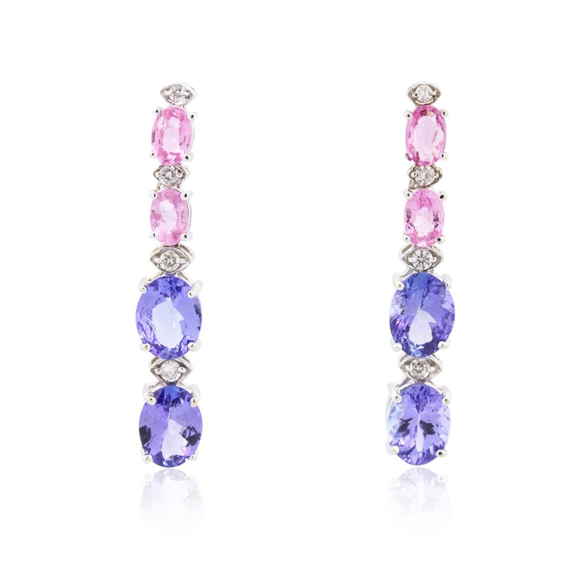 One pair electronically tested 14KT white gold ladies combination cast & assembled Tanzinite, Sapphire and Diamond dangle earrings with friction posts with a bright polish finish. Condition is new. Containing: Four prong set oval modified brilliant cut natural tanzanites, measuring 8.40 x 6.70 x 4.80mm, approximate total weight of 7.60ct., clarity is eye clean, type I, medium light, slightly grayish, violet color, (GIA V 4/2), cut is good. Four prong set oval modified brilliant cut natural pink sapphires, measuring 5.80 x 4.20 x 2.70mm, approximate total weight of 2.20ct., clarity is slightly included, type II, light, very slightly grayish, reddish purple color, (GIA rP 3/3), cut is good. Six prong set round brilliant cut diamonds, measuring 1.30 - 1.30 x 0.78mm (depth est.) approximate total weight of 6 Stones = 0.05ct. Clarity: SI-1 to SI-2. Color: I - J, Cut is Good. All diamonds and colored gemstones are graded in the mounting, unless otherwise stated. Colored gemstones are presumed to have been subjected to commonly used enhancement processes. Total Weight of Colored Stones 9.80ct. Total Weight of Diamonds 0.05ct. Total Weight of Dangle Earrings 5.60 grams. GGL Appraised at $7,490.00.