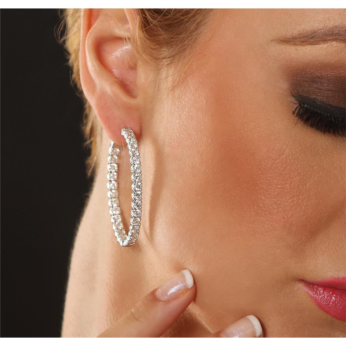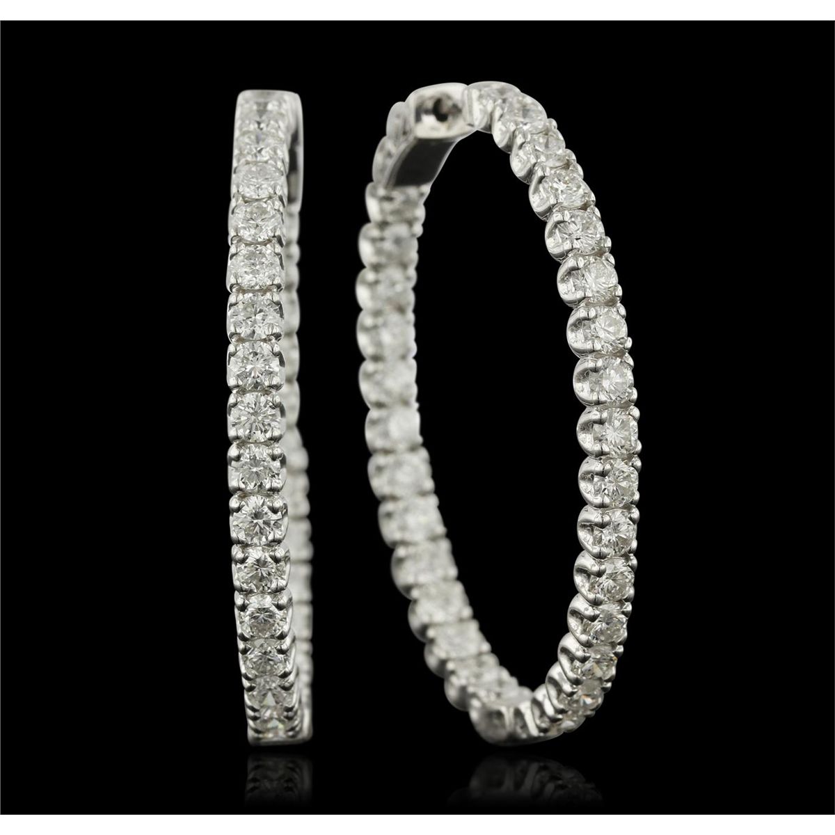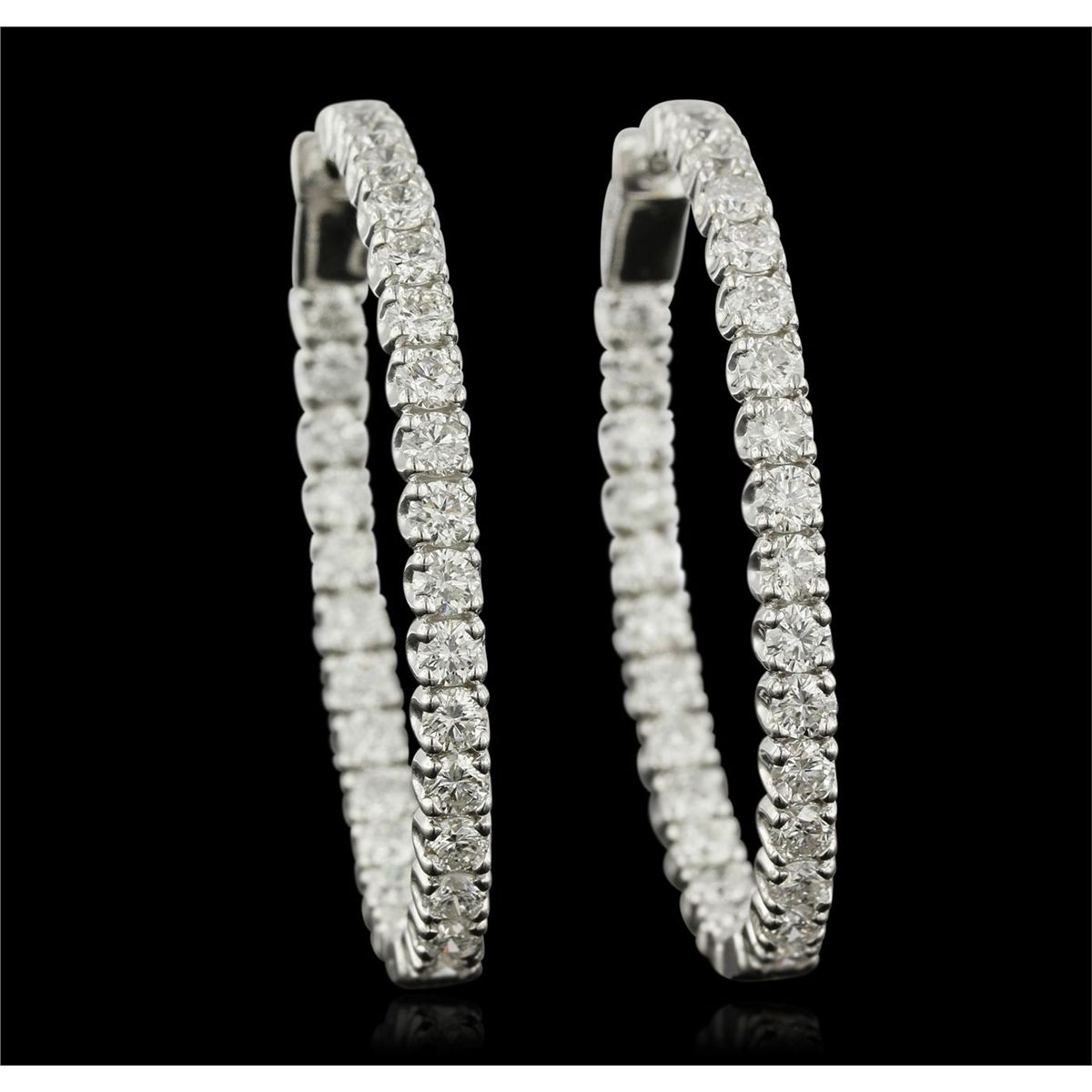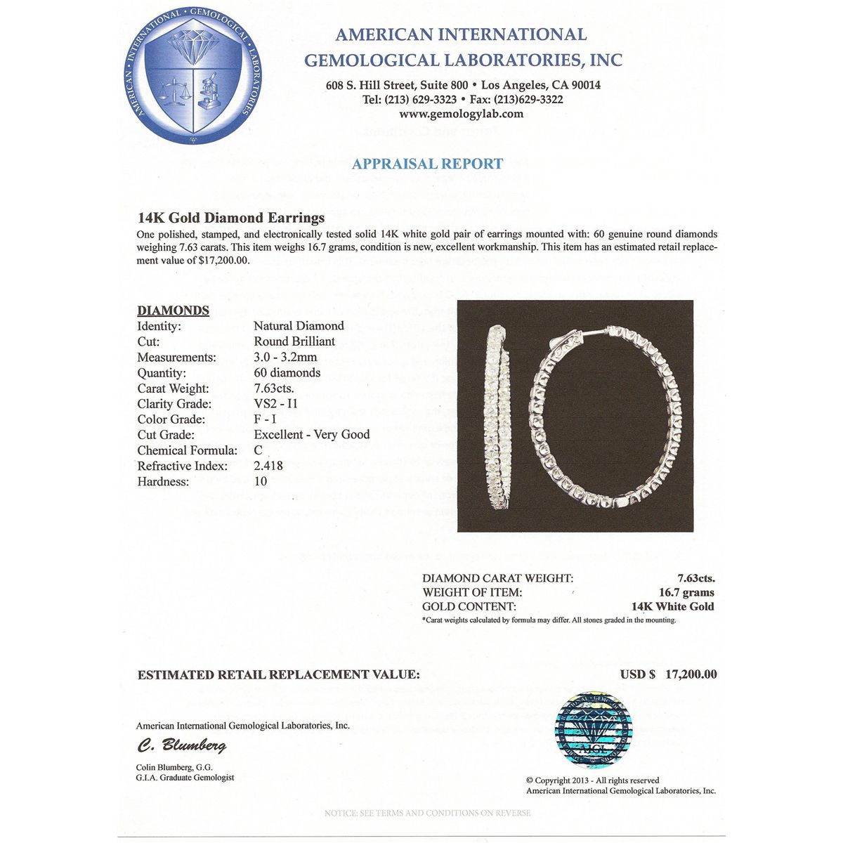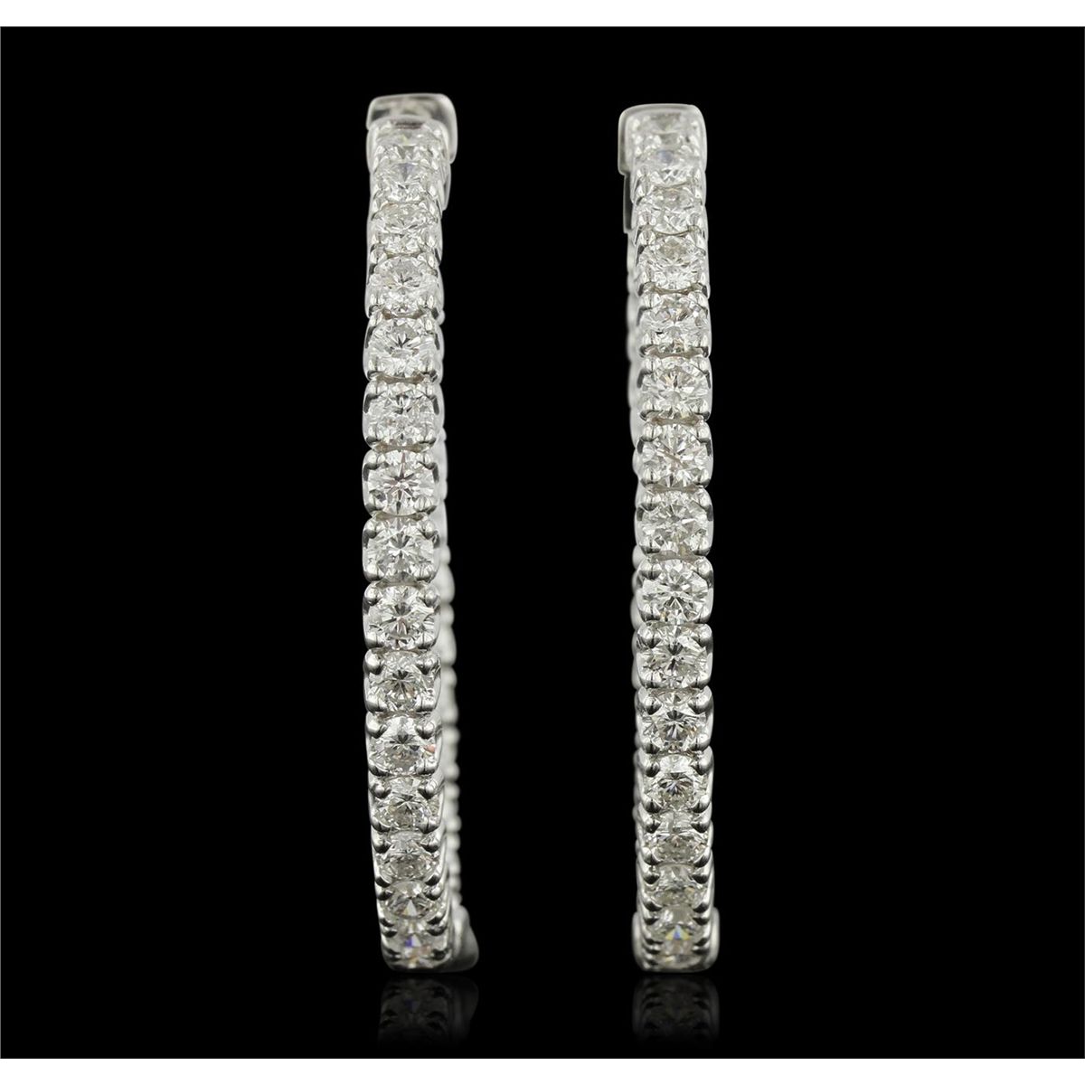 One polished, stamped, and electronically tested solid 14KT White Gold pair of earrings mounted with: 60 genuine round diamonds weighing 7.63 carats. This item weighs 16.7 grams, condition is new, excellent workmanship. AIGL Appraised at $17,200.00.