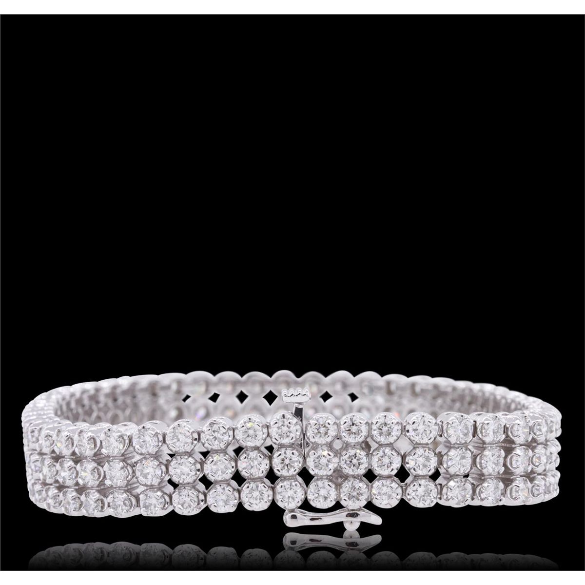 One electronically tested 14KT white gold ladies cast & assembled diamond bracelet with a bright polish finish. Seven inch length bracelet features three flexible diamond ribbons, terminating in a concealed clasp with safety. Identified with markings of 14K. Condition is new, good workmanship. Containing: One Hundred Fifty-Nine prong set round brilliant cut diamonds, measuring 2.40 - 2.30 x 1.41mm (depth est.) approximate total weight of 159 Stones = 7.65ct. Graded in the setting. Clarity: SI-1 to I-1. Color: G - I. Total Weight of Diamonds 7.65ct. Total Weight of Bracelet 32.06 grams. AIG Appraised at $27,760.00.