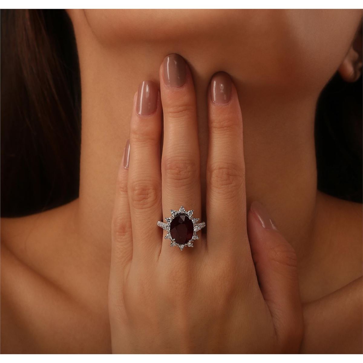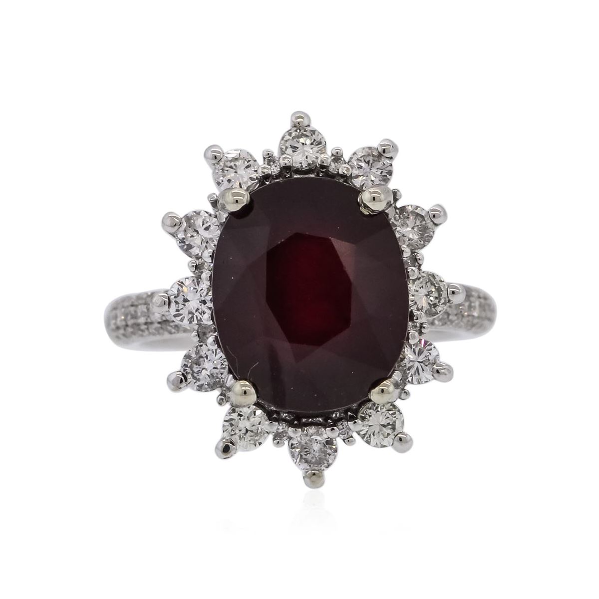 One electronically tested 14KT white gold ladies cast ruby and diamond ring with a bright polish finish. Condition is new, good workmanship. The featured ruby is set within a diamond bezel supported by diamond set shoulders, completed by a two and one-half millimeter wide band. Trademark is PMI. Identified with markings of "14K". Containing: One prong set oval mixed cut natural ruby, measuring 12.20 x 9.90 x 7.20mm, 10%. bulge factor, approximate weight of 7.74ct., clarity is heavily included, type II, dark, very slightly brownish, slightly purplish red color, (GIA slpR 7/3), cut is good. Transmitting light somewhat diffusely, transparent to translucent. Naturally occurring internal & external characteristics are present. Indications of laboratory high temperature heat treatment, with glass & flux additives. Graded in the setting. Ruby has a low tolerance to rhodium plating, repolishing the surface, & ultrasonic cleaning. Twelve prong set round brilliant cut diamonds, measuring 2.50 - 2.50 x 1.50mm (depth est.) approximate. Total Weight of 12 Stones = 0.78ct. The color grade reflects the entire range of color for this group. Graded in the setting. Clarity: SI-1 to I-1. Color: G - J Fifty-Six pav‚ & prong set round brilliant cut diamonds, measuring 1.20 - 1.10 x 0.69mm (depth est.) approximate. Total Weight of 56 Stones = 0.40ct. Graded in the setting. Clarity: SI-2 to I-2. Color: G - I. Total Weight of Colored Stones 7.74ct. Total Weight of Diamonds 1.18ct. Total Weight of Ring 7.16 grams. AIG Appraised at $6,180.00.