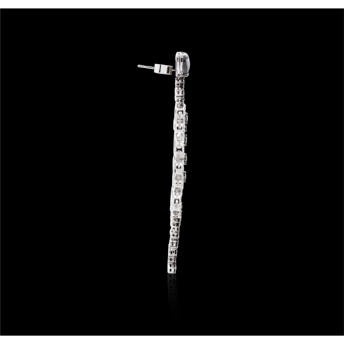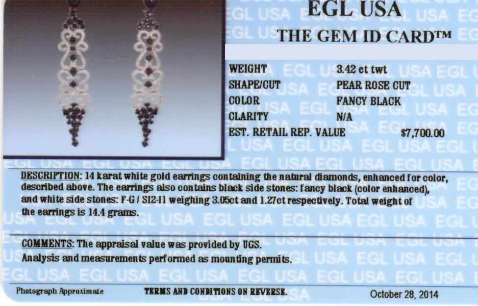 One 14KT white gold earrings containing two pear rose cut fancy black diamonds, enhanced for color, with a total weight of 3.42ct. The earrings also contain diamonds: fancy black (color enhanced) and white side stones: F-G / SI2-I1 weighing 3.05ct and 1.27ct respectively. Total weight of the earrings is 14.40 grams. EGL USA Appraised.