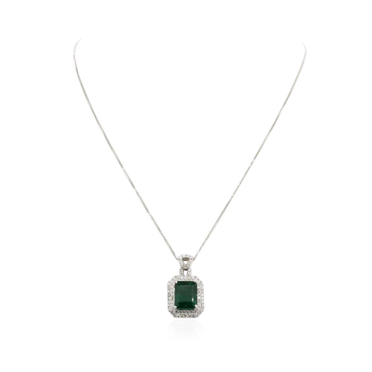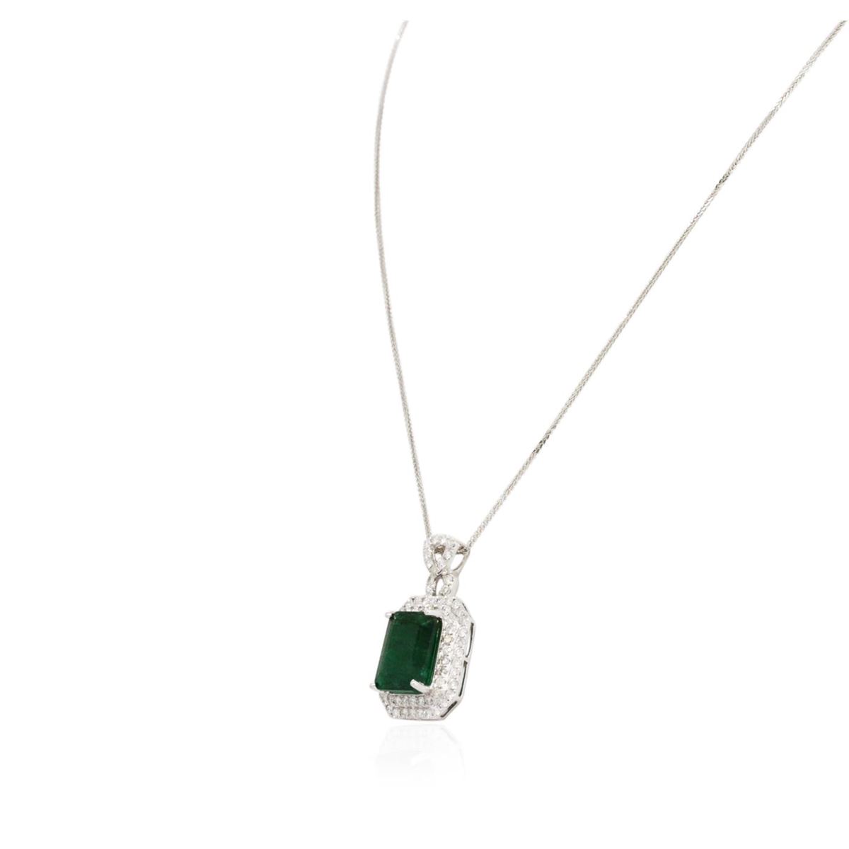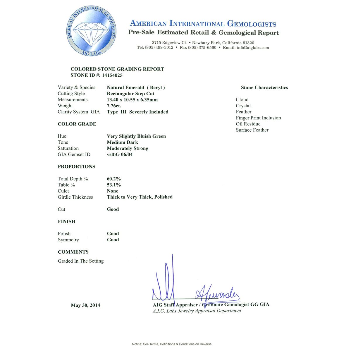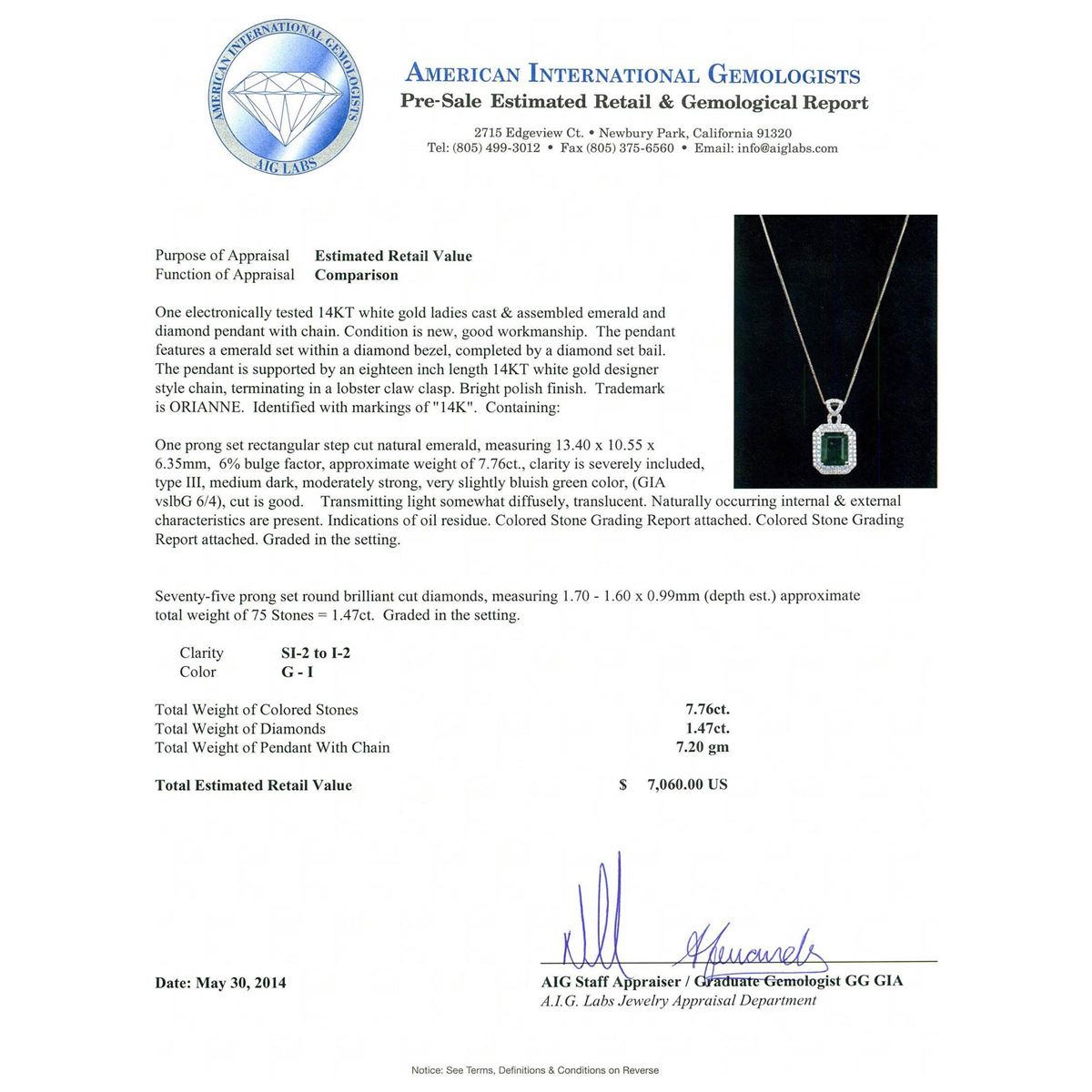 One electronically tested 14KT white gold ladies cast & assembled emerald and diamond pendant with chain. Condition is new, good workmanship. The pendant features a emerald set within a diamond bezel, completed by a diamond set bail. The pendant is supported by an eighteen inch length 14KT white gold designer style chain, terminating in a lobster claw clasp. Bright polish finish. Trademark is ORIANNE. Identified with markings of "14K". Containing: One prong set rectangular step cut natural emerald, measuring 13.40 x 10.55 x 6.35mm, 6%. bulge factor, approximate weight of 7.76ct., clarity is severely included, type III, medium dark, moderately strong, very slightly bluish green color, (GIA vslbG 6/4), cut is good. Transmitting light somewhat diffusely, translucent. Naturally occurring internal & external characteristics are present. Indications of oil residue. Colored Stone Grading Report attached. Colored Stone Grading Report attached. Graded in the setting. Seventy-Five prong set round brilliant cut diamonds, measuring 1.70 - 1.60 x 0.99mm (depth est.) approximate. Total Weight of 75 Stones = 1.47ct. Graded in the setting. Clarity: SI-2 to I-2. Color: G - I. Total Weight of Colored Stones 7.76ct. Total Weight of Diamonds 1.47ct. Total Weight of Pendant With Chain 7.20 grams. AIG Appraised at $7,060.00.