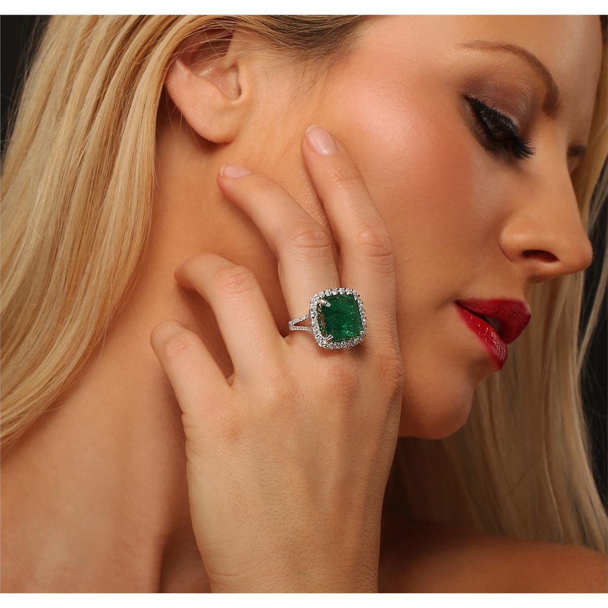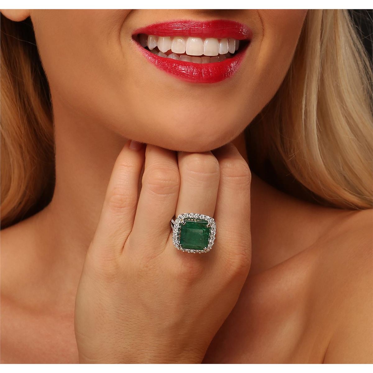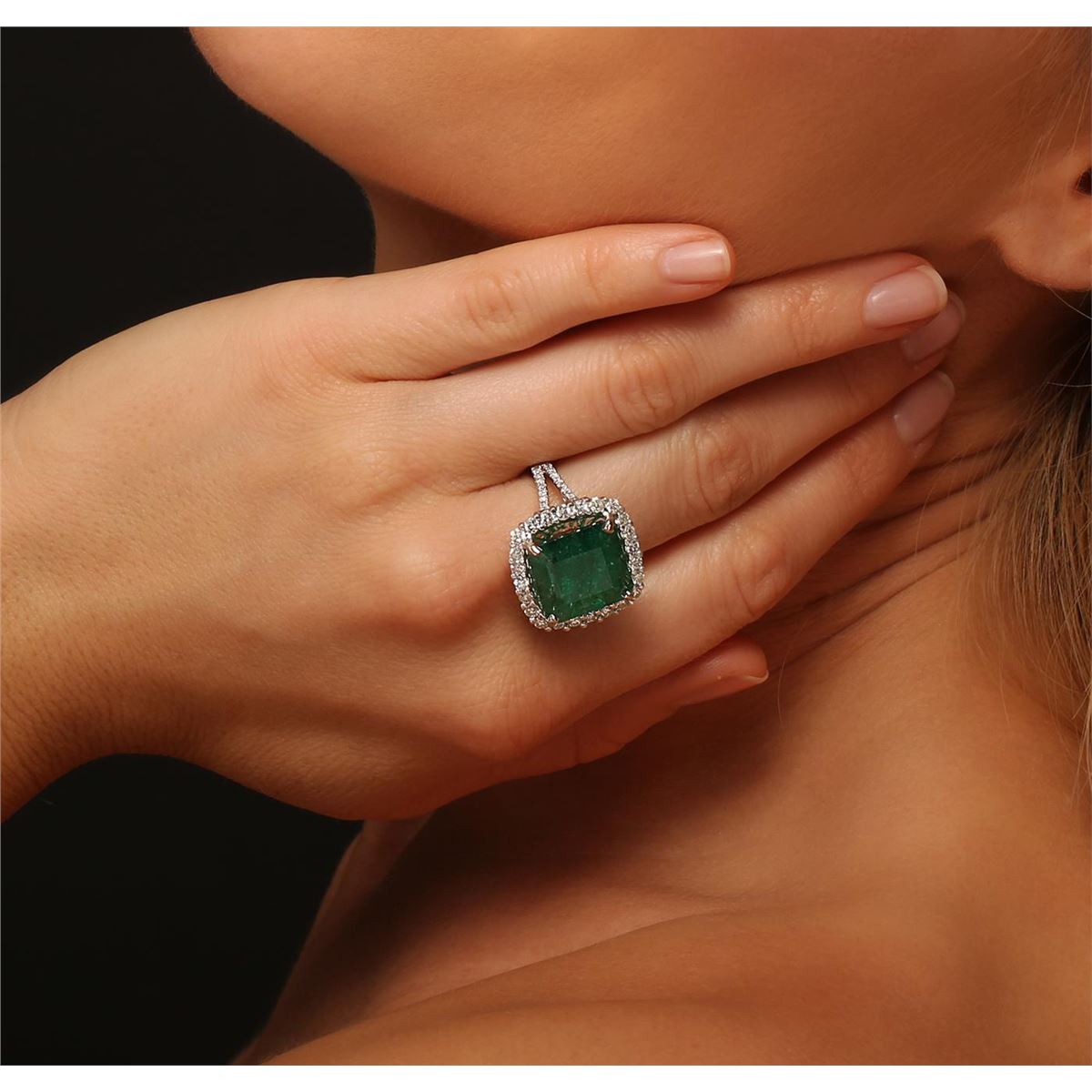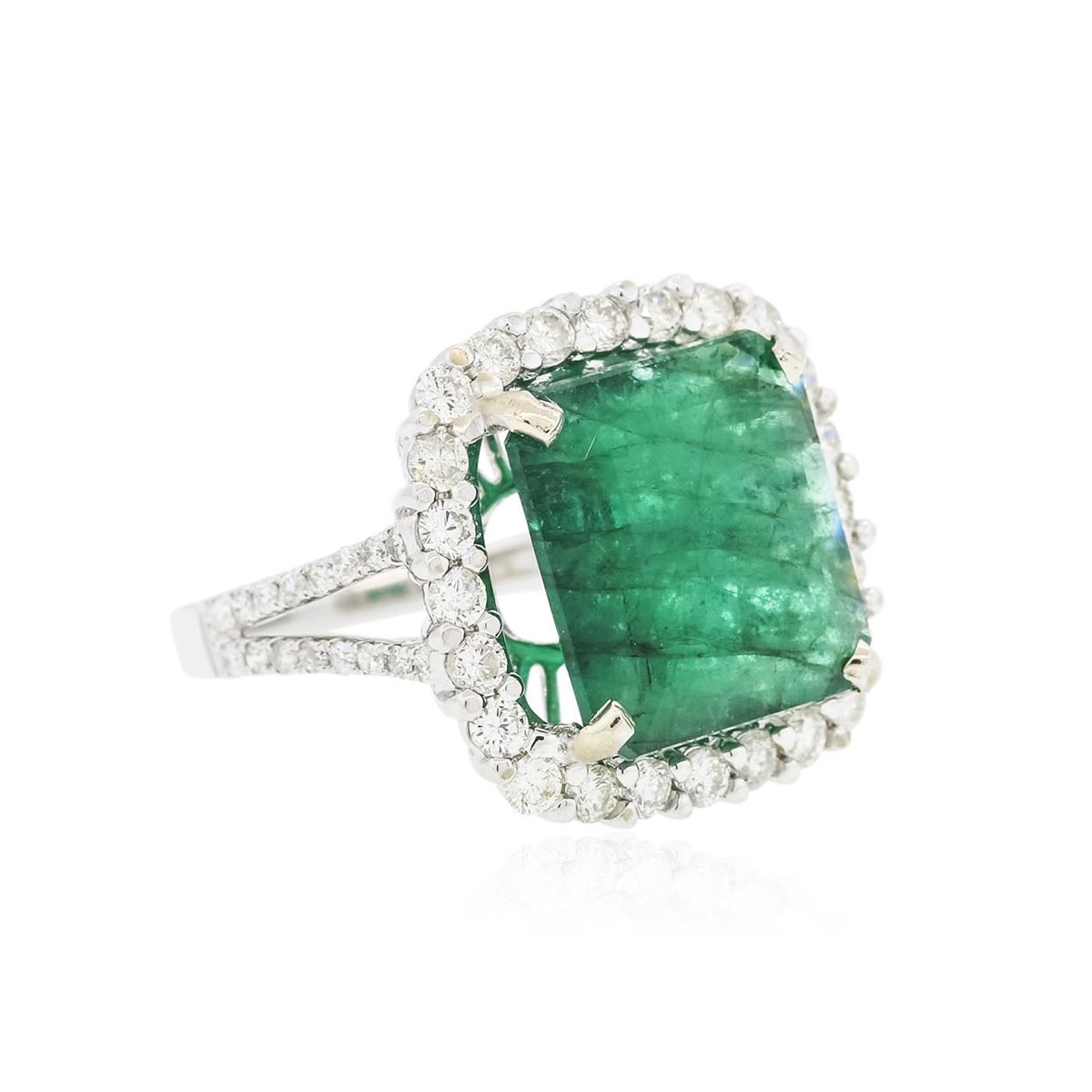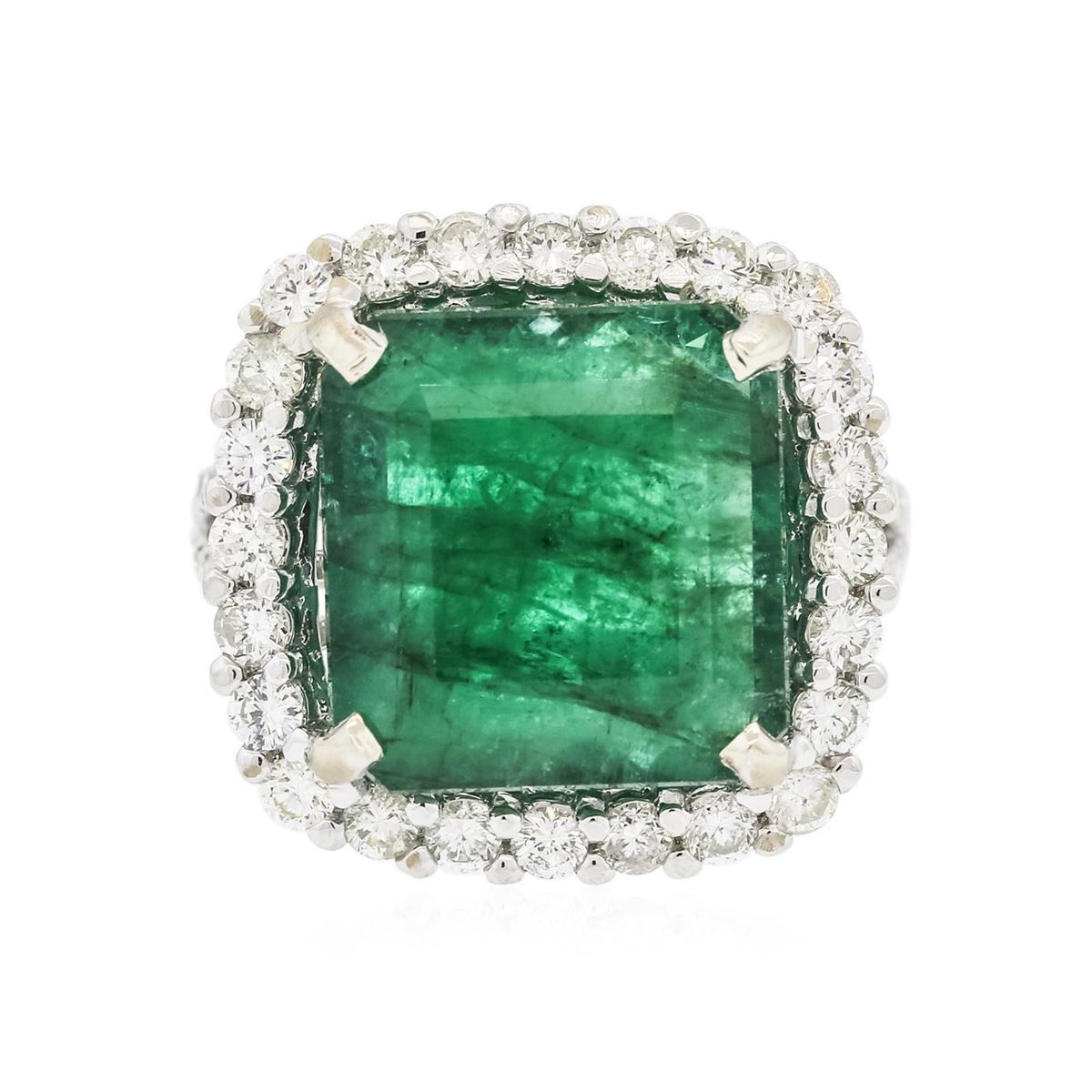 One electronically tested 14KT white gold ladies combination cast & assembled ring with a bright polish finish. Condition is new. Identified with markings of "14K". Containing: One prong set emerald standard step cut natural emerald, measuring 14.00 x 14.00 x 5.40mm, approximate weight of 7.77ct., clarity is heavily included, type III, medium, moderately strong, green color, (GIA G 5/4), cut is good. Thirty-Two prong set round brilliant cut diamonds, measuring 1.30 - 1.30 x 0.78mm (depth est.) approximate total weight of 32 Stones = 0.26ct. Clarity: I-1 to I-2. Color: H - I, Cut is Good. Twenty-Four prong set round brilliant cut diamonds, measuring 2.20 - 2.20 x 1.32mm (depth est.) approximate total weight of 24 Stones = 0.93ct. Clarity: SI-1 to SI-2. Color: J - K, Cut is Good. Total Weight of Colored Stones 7.77ct. Total Weight of Diamonds 1.19ct. Total Weight of Ring 7.50 grams. GGL Appraised at $13,760.00.