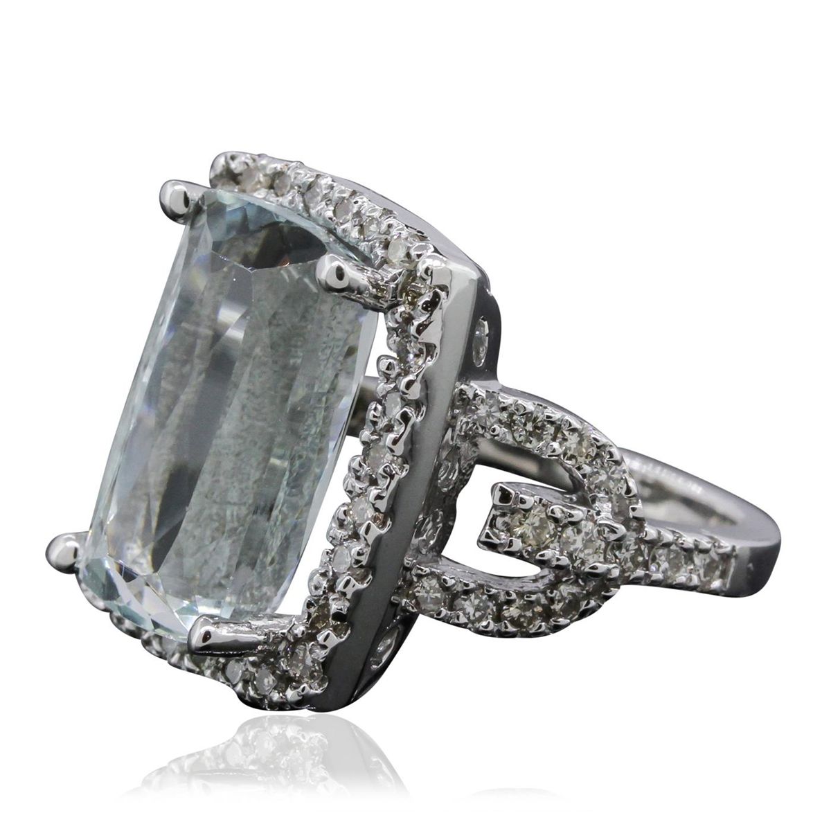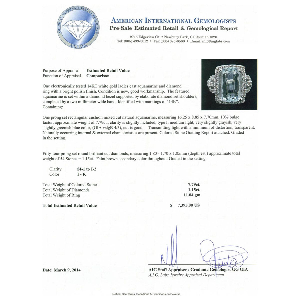 One electronically tested 14KT white gold ladies cast aquamarine and diamond ring with a bright polish finish. Condition is new, good workmanship. The featured aquamarine is set within a diamond bezel supported by elaborate diamond set shoulders, completed by a two millimeter wide band. Identified with markings of "14K". Containing: One prong set rectangular cushion mixed cut natural aquamarine, measuring 16.25 x 8.85 x 7.70mm, 10%. bulge factor, approximate weight of 7.79ct., clarity is slightly included, type I, medium light, very slightly grayish, very slightly greenish blue color, (GIA vslgB 4/3), cut is good. Transmitting light with a minimum of distortion, transparent. Naturally occurring internal & external characteristics are present. Colored Stone Grading Report attached. Graded in the setting. Fifty-Four prong set round brilliant cut diamonds, measuring 1.80 - 1.70 x 1.05mm (depth est.) approximate. Total Weight of 54 Stones = 1.15ct. Faint brown secondary color throughout. Graded in the setting. Clarity: SI-1 to I-2. Color: I - K. Total Weight of Colored Stones 7.79ct. Total Weight of Diamonds 1.15ct. Total Weight of Ring 11.04 grams. AIG Appraised at $7,395.00.