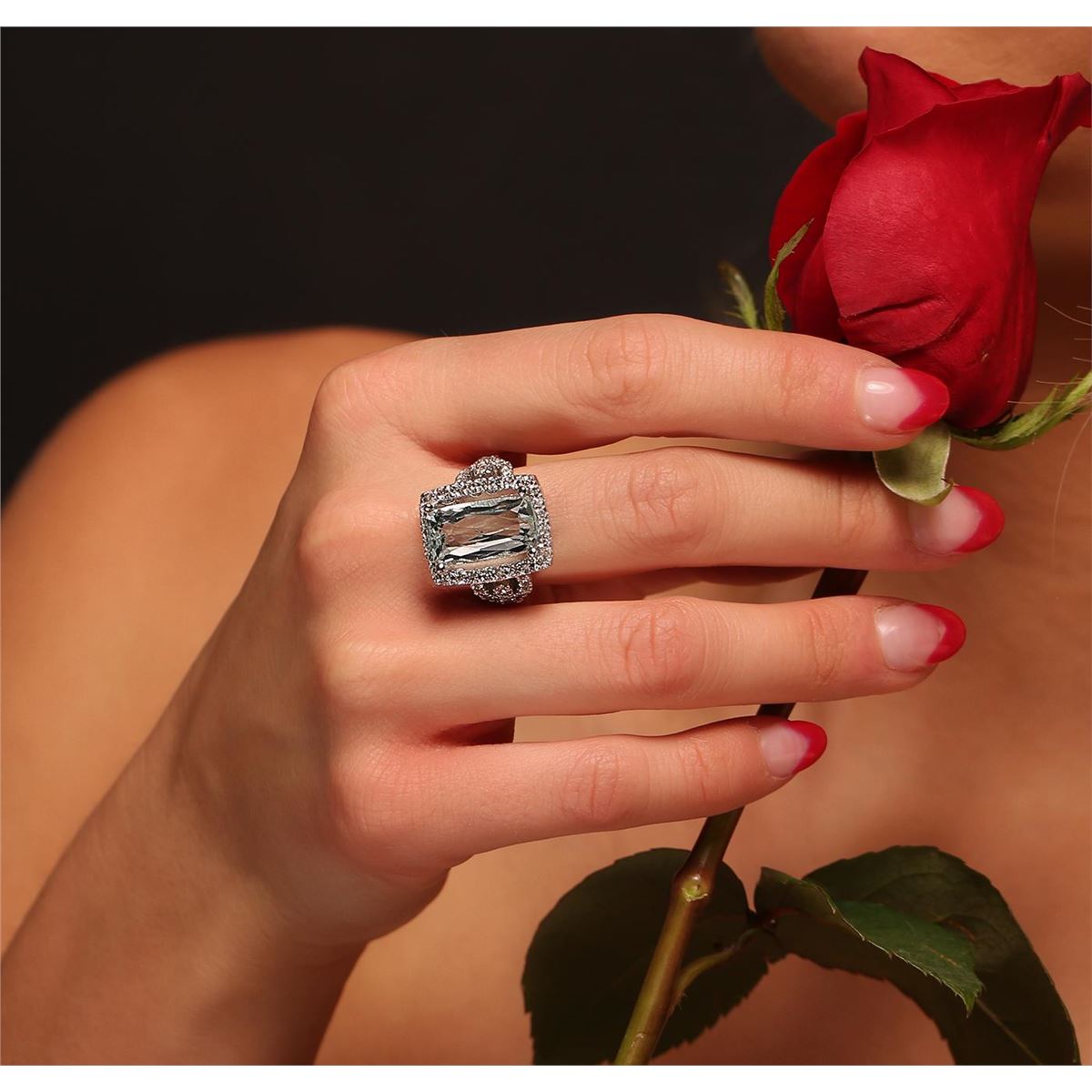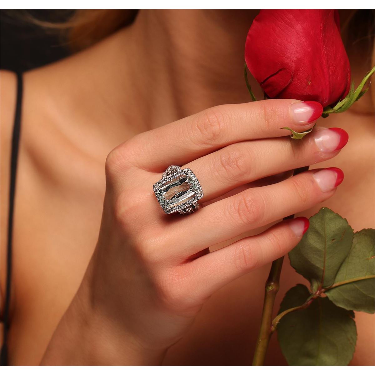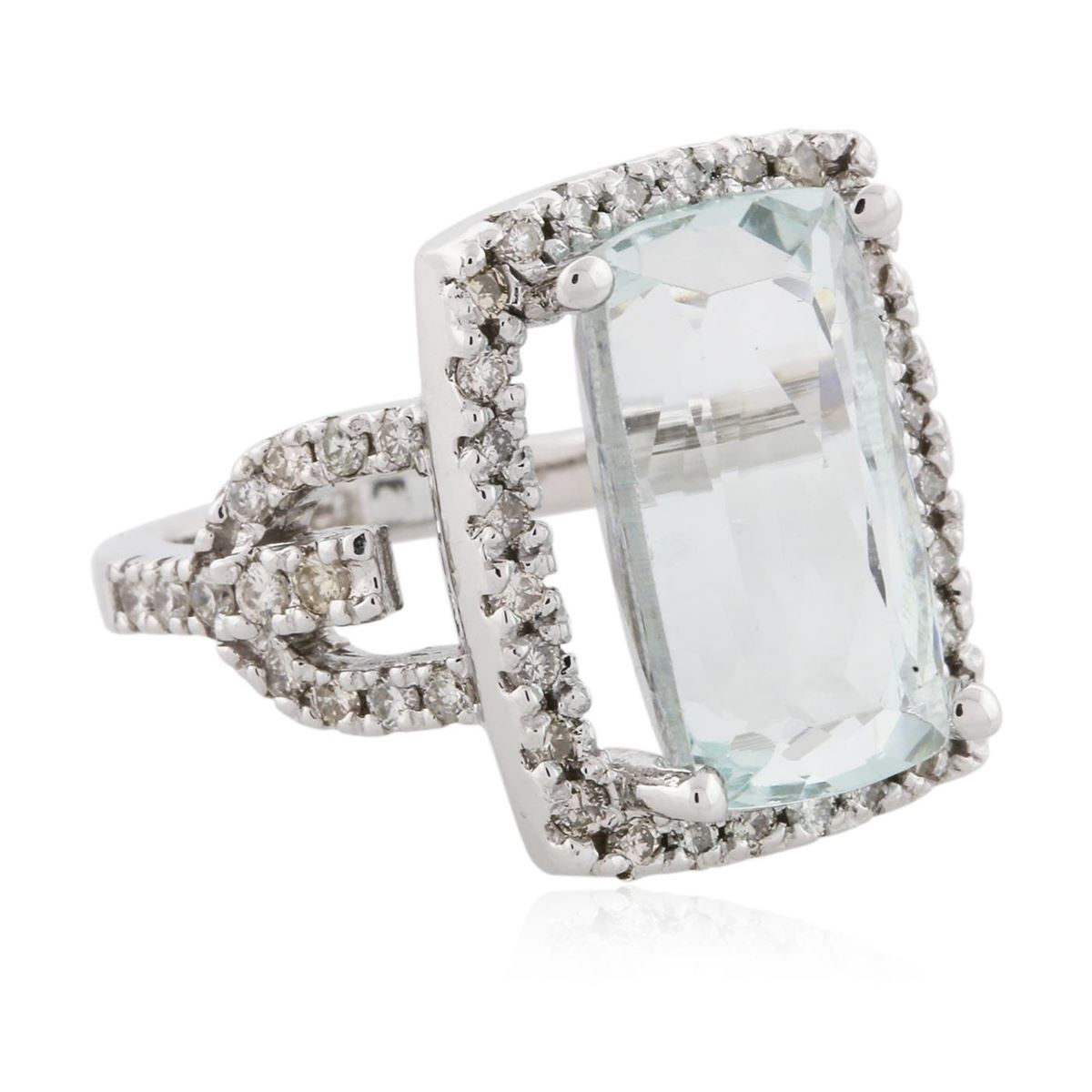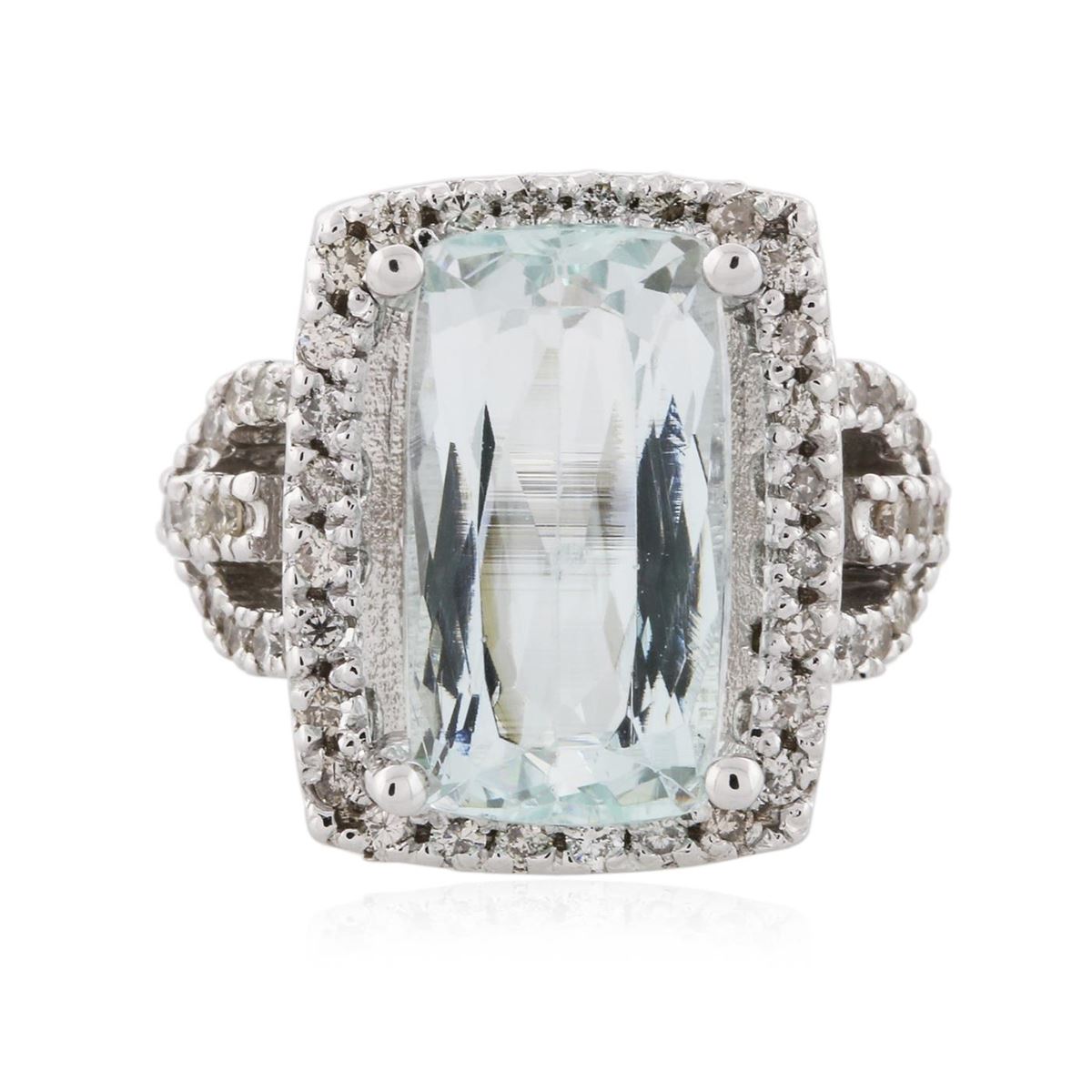 One electronically tested 14KT white gold ladies cast aquamarine and diamond ring with a bright polish finish. Condition is new, good workmanship. The featured aquamarine is set within a diamond bezel supported by elaborate diamond set shoulders, completed by a two millimeter wide band. Identified with markings of "14K". Containing: One prong set rectangular cushion mixed cut natural aquamarine, measuring 16.25 x 8.85 x 7.70mm, 10%. bulge factor, approximate weight of 7.79ct., clarity is slightly included, type I, medium light, very slightly grayish, very slightly greenish blue color, (GIA vslgB 4/3), cut is good. Transmitting light with a minimum of distortion, transparent. Naturally occurring internal & external characteristics are present. Colored Stone Grading Report attached. Graded in the setting. Fifty-Four prong set round brilliant cut diamonds, measuring 1.80 - 1.70 x 1.05mm (depth est.) approximate. Total Weight of 54 Stones = 1.15ct. Faint brown secondary color throughout. Graded in the setting. Clarity: SI-1 to I-2. Color: I - K. Total Weight of Colored Stones 7.79ct. Total Weight of Diamonds 1.15ct. Total Weight of Ring 11.04 grams. AIG Appraised at $7,395.00.