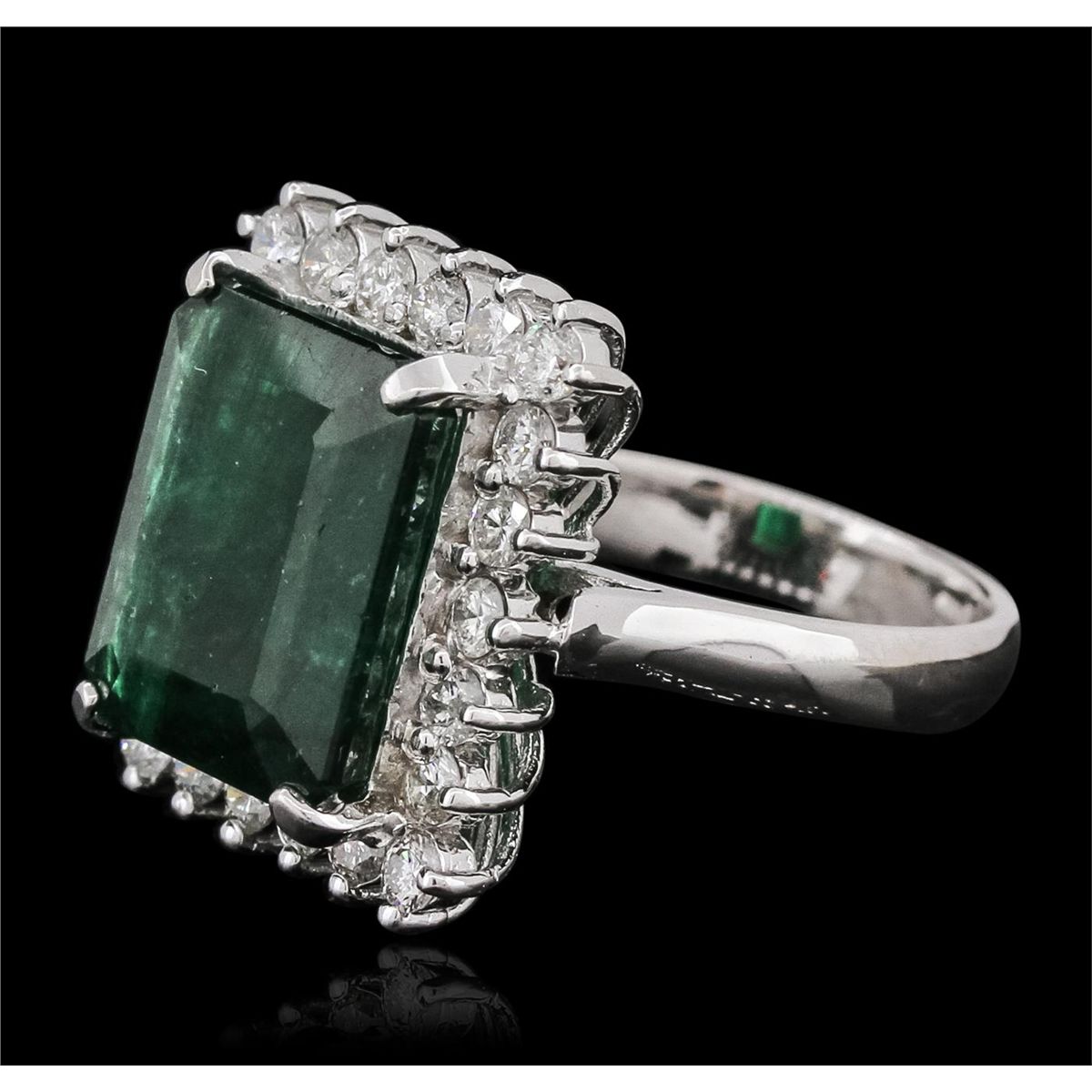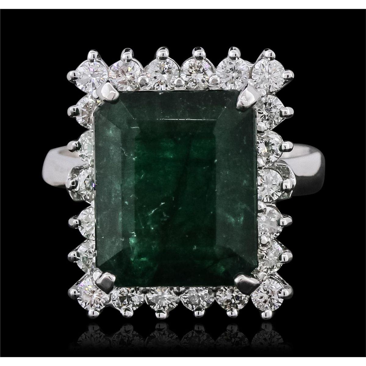 One electronically tested 14KT white gold ladies cast emerald and diamond ring with a bright polish finish. The featured emerald is set within a diamond bezel, completed by a three millimeter wide band. Identified with markings of "14K". Condition is new, good workmanship. Containing: One prong set rectangular step cut natural emerald, measuring 13.10 x 10.90 x 6.25mm, 8% bulge factor, approximate weight of 7.86ct., clarity is heavily included, type III, dark, moderately strong, green color, (GIA G 7/4), cut is good. Transmitting light somewhat diffusely, transparent to translucent. Naturally occurring internal & external characteristics are present. Colored Stone Grading Report attached. Indications of oil residue. Graded in the setting. Twenty-Two prong set round brilliant cut diamonds, measuring 2.30 - 2.20 x 1.35mm (depth est.) approximate total weight of 22 Stones = 1.01ct. Graded in the setting. Clarity: SI-1 to I-1. Color: G - I. Total Weight of Colored Stones 7.86ct. Total Weight of Diamonds 1.01ct. Total Weight of Ring 7.21 grams. AIG Appraised at $19,250.00.