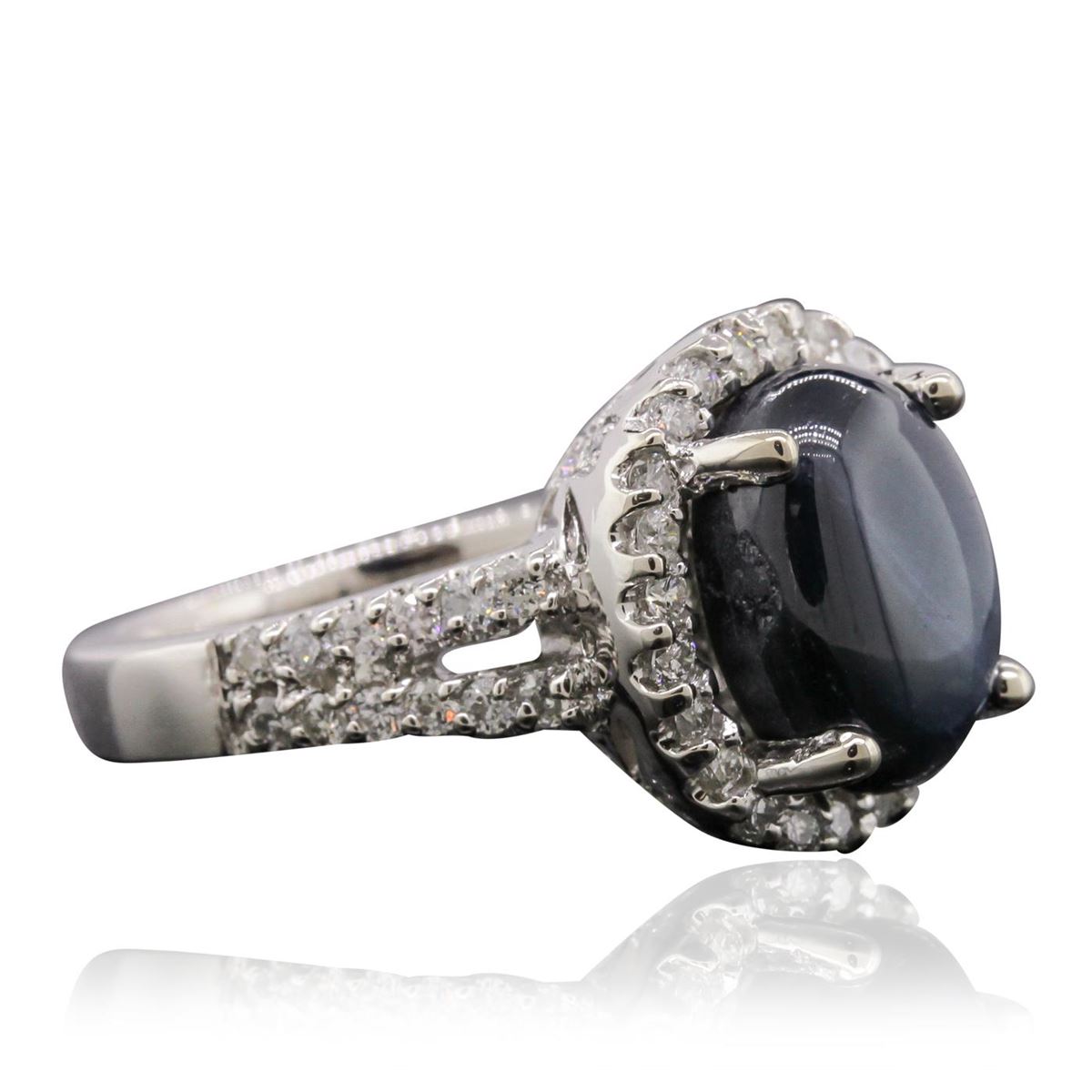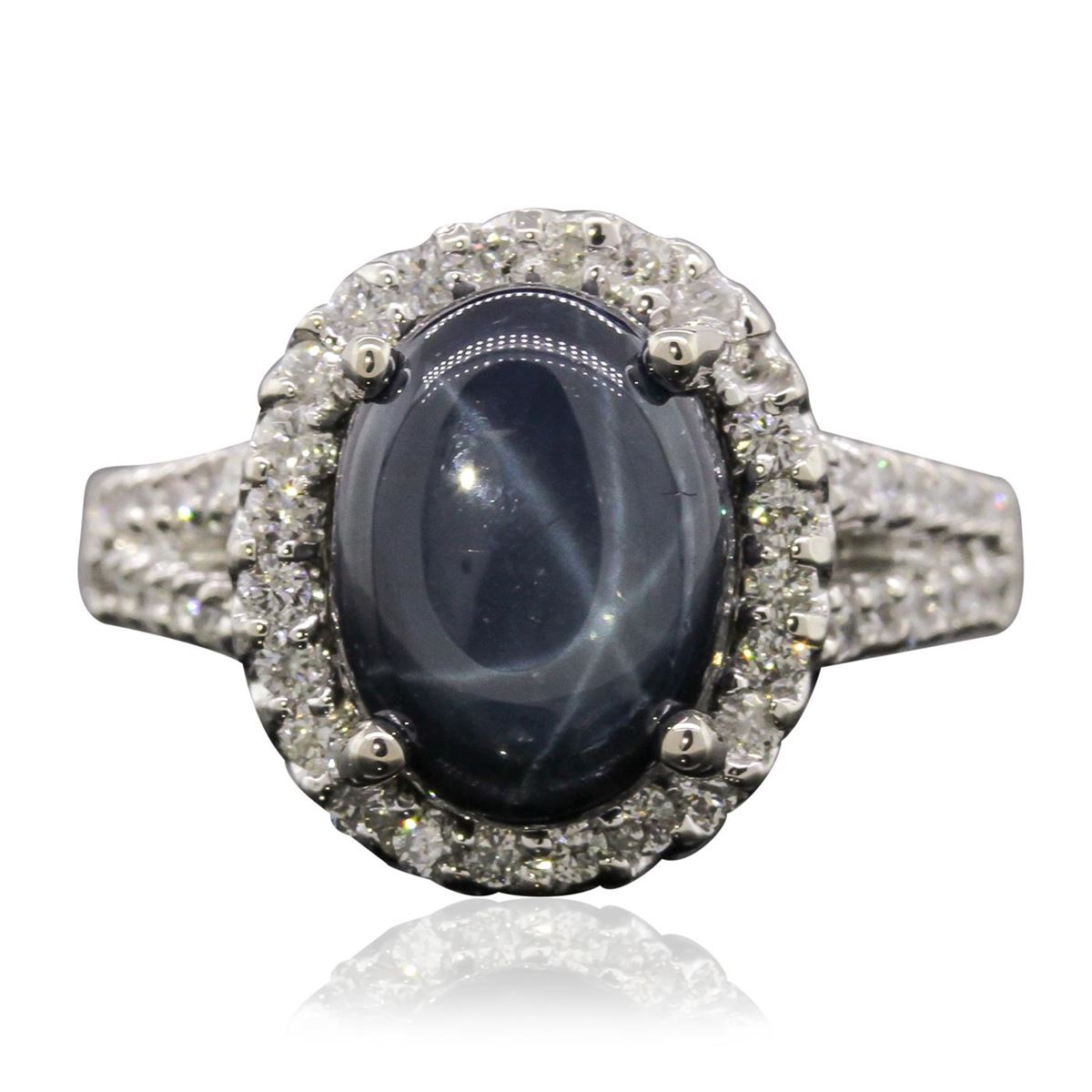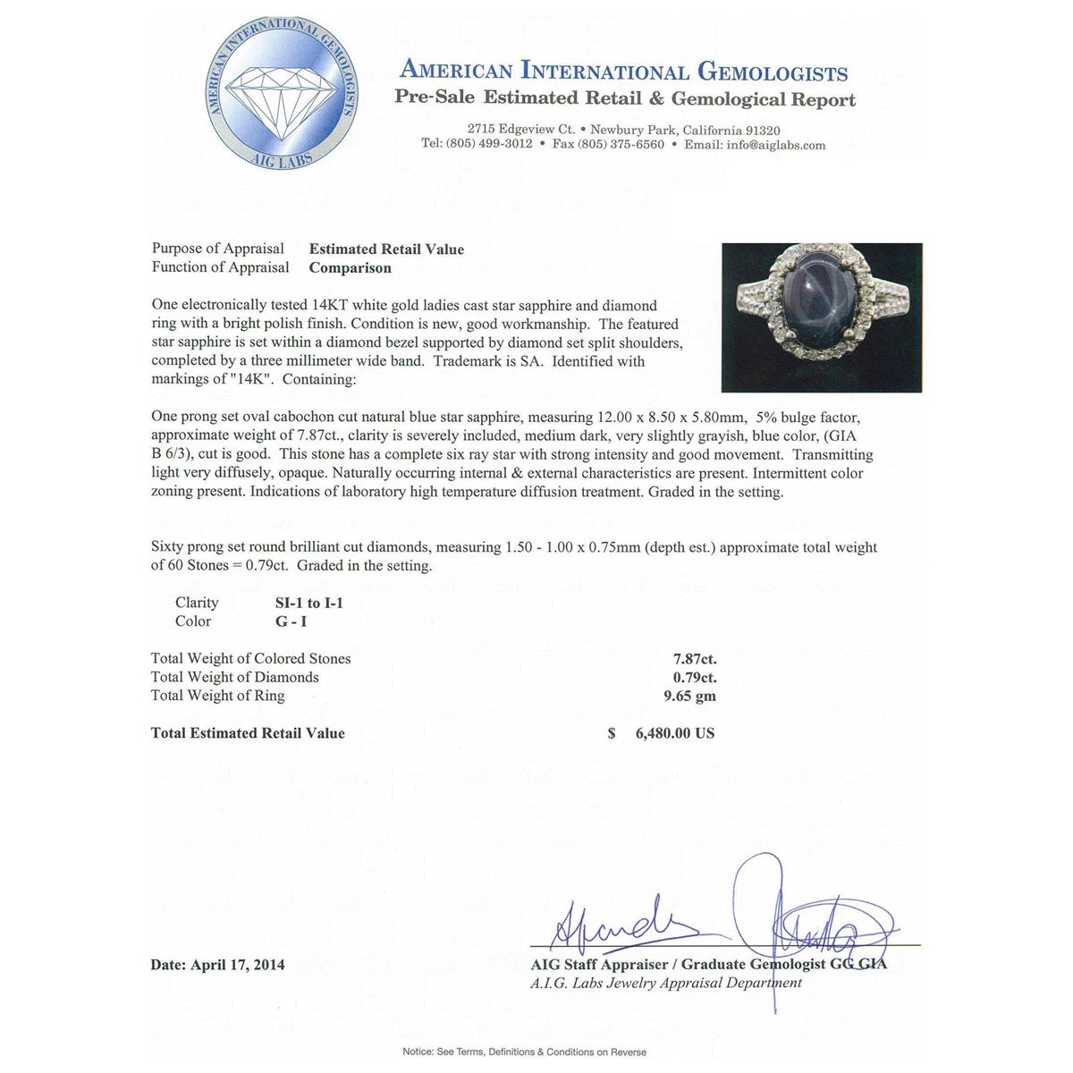 One electronically tested 14KT white gold ladies cast star sapphire and diamond ring with a bright polish finish. Condition is new, good workmanship. The featured star sapphire is set within a diamond bezel supported by diamond set split shoulders, completed by a three millimeter wide band. Trademark is SA. Identified with markings of "14K". Containing: One prong set oval cabochon cut natural blue star sapphire, measuring 12.00 x 8.50 x 5.80mm, 5%. bulge factor, approximate weight of 7.87ct., clarity is severely included, medium dark, very slightly grayish, blue color, (GIA B 6/3), cut is good. This stone has a complete six ray star with strong intensity and good movement. Transmitting light very diffusely, opaque. Naturally occurring internal & external characteristics are present. Intermittent color zoning present. Indications of laboratory high temperature diffusion treatment. Graded in the setting. Sixty prong set round brilliant cut diamonds, measuring 1.50 - 1.00 x 0.75mm (depth est.) approximate. Total Weight of 60 Stones = 0.79ct. Graded in the setting. Clarity: SI-1 to I-1. Color: G - I. Total Weight of Colored Stones 7.87ct. Total Weight of Diamonds 0.79ct. Total Weight of Ring 9.65 grams. AIG Appraised at $6,480.00.