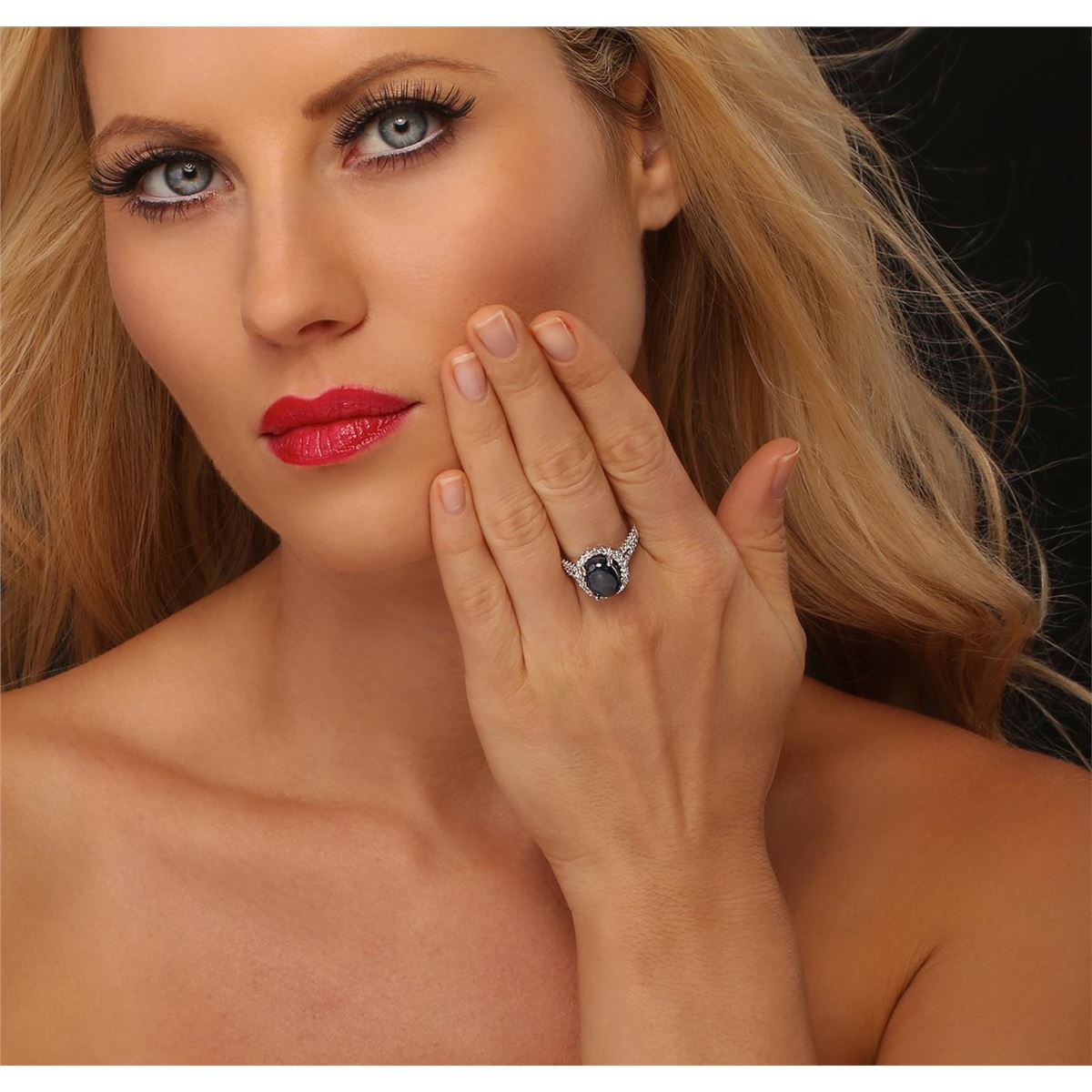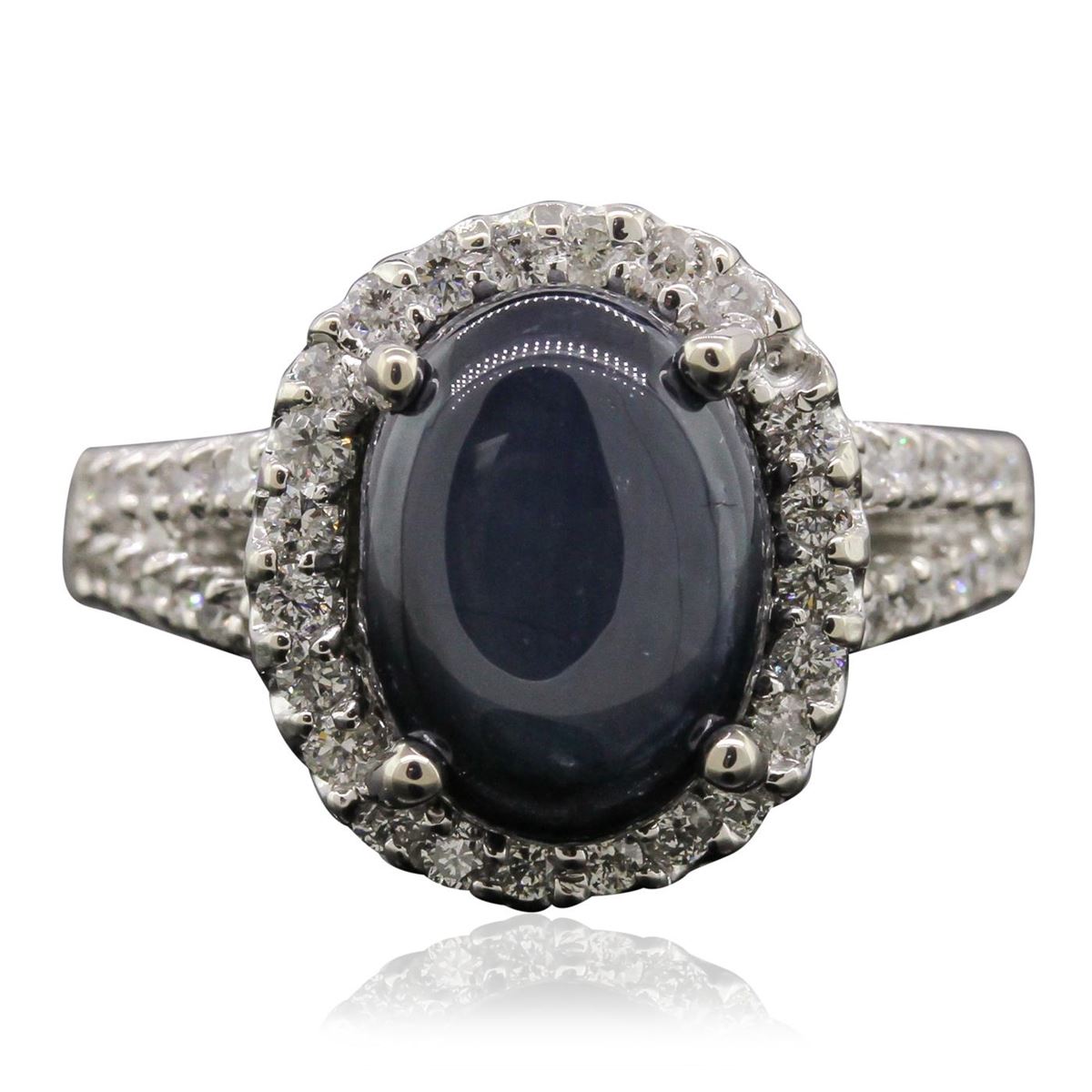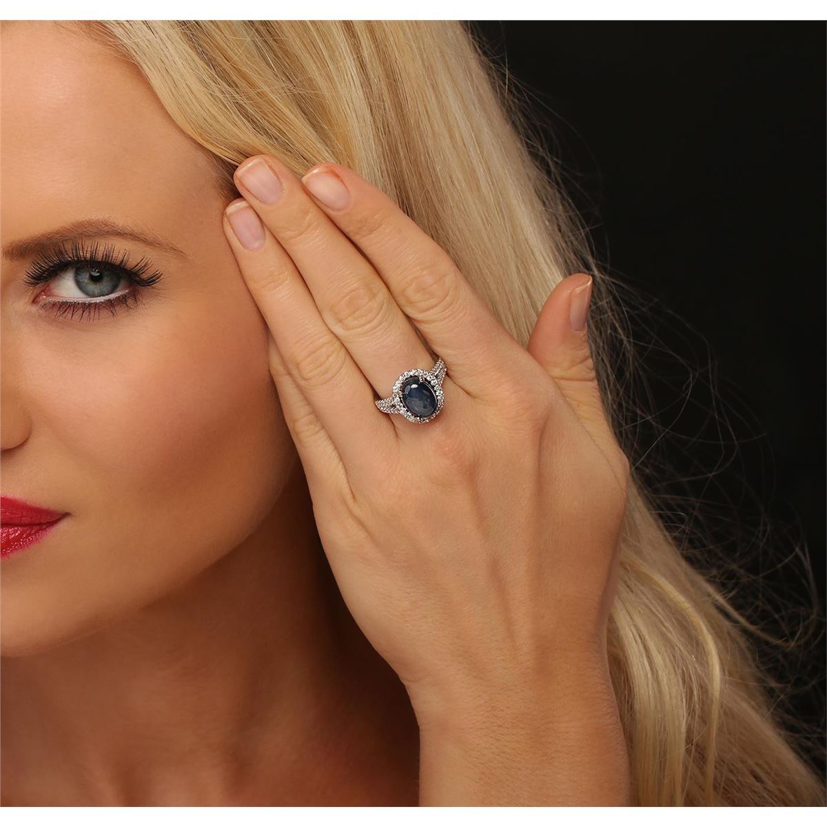 One electronically tested 14KT white gold ladies cast star sapphire and diamond ring with a bright polish finish. Condition is new, good workmanship. The featured star sapphire is set within a diamond bezel supported by diamond set split shoulders, completed by a three millimeter wide band. Trademark is SA. Identified with markings of "14K". Containing: One prong set oval cabochon cut natural blue star sapphire, measuring 12.00 x 8.50 x 5.80mm, 5%. bulge factor, approximate weight of 7.87ct., clarity is severely included, medium dark, very slightly grayish, blue color, (GIA B 6/3), cut is good. This stone has a complete six ray star with strong intensity and good movement. Transmitting light very diffusely, opaque. Naturally occurring internal & external characteristics are present. Intermittent color zoning present. Indications of laboratory high temperature diffusion treatment. Graded in the setting. Sixty prong set round brilliant cut diamonds, measuring 1.50 - 1.00 x 0.75mm (depth est.) approximate. Total Weight of 60 Stones = 0.79ct. Graded in the setting. Clarity: SI-1 to I-1. Color: G - I. Total Weight of Colored Stones 7.87ct. Total Weight of Diamonds 0.79ct. Total Weight of Ring 9.65 grams. AIG Appraised at $6,480.00.