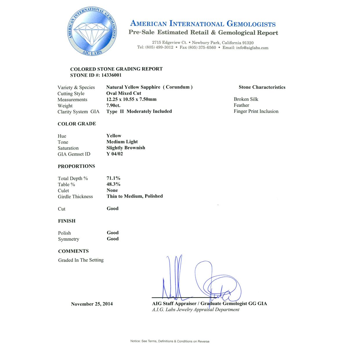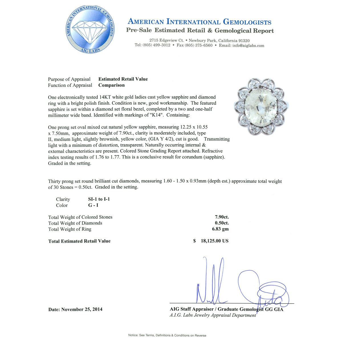 One electronically tested 14KT white gold ladies cast yellow sapphire and diamond ring with a bright polish finish. The featured sapphire is set within a diamond set floral bezel, completed by a two and one-half millimeter wide band. Identified with markings of "K14". Condition is new, good workmanship. Containing: One prong set oval mixed cut natural yellow sapphire, measuring 12.25 x 10.55 x 7.50mm, approximate weight of 7.90ct., clarity is moderately included, type II, medium light, slightly brownish, yellow color, (GIA Y 4/2), cut is good. Transmitting light with a minimum of distortion, transparent. Naturally occurring internal & external characteristics are present. Colored Stone Grading Report attached. Refractive index testing results of 1.76 to 1.77. This is a conclusive result for corundum (sapphire).Graded in the setting. Thirty prong set round brilliant cut diamonds, measuring 1.60 - 1.50 x 0.93mm (depth est.) approximate total weight of 30 Stones = 0.50ct. Graded in the setting. Clarity: SI-1 to I-1. Color: G - I. Total Weight of Colored Stones 7.90ct. Total Weight of Diamonds 0.50ct. Total Weight of Ring 6.83 grams. AIG Appraised at $18,125.00.