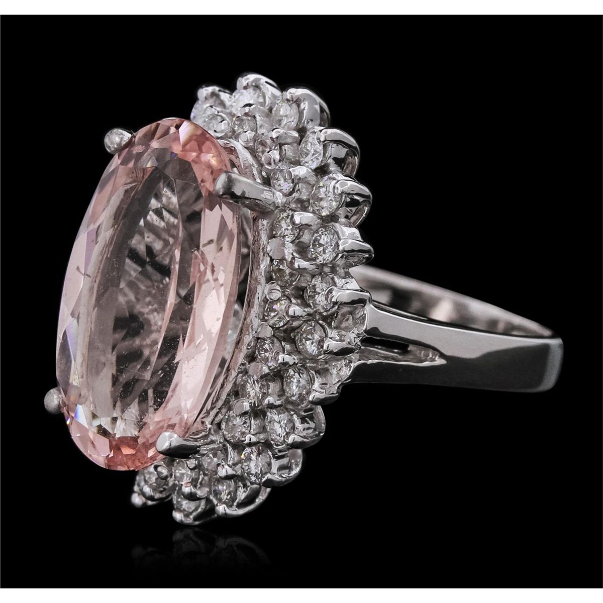 One electronically tested 14KT white gold ladies cast morganite & diamond ring with a bright finish. The featured morganite is set within a tiered diamond bezel, supported by a ribbed under gallery, completed by a two and one half millimeter wide band. Identified with markings of "14K". Condition is new, good workmanship. Containing: One prong set oval mixed cut natural morganite, measuring 18.00 x 11.00 x 6.30mm, 10% bulge factor, approximate weight of 7.90ct., clarity is slightly included, type I, light, slightly brownish, orangy red color, (GIA oR 3/2), cut is good. Refractive index testing results of 1.58 to 1.59. This is a conclusive result for Morganite. Transmitting light with no distortion, transparent. Naturally occurring internal characteristics are present. Colored Stone Grading Report attached. Graded in the setting. Forty-Four prong set round brilliant cut diamonds, measuring 2.00 - 1.70 x 1.11mm (depth est.) approximate total weight of 44 Stones = 1.08ct. The color grade reflects the overall average for the group. Graded in the setting. Clarity: SI-1 to I-1. Color: G - I. Total Weight of Colored Stones 7.90ct. Total Weight of Diamonds 1.08ct. Total Weight of Ring 10.90 grams. AIG Appraised at $10,400.00.
