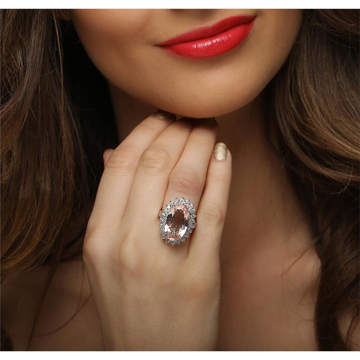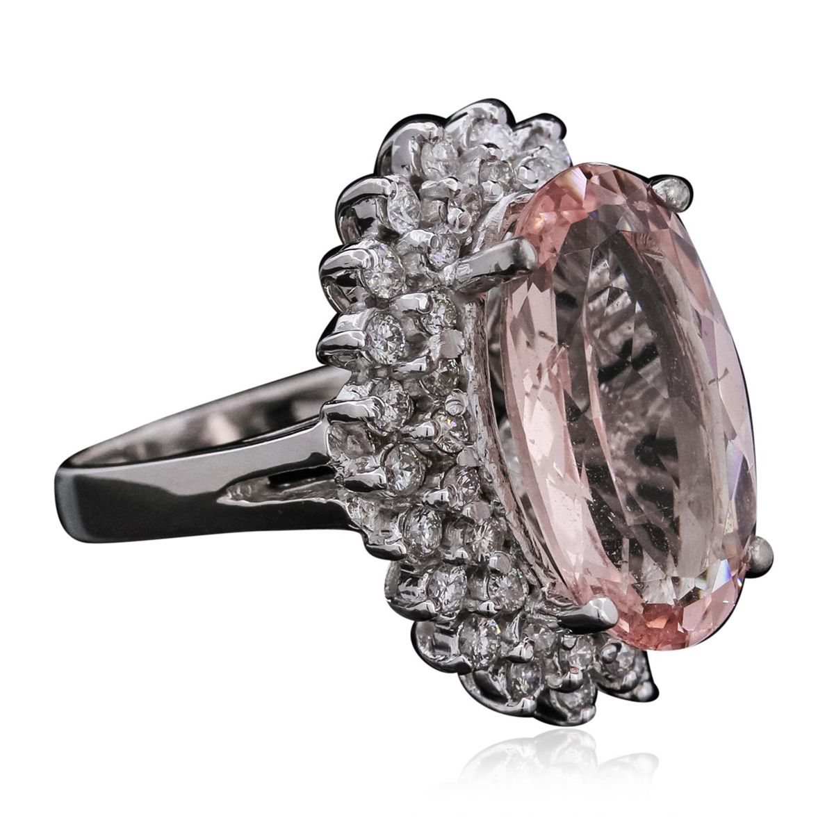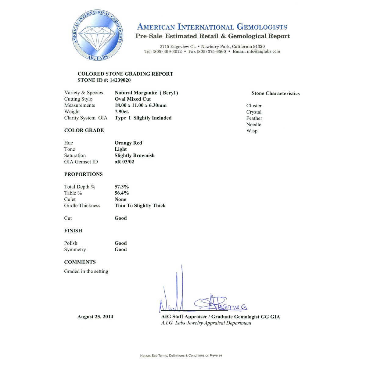 One electronically tested 14KT white gold ladies cast morganite & diamond ring with a bright finish. The featured morganite is set within a tiered diamond bezel, supported by a ribbed under gallery, completed by a two and one half millimeter wide band. Identified with markings of "14K". Condition is new, good workmanship. Containing: One prong set oval mixed cut natural morganite, measuring 18.00 x 11.00 x 6.30mm, 10% bulge factor, approximate weight of 7.90ct., clarity is slightly included, type I, light, slightly brownish, orangy red color, (GIA oR 3/2), cut is good. Refractive index testing results of 1.58 to 1.59. This is a conclusive result for Morganite. Transmitting light with no distortion, transparent. Naturally occurring internal characteristics are present. Colored Stone Grading Report attached. Graded in the setting. Forty-Four prong set round brilliant cut diamonds, measuring 2.00 - 1.70 x 1.11mm (depth est.) approximate total weight of 44 Stones = 1.08ct. The color grade reflects the overall average for the group. Graded in the setting. Clarity: SI-1 to I-1. Color: G - I. Total Weight of Colored Stones 7.90ct. Total Weight of Diamonds 1.08ct. Total Weight of Ring 10.90 grams. AIG Appraised at $10,400.00.