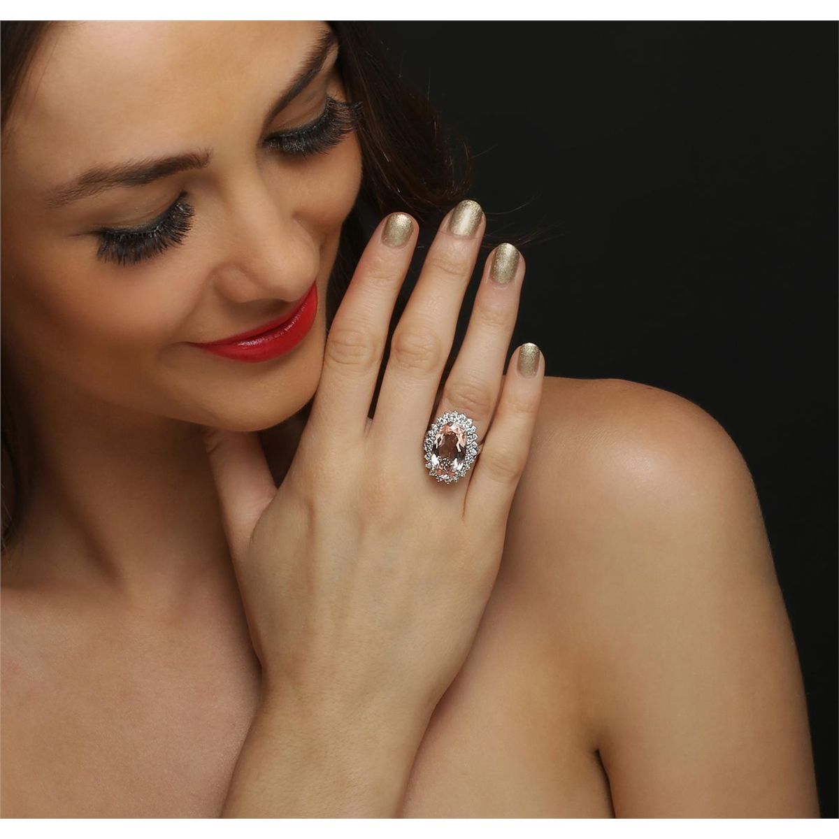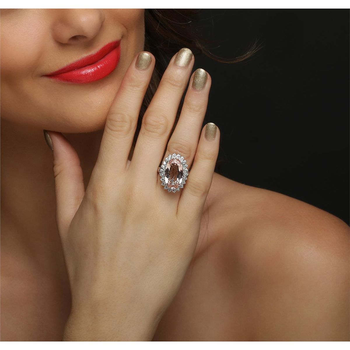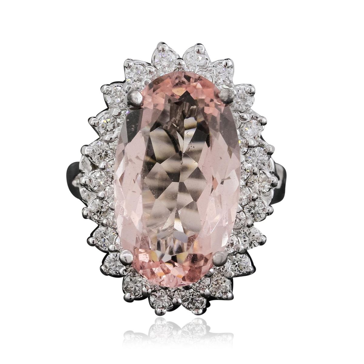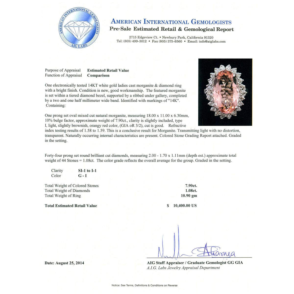 One electronically tested 14KT white gold ladies cast morganite & diamond ring with a bright finish. The featured morganite is set within a tiered diamond bezel, supported by a ribbed under gallery, completed by a two and one half millimeter wide band. Identified with markings of "14K". Condition is new, good workmanship. Containing: One prong set oval mixed cut natural morganite, measuring 18.00 x 11.00 x 6.30mm, 10% bulge factor, approximate weight of 7.90ct., clarity is slightly included, type I, light, slightly brownish, orangy red color, (GIA oR 3/2), cut is good. Refractive index testing results of 1.58 to 1.59. This is a conclusive result for Morganite. Transmitting light with no distortion, transparent. Naturally occurring internal characteristics are present. Colored Stone Grading Report attached. Graded in the setting. Forty-Four prong set round brilliant cut diamonds, measuring 2.00 - 1.70 x 1.11mm (depth est.) approximate total weight of 44 Stones = 1.08ct. The color grade reflects the overall average for the group. Graded in the setting. Clarity: SI-1 to I-1. Color: G - I. Total Weight of Colored Stones 7.90ct. Total Weight of Diamonds 1.08ct. Total Weight of Ring 10.90 grams. AIG Appraised at $10,400.00.