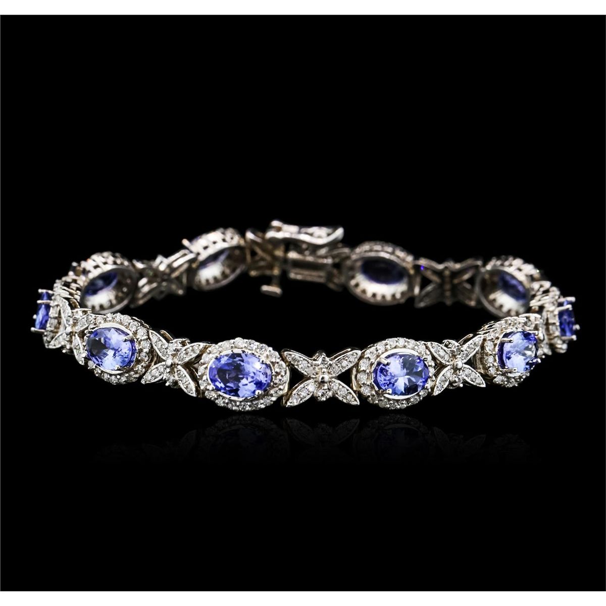 One electronically tested 14KT white gold ladies combination cast & assembled tanzanite and diamond bracelet with a bright polish finish. Measurements: 7.25" in length. Identified with markings of "14K". Condition is new. Containing: Ten prong set oval modified brilliant cut natural tanzanites, measuring 7.08 x 4.62 x 3.43mm, approximate total weight of 7.90ct., clarity is moderately included, type I, medium light, very slightly grayish, violet color, (GIA V 4/3), cut is good. Three Hundred Twenty-Four prong set round brilliant cut diamonds, measuring 1.10 - 1.10 x 0.66mm (depth est.) approximate total weight of 324 Stones = 1.56ct. Clarity: I-1 to I-2. Color: I - J, Cut is Good. Colored gemstones are presumed to have been subjected to commonly used enhancement processes. All diamonds and colored gemstones are graded in the mounting, unless otherwise stated. Total Weight of Colored Stones 7.90ct. Total Weight of Diamonds 1.56ct. Total Weight of Bracelet 17.40 grams. GGL Appraised at $9,680.00.