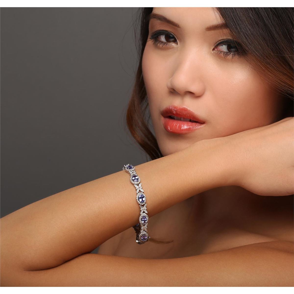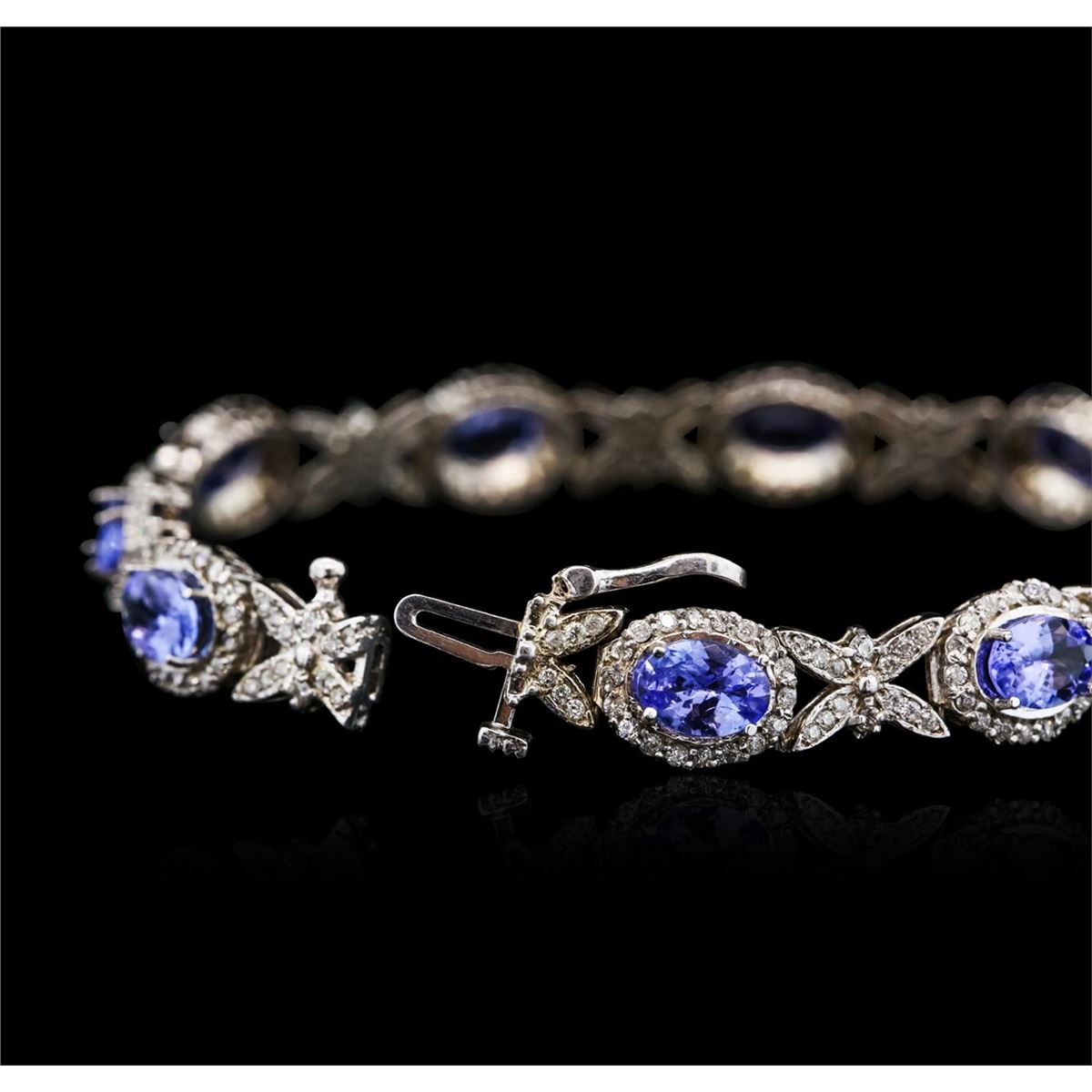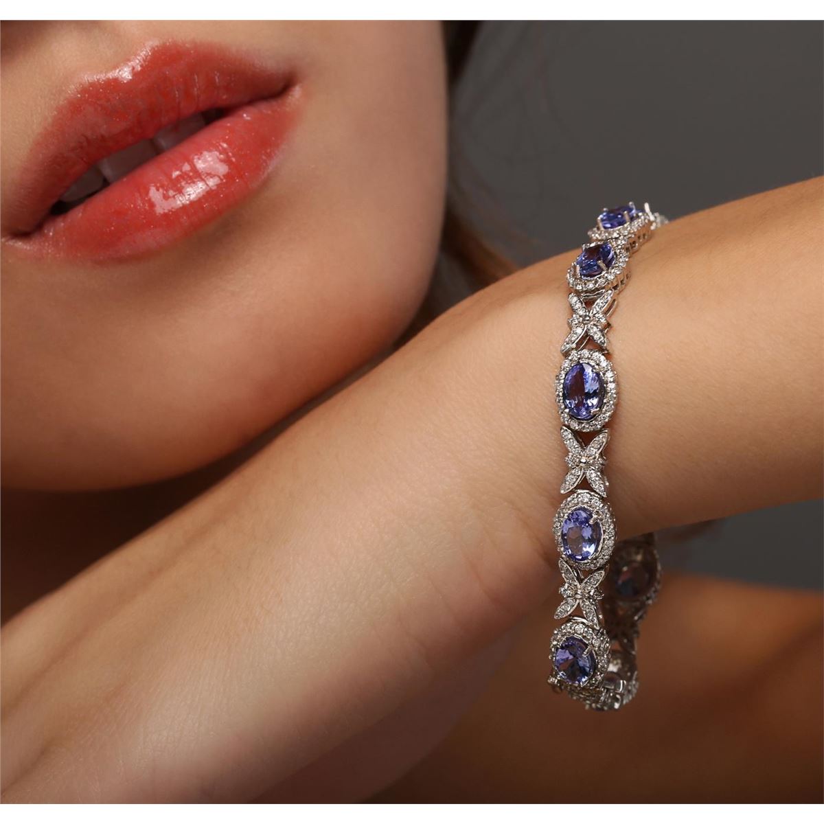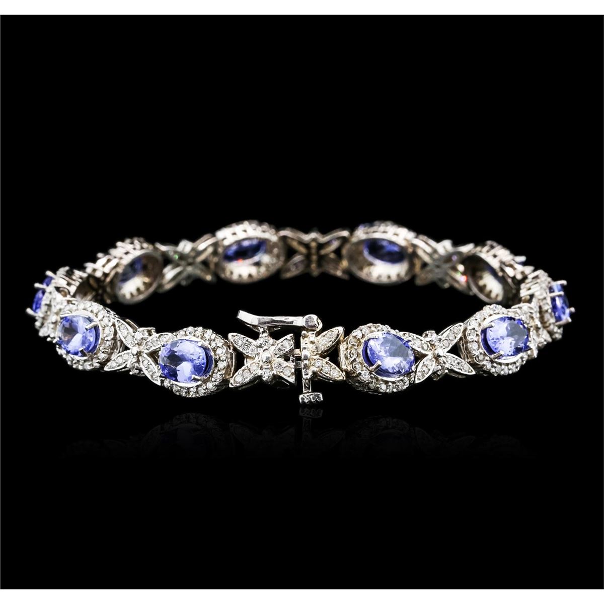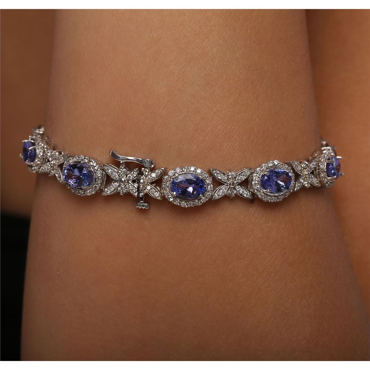 One electronically tested 14KT white gold ladies combination cast & assembled tanzanite and diamond bracelet with a bright polish finish. Measurements: 7.25" in length. Identified with markings of "14K". Condition is new. Containing: Ten prong set oval modified brilliant cut natural tanzanites, measuring 7.08 x 4.62 x 3.43mm, approximate total weight of 7.90ct., clarity is moderately included, type I, medium light, very slightly grayish, violet color, (GIA V 4/3), cut is good. Three Hundred Twenty-Four prong set round brilliant cut diamonds, measuring 1.10 - 1.10 x 0.66mm (depth est.) approximate total weight of 324 Stones = 1.56ct. Clarity: I-1 to I-2. Color: I - J, Cut is Good. Colored gemstones are presumed to have been subjected to commonly used enhancement processes. All diamonds and colored gemstones are graded in the mounting, unless otherwise stated. Total Weight of Colored Stones 7.90ct. Total Weight of Diamonds 1.56ct. Total Weight of Bracelet 17.40 grams. GGL Appraised at $9,680.00.