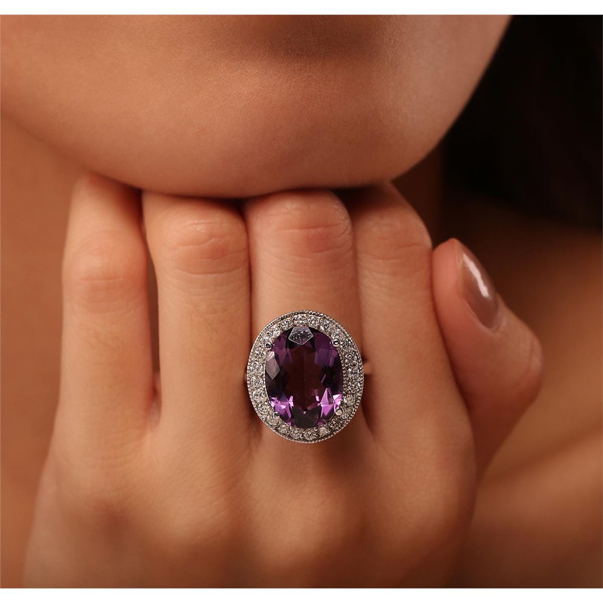 One electronically tested 14KT white gold Ladies combination cast & assembled ring with a bright polish finish. Condition is new. Identified with markings of "K14". Containing: One prong set oval modified brilliant cut natural amethyst, measuring 15.90 x 12.10 x 7.60mm, approximate weight of 7.92ct., clarity is eye clean, type II, medium, very slightly grayish, purple color, (GIA P 5/3), cut is good. Colored gemstones are presumed to have been subjected to commonly used color/clarity enhancement processes. Twenty-Four prong set round brilliant cut diamonds, measuring 2.00 - 2.00 x 1.20mm (depth est.) approximate. Total Weight of 24 Stones = 0.70ct. Clarity: SI-2 to I-1. Color: I - J, Cut is Good. Total Weight of Colored Stones 7.92ct. Total Weight of Diamonds 0.70ct. Total Weight of Ring 8.30 grams. GGL Appraised at $5,775.00.
