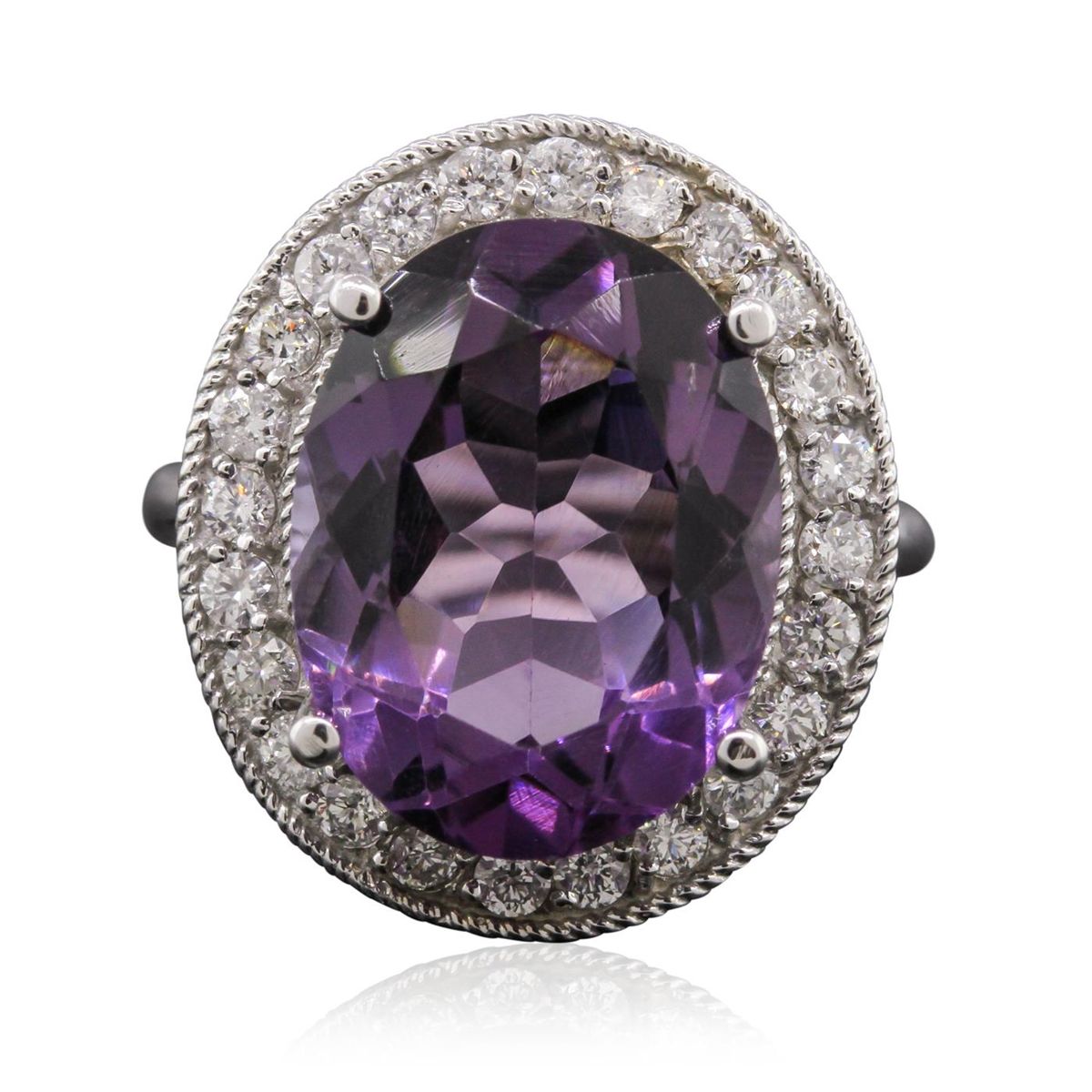 One electronically tested 14KT white gold Ladies combination cast & assembled ring with a bright polish finish. Condition is new. Identified with markings of "K14". Containing: One prong set oval modified brilliant cut natural amethyst, measuring 15.90 x 12.10 x 7.60mm, approximate weight of 7.92ct., clarity is eye clean, type II, medium, very slightly grayish, purple color, (GIA P 5/3), cut is good. Colored gemstones are presumed to have been subjected to commonly used color/clarity enhancement processes. Twenty-Four prong set round brilliant cut diamonds, measuring 2.00 - 2.00 x 1.20mm (depth est.) approximate. Total Weight of 24 Stones = 0.70ct. Clarity: SI-2 to I-1. Color: I - J, Cut is Good. Total Weight of Colored Stones 7.92ct. Total Weight of Diamonds 0.70ct. Total Weight of Ring 8.30 grams. GGL Appraised at $5,775.00.
