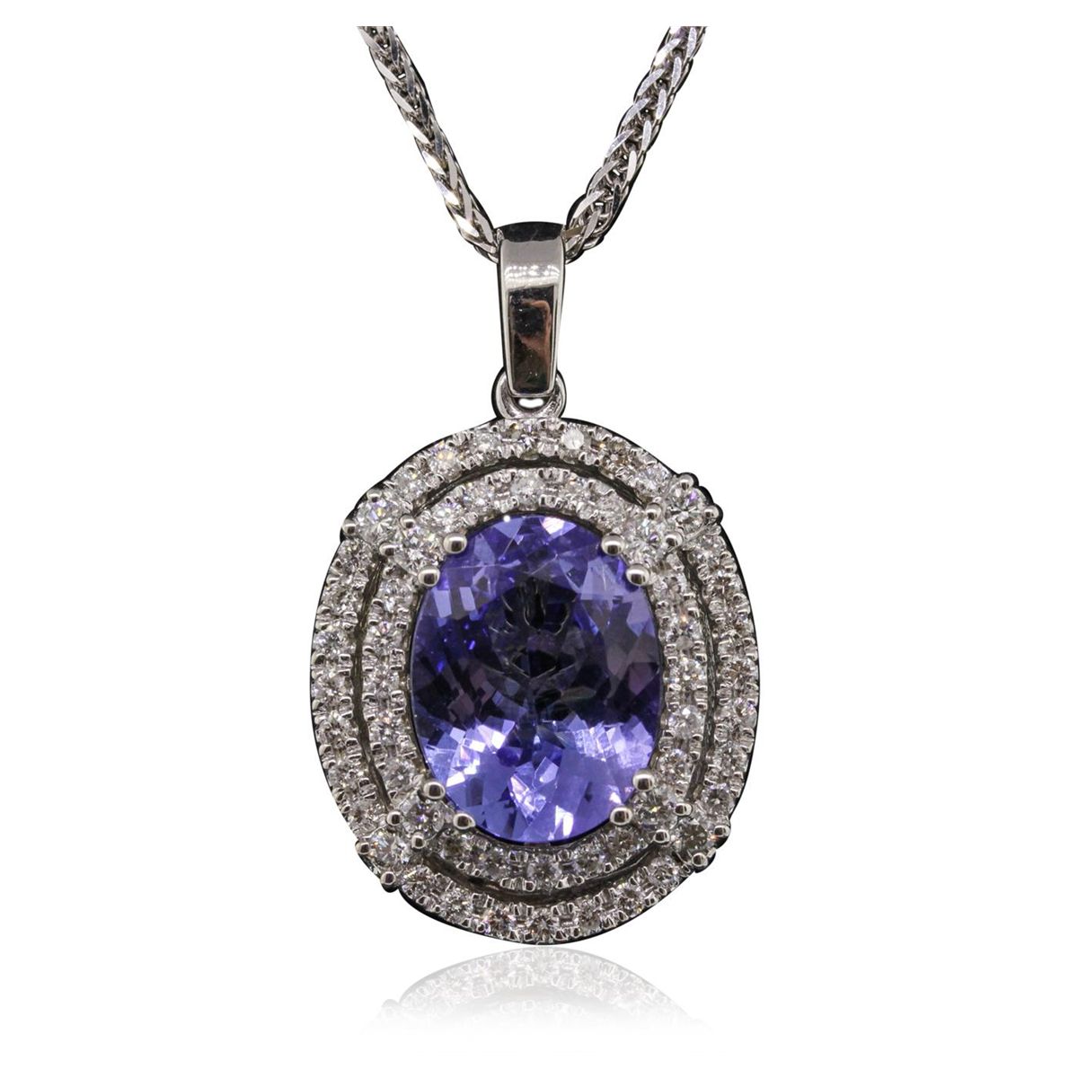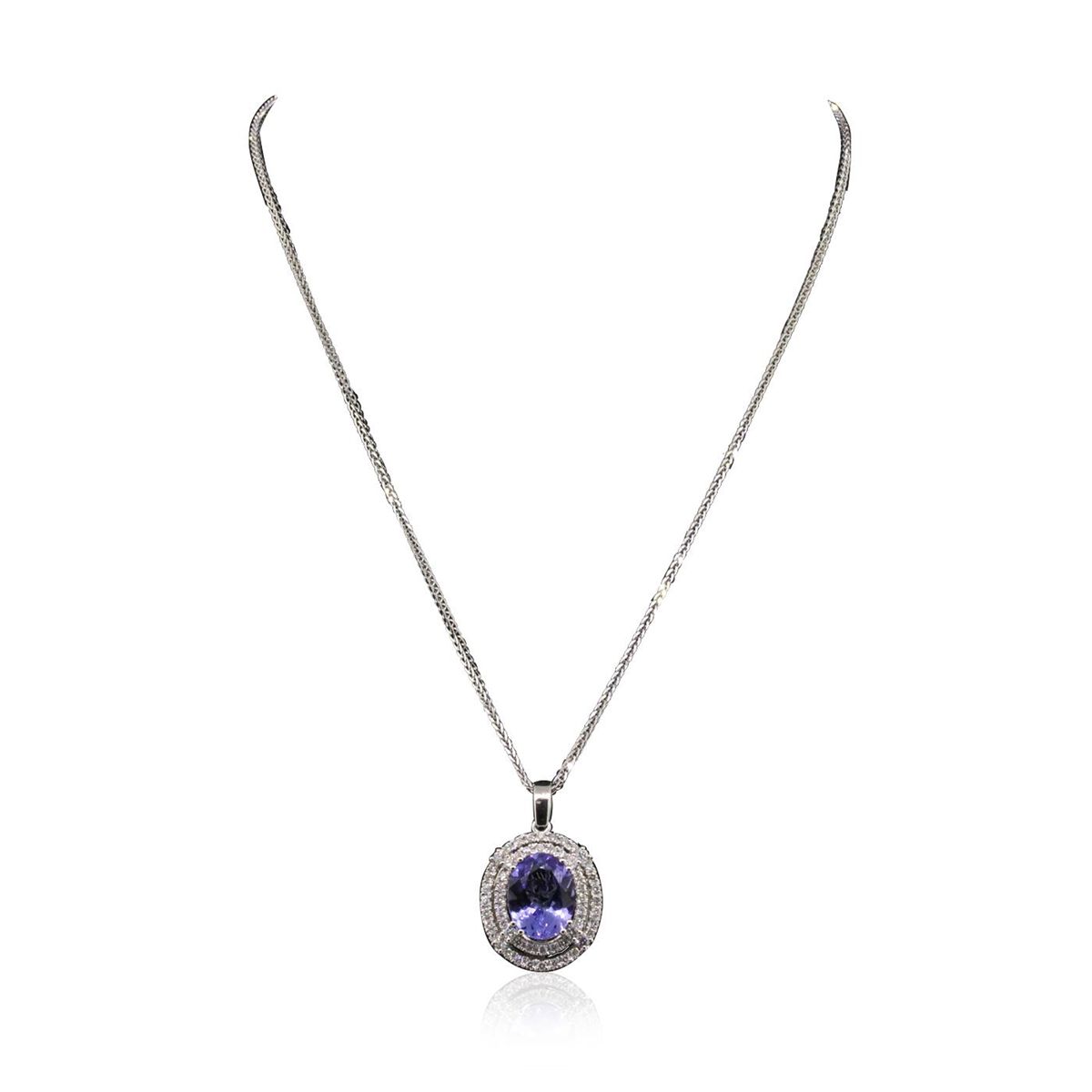 One electronically tested 14KT white gold ladies combination cast & assembled pendant & chain 17.0" long, medium cable link with a lobster claw clasp with a bright polish finish. Condition is new. Identified with markings of "14K". Containing: One prong set oval modified brilliant cut natural tanzanite, measuring 14.52 x 11.13 x 7.23mm, approximate weight of 7.97ct., clarity is eye clean, type I, medium light, very slightly grayish, bluish violet color, (GIA bV 4/3), cut is good. Eight prong set round brilliant cut diamonds, measuring 1.90 - 1.90 x 1.14mm (depth est.) approximate. Total Weight of 8 Stones = 0.20ct. Clarity: SI-1 to SI-2. Color: I - J, Cut is Good. Forty-Eight prong set round brilliant cut diamonds, measuring 1.50 - 1.50 x 0.90mm (depth est.) approximate. Total Weight of 48 Stones = 0.59ct. Clarity: SI-2 to I-1. Color: I - J, Cut is Good. Colored gemstones are presumed to have been subjected to commonly used enhancement processes. All diamonds and colored gemstones are graded in the mounting, unless otherwise stated. Total Weight of Colored Stones 7.97ct. Total Weight of Diamonds 0.79ct. Total Weight of Pendant & Chain 13.30 grams. GGL Appraised at $17,110.00.