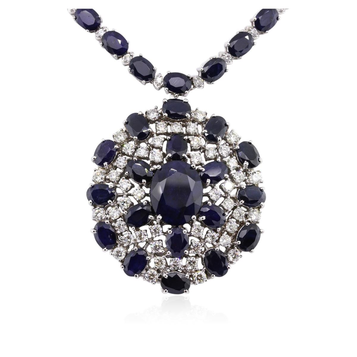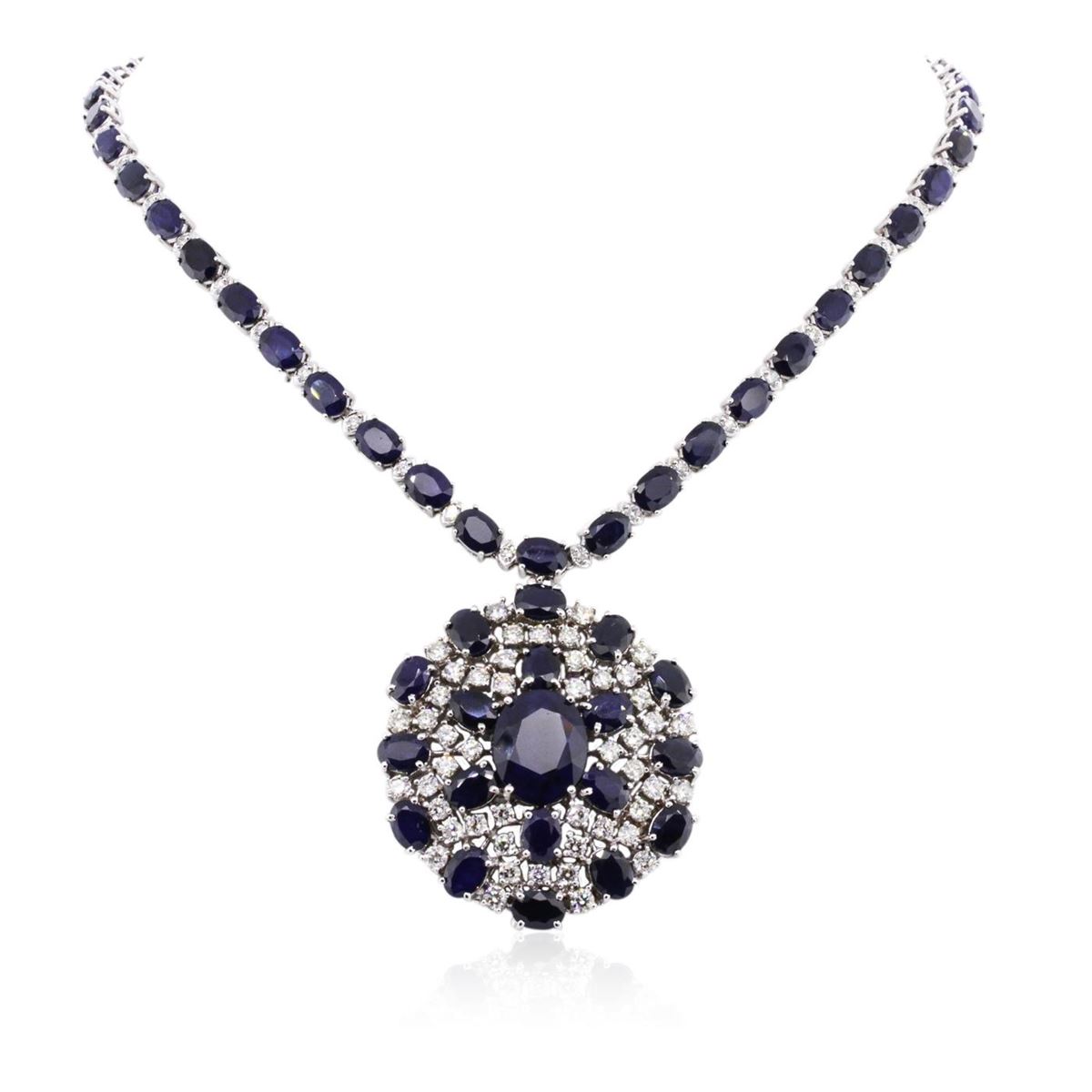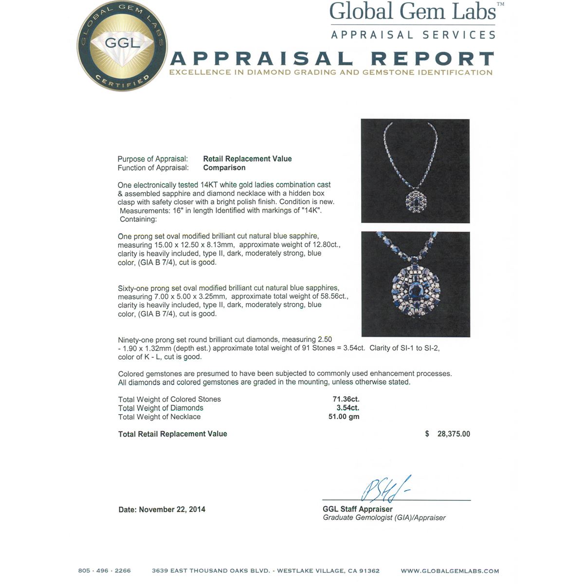 One electronically tested 14KT white gold ladies combination cast & assembled sapphire and diamond necklace with a hidden box clasp with safety closer with a bright polish finish. Measurements: 16" in length Identified with markings of "14K". Condition is new. Containing: One prong set oval modified brilliant cut natural blue sapphire, measuring 15.00 x 12.50 x 8.13mm, approximate weight of 12.80ct., clarity is heavily included, type II, dark, moderately strong, blue color, (GIA B 7/4), cut is good. Sixty-one prong set oval modified brilliant cut natural blue sapphires, measuring 7.00 x 5.00 x 3.25mm, approximate total weight of 58.56ct., clarity is heavily included, type II, dark, moderately strong, blue color, (GIA B 7/4), cut is good. Ninety-One prong set round brilliant cut diamonds, measuring 2.50 - 1.90 x 1.32mm (depth est.) approximate total weight of 91 Stones = 3.54ct. Clarity: SI-1 to SI-2. Color: K - L, Cut is Good. Colored gemstones are presumed to have been subjected to commonly used enhancement processes. All diamonds and colored gemstones are graded in the mounting, unless otherwise stated. Total Weight of Colored Stones 71.36ct. Total Weight of Diamonds 3.54ct. Total Weight of Necklace 51.00 grams. GGL Appraised at $28,375.00.