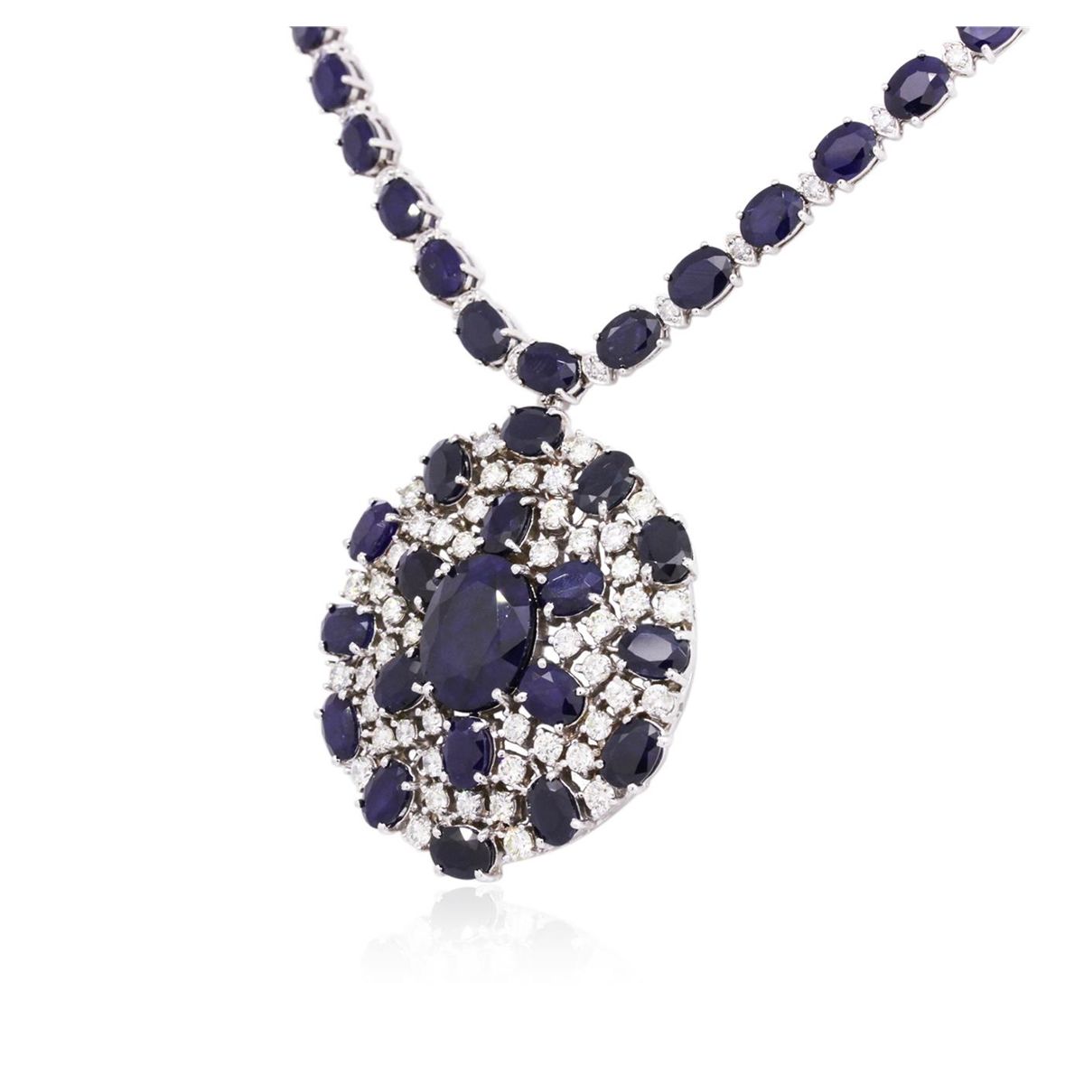 One electronically tested 14KT white gold ladies combination cast & assembled sapphire and diamond necklace with a hidden box clasp with safety closer with a bright polish finish. Measurements: 16" in length Identified with markings of "14K". Condition is new. Containing: One prong set oval modified brilliant cut natural blue sapphire, measuring 15.00 x 12.50 x 8.13mm, approximate weight of 12.80ct., clarity is heavily included, type II, dark, moderately strong, blue color, (GIA B 7/4), cut is good. Sixty-one prong set oval modified brilliant cut natural blue sapphires, measuring 7.00 x 5.00 x 3.25mm, approximate total weight of 58.56ct., clarity is heavily included, type II, dark, moderately strong, blue color, (GIA B 7/4), cut is good. Ninety-One prong set round brilliant cut diamonds, measuring 2.50 - 1.90 x 1.32mm (depth est.) approximate total weight of 91 Stones = 3.54ct. Clarity: SI-1 to SI-2. Color: K - L, Cut is Good. Colored gemstones are presumed to have been subjected to commonly used enhancement processes. All diamonds and colored gemstones are graded in the mounting, unless otherwise stated. Total Weight of Colored Stones 71.36ct. Total Weight of Diamonds 3.54ct. Total Weight of Necklace 51.00 grams. GGL Appraised at $28,375.00.