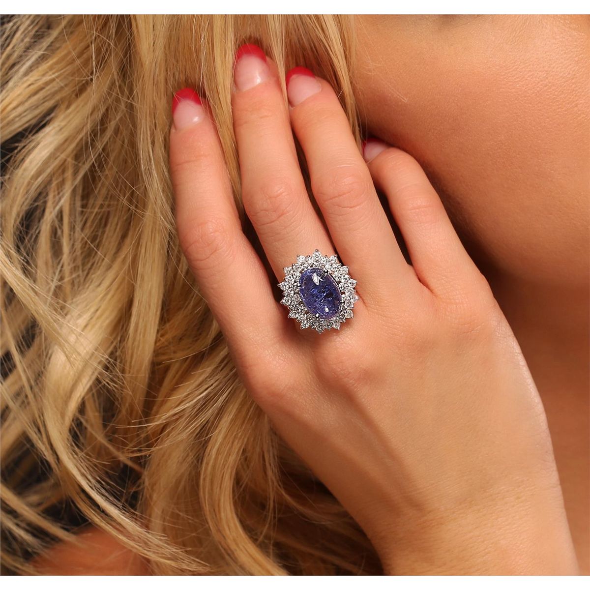 One electronically tested 14KT white gold ladies cast tanzanite and diamond ring with a bright polish finish. The featured tanzanite is set within a two tiered diamond lattice gallery, completed by a two and one-half millimeter wide band. Identified with markings of "K14". Condition is new, good workmanship. Containing: One prong set oval cabochon cut natural tanzanite, measuring 15.00 x 10.35 x 5.90mm, approximate weight of 8.00ct., clarity is severely included, type I, medium, very slightly grayish, violet color, (GIA V 5/3), cut is good. Transmitting light somewhat diffusely, transparent to translucent. Naturally occurring internal & external characteristics are present. Colored Stone Grading Report attached. Graded in the setting. Tanzanite is a very rare gemstone that is only found in the country of Tanzania. Originally discovered in 1967. Tiffany & Company, named the stone Tanzanite. It is found in the Usumburu Mountains that border the Umba Valley of northern Tanzania. Tanzanite occurs in gray, brown, violet, blue, reddish-purple, & green. The gem is interesting because of its exceptional pleochroism. Rotated in different directions a tanzanite will exhibit multiple changes of color. Tanzanite has a low tolerance to ultrasonic cleaning, and should not be cleaned using this method. Forty-Two prong set round brilliant cut diamonds, measuring 2.40 - 2.40 x 1.44mm (depth est.) approximate. Total Weight of 42 Stones = 2.26ct. Graded in the setting. Clarity: SI-2 to I-2. Color: G - I. Total Weight of Colored Stones 8.00ct. Total Weight of Diamonds 2.26ct. AIG Appraised at $12,560.00.