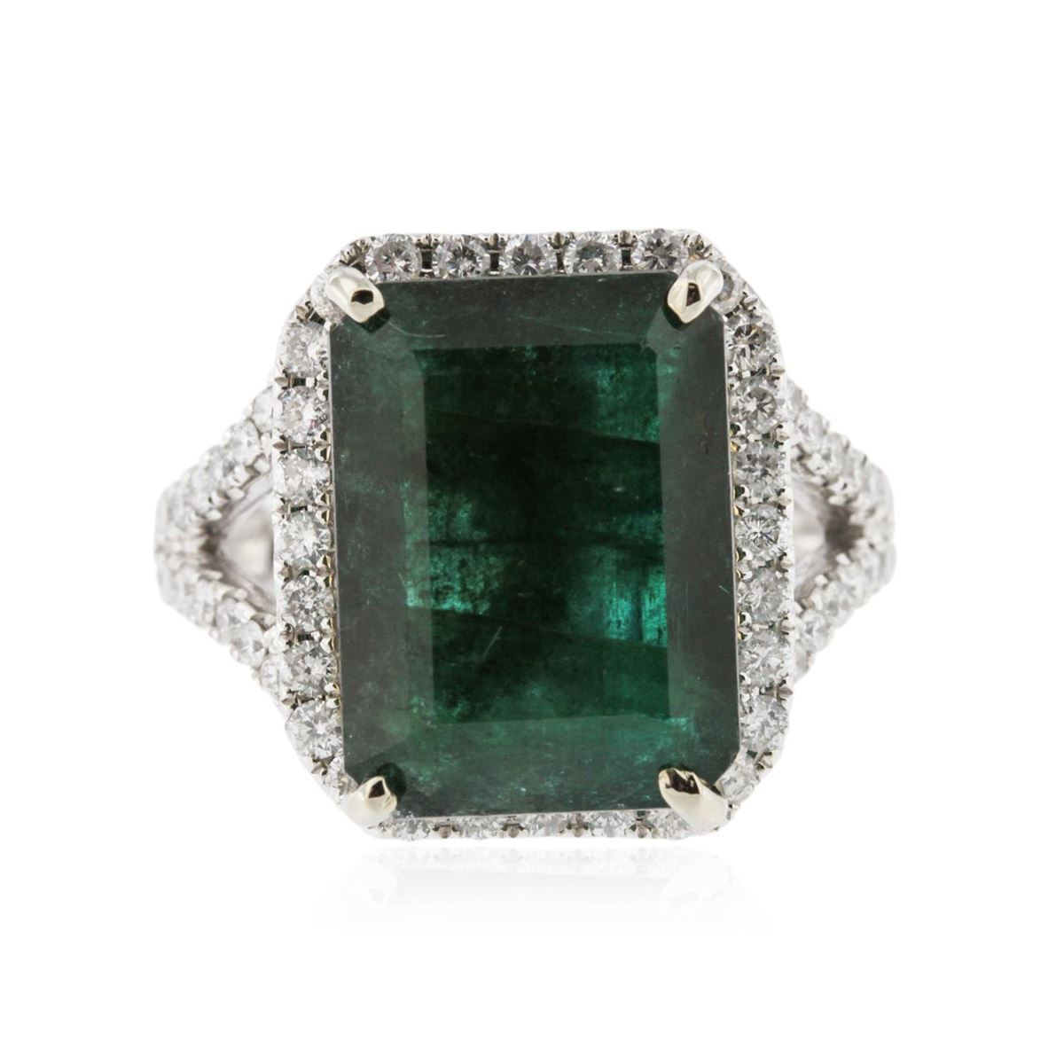 One electronically tested 14KT white ladies cast emerald and diamond ring with a bright polish finish. Condition is new, good workmanship. The featured emerald is set within a diamond bezel supported by diamond set split shoulders, completed by a four millimeter wide band. Identified with markings of "14K". Containing: One prong set rectangular step cut natural emerald, measuring 15.00 x 11.10 x 5.70mm, 5% bulge factor, approximate weight of 8.01ct., clarity is heavily included, type III, dark, very slightly grayish, very strongly bluish green color, (GIA vstbG 7/3), cut is good. Transmitting light somewhat diffusely, translucent. Naturally occurring internal & external characteristics are present. Indications of oil, & opticon residue. Colored Stone Grading Report attached. Graded in the setting. Fifty-six prong set round brilliant cut diamonds, measuring 1.70 - 1.40 x 0.93mm (depth est.) approximate total weight of 56 Stones = 0.89ct. Graded in the setting. Clarity I-1 to 1-2. Color G - I. Total Weight of Colored Stones 8.01ct. Total Weight of Diamonds 0.89ct. Total Weight of Ring 9.21gm. AIG Appraised at $6,165.00.